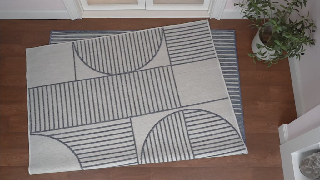 Our modern geometric rug is inspired by mid-century and Art Deco designs. It's made from durable polypropylene fibers woven into a reversible pattern of lines and circles. Use this stylish rug outdoors, or in the bedroom, living room or dining room.