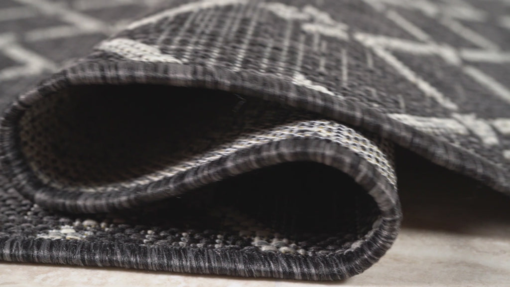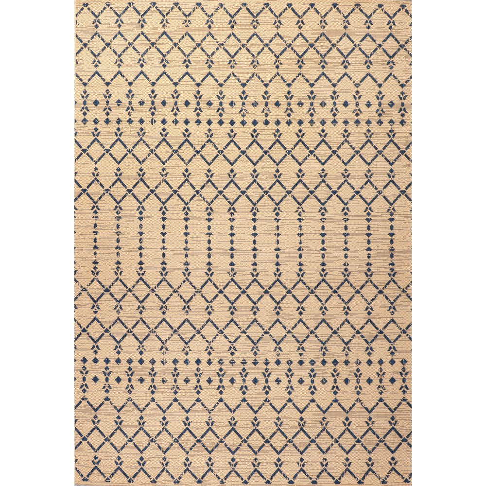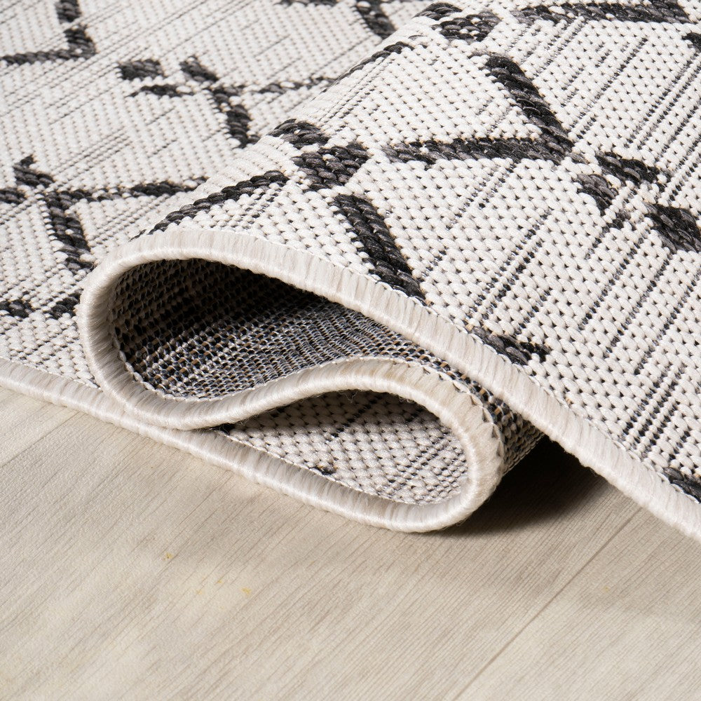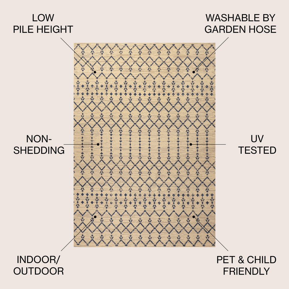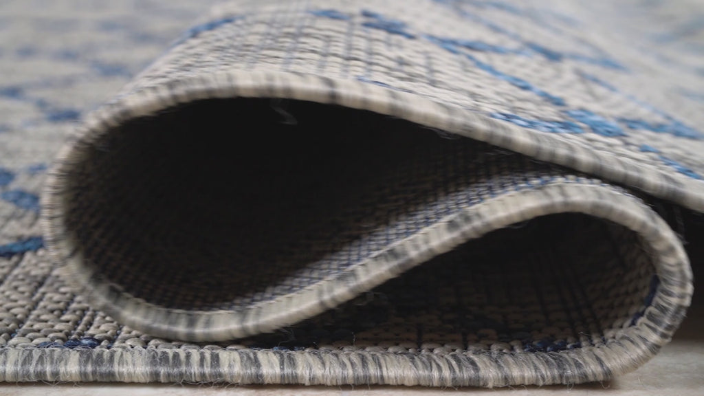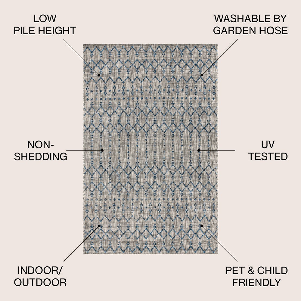 With its geometric design inspired by Moroccan tribal patterns, our Boho-chic rug adds eclectic style to an outdoor porch or patio. Varied tones of gray and ivory mingled with a deep blue pattern give this rug a hand-woven, vintage vibe. The flatweave design is great for high-traffic spaces indoors too.
