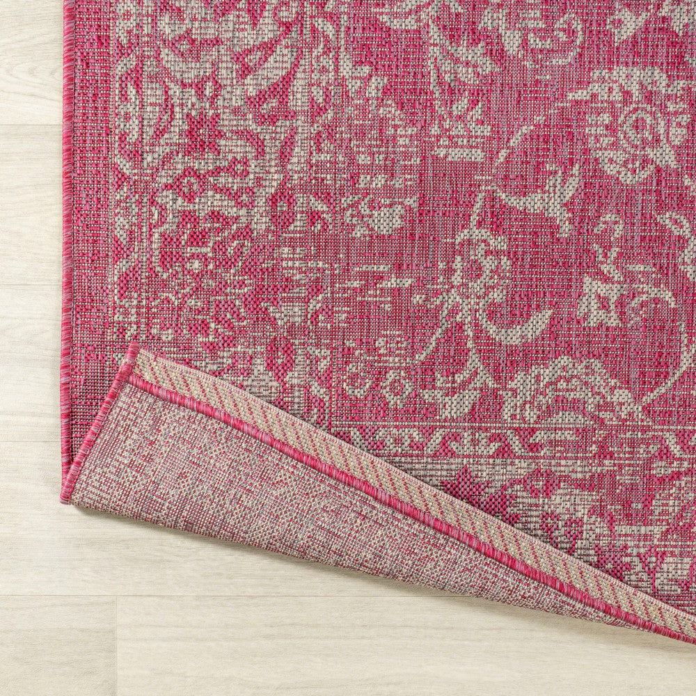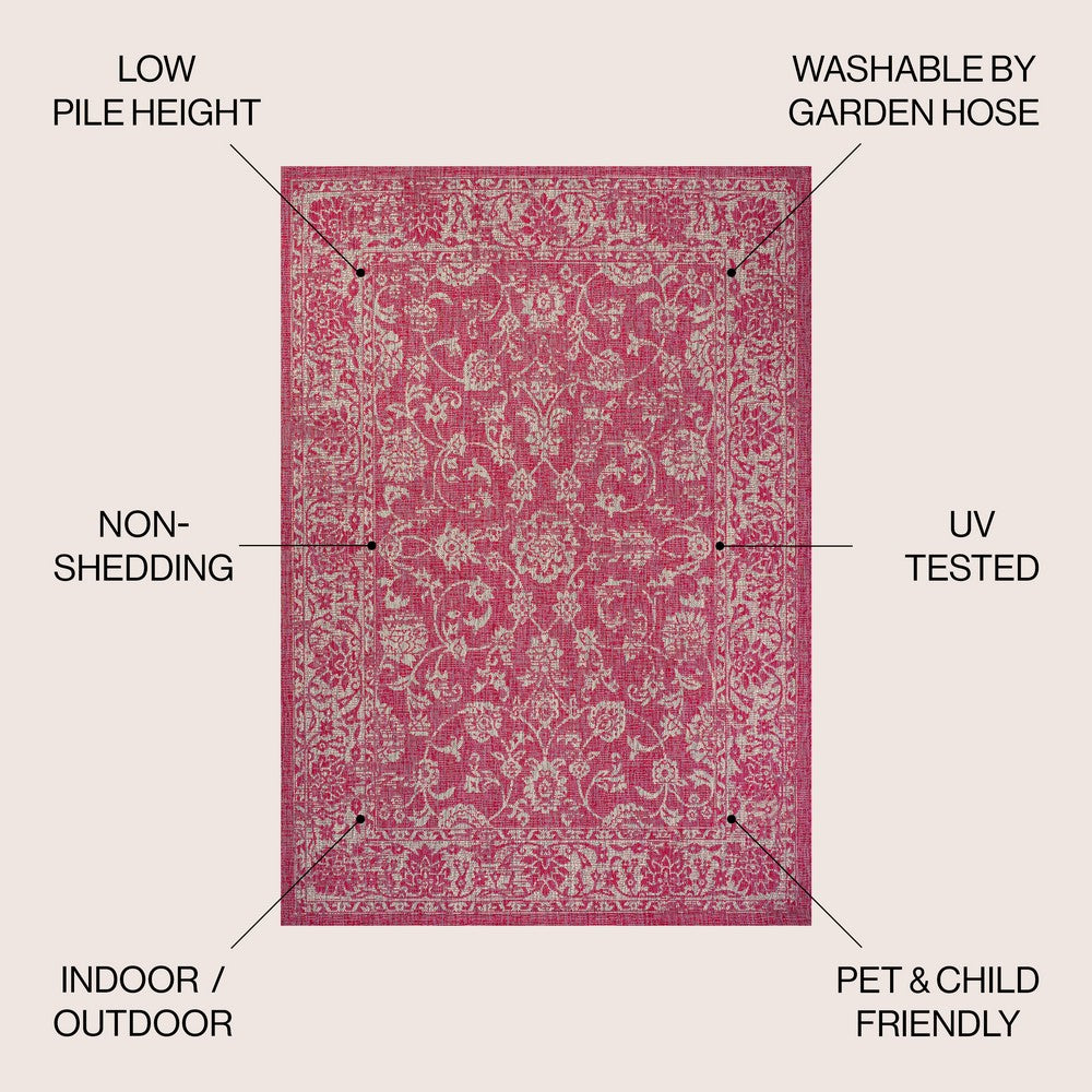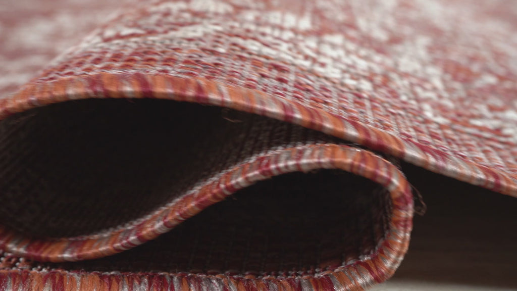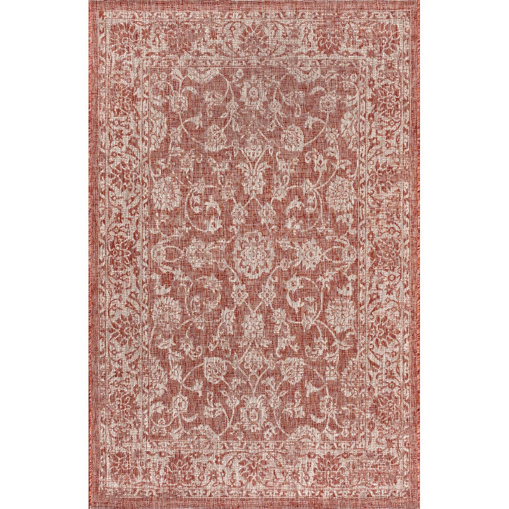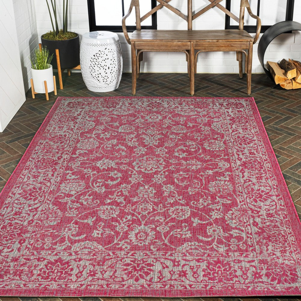 With a vine-and-border design inspired by Persian rugs, our Boho-chic rug adds eclectic style to an outdoor porch or patio. Varied tones of red and rust mingled with a taupe pattern give this rug a hand-woven, vintage vibe. The flatweave design is great for high-traffic spaces indoors too.
