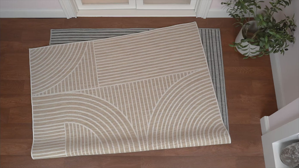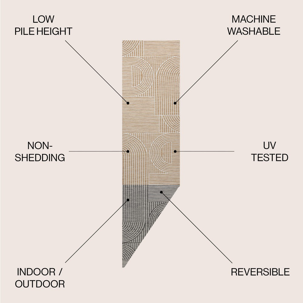 - Reversible design features different shades of cream and beige on one side and gray and black on the other