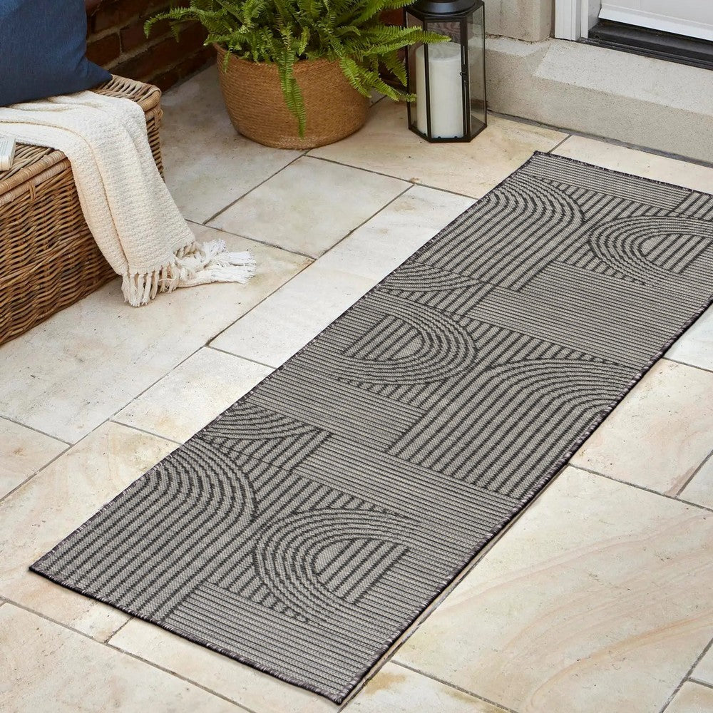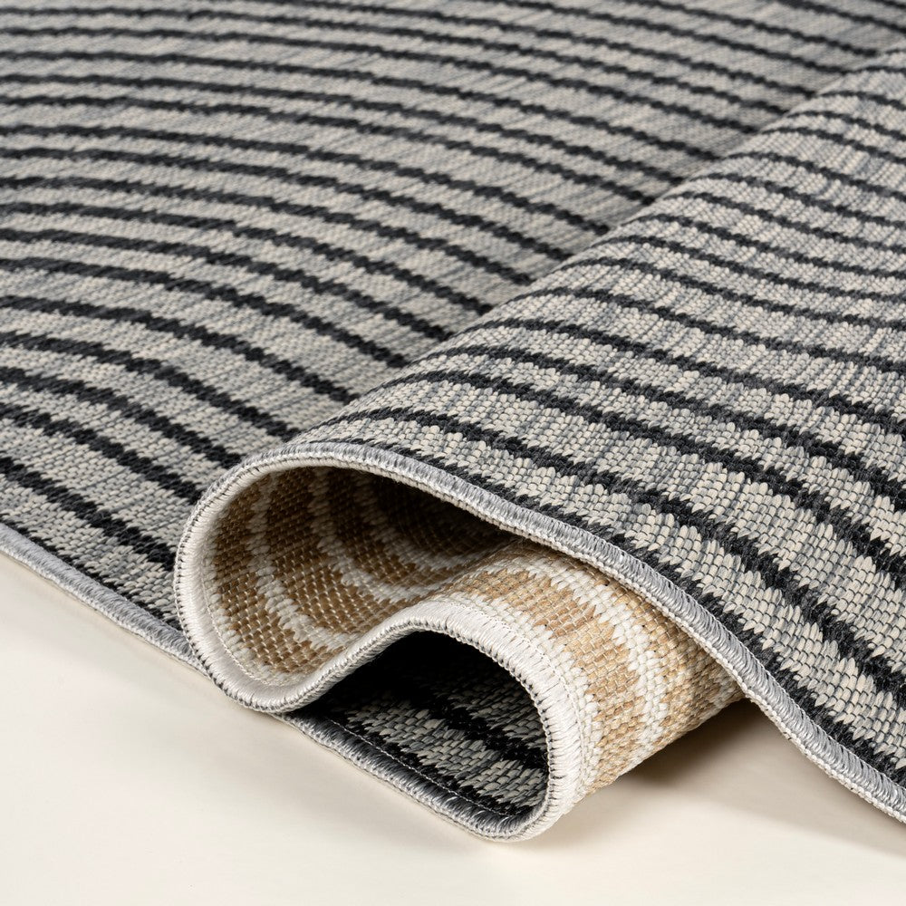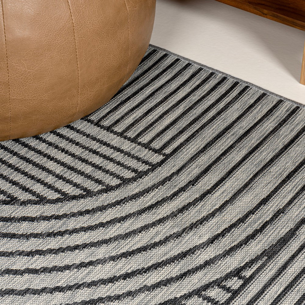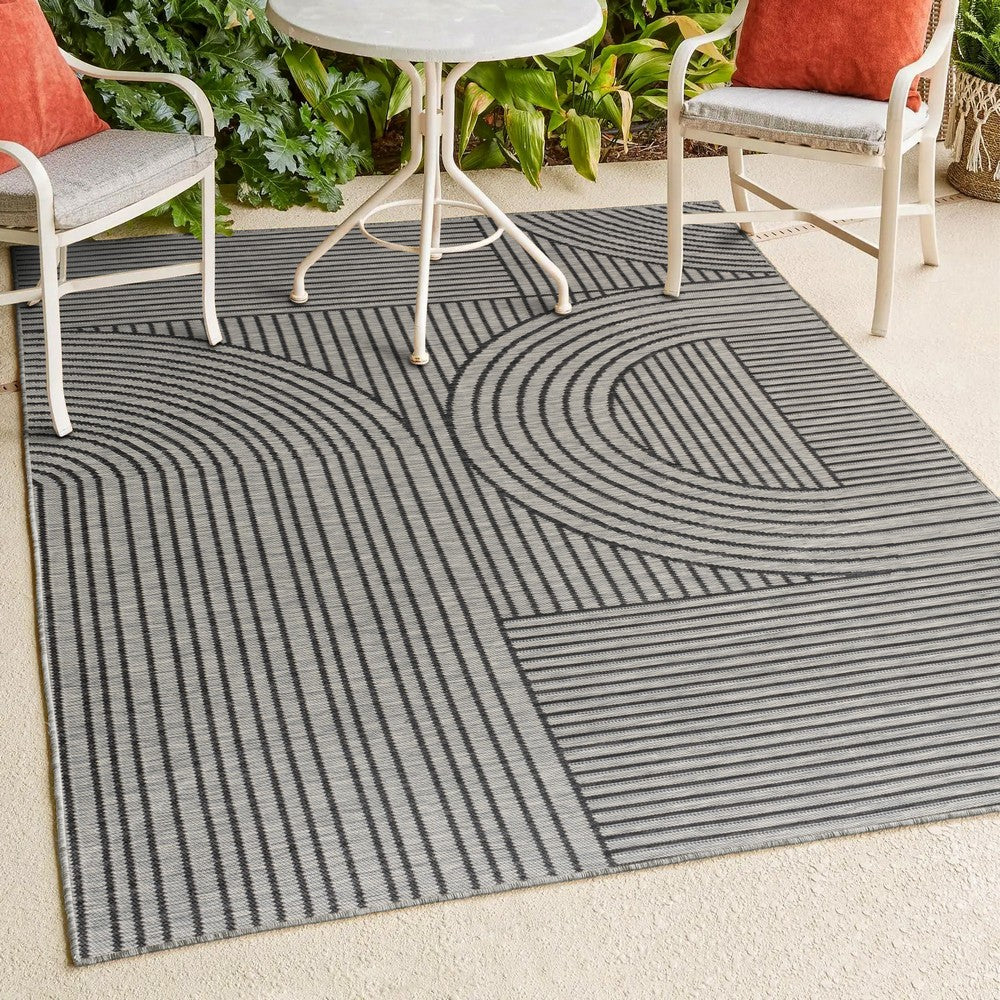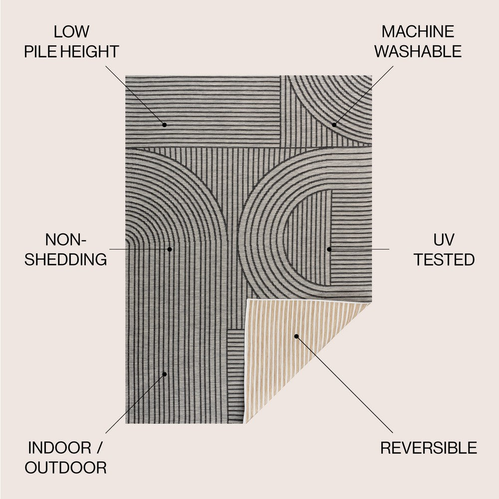 Our casual modern rug is inspired by mid-century Scandinavian designs. Durable polypropylene fibers are woven into a reversible arch and stripe pattern. Use this stylish geometric rug outdoors, or in the bedroom, living room or dining room.