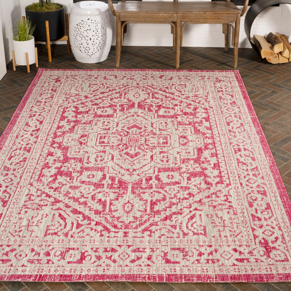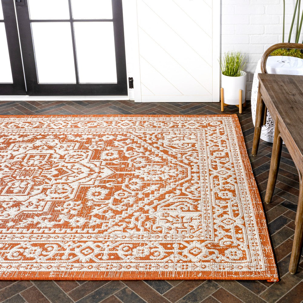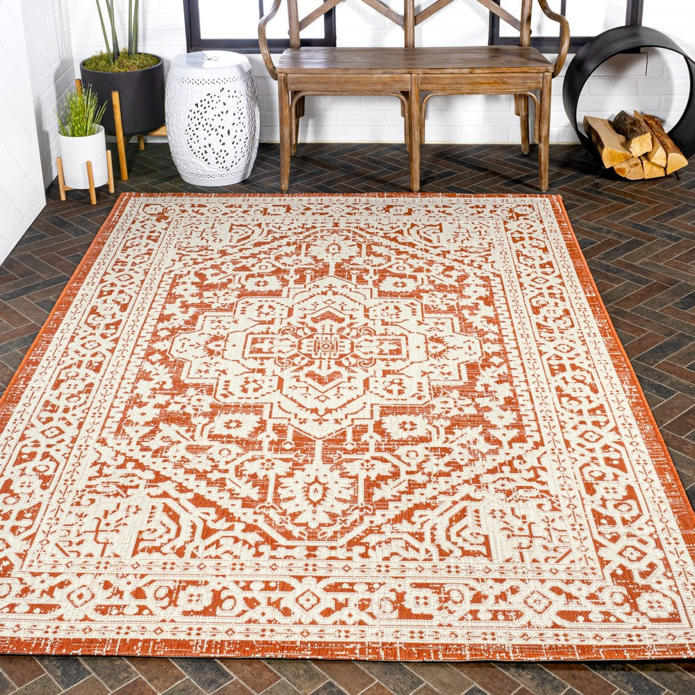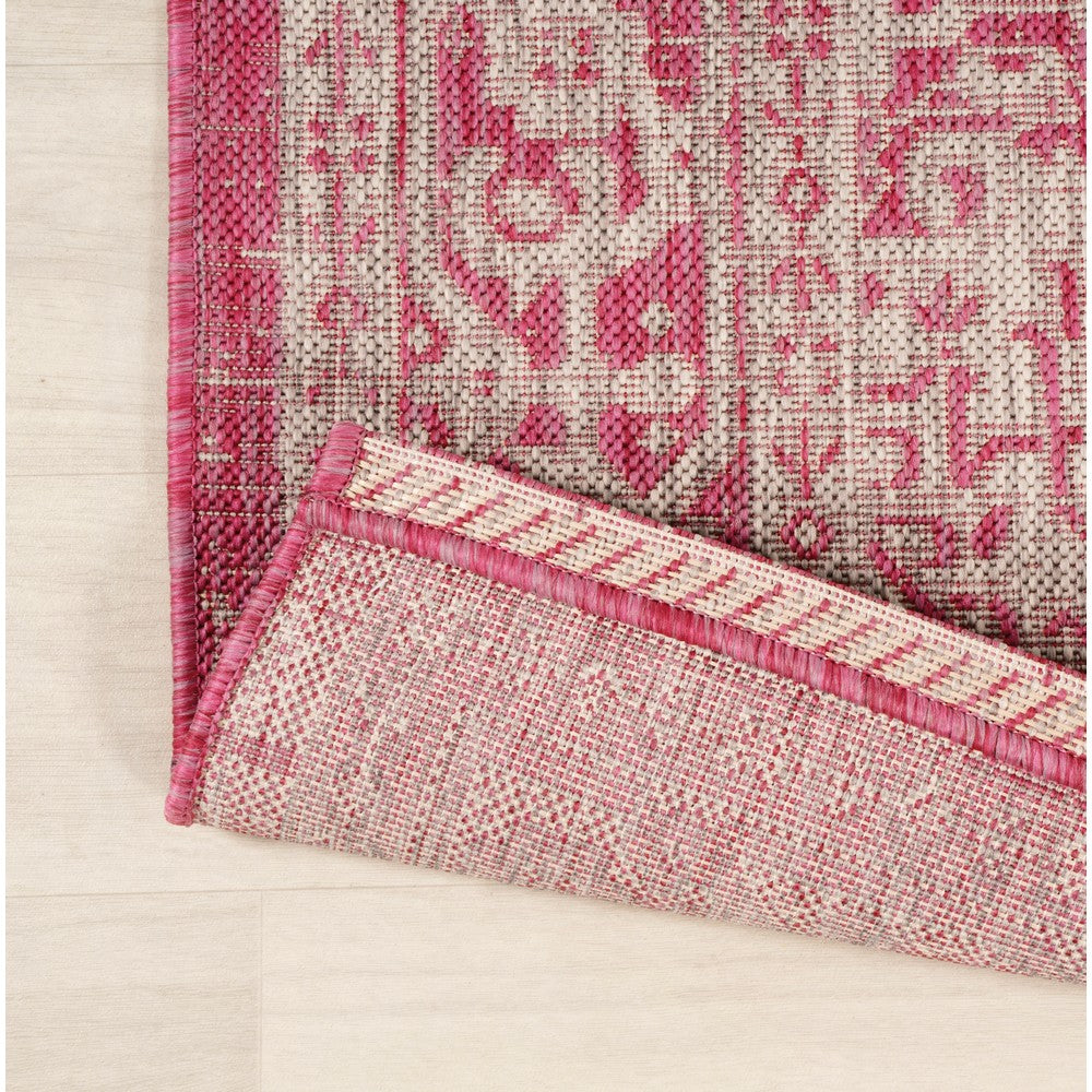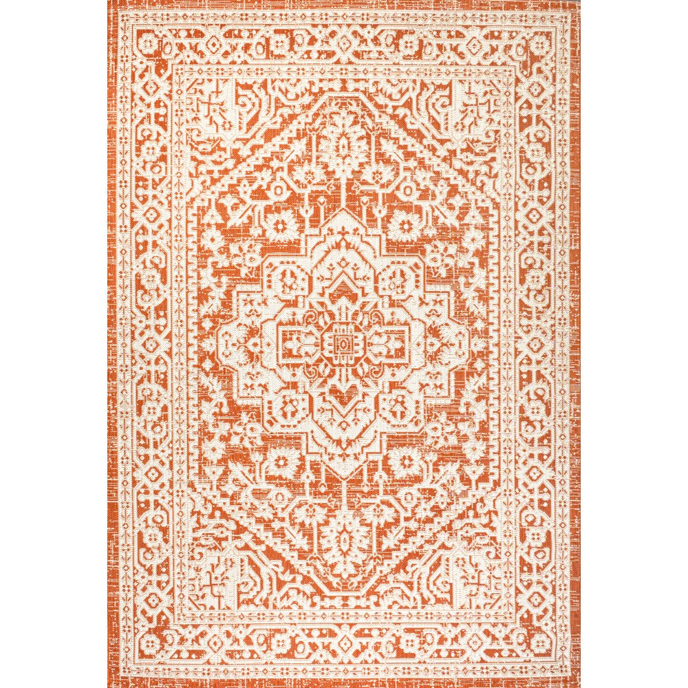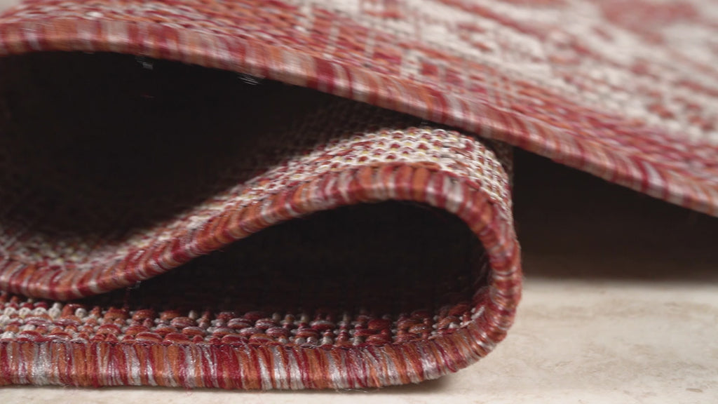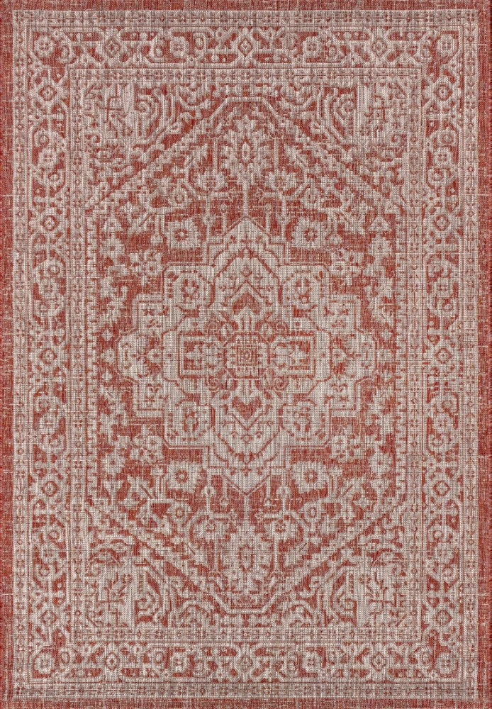 This ornate medallion rug's lively pattern adds exotic style to an outdoor porch or patio. Varied tones of red and rust mingled with a taupe pattern give this rug a hand-woven, vintage vibe. The flatweave design is great for high-traffic spaces indoors too.