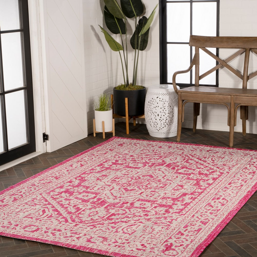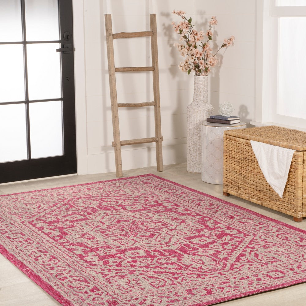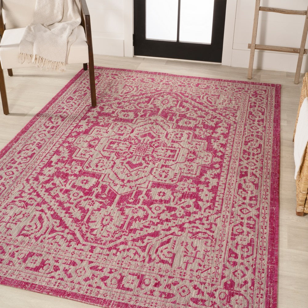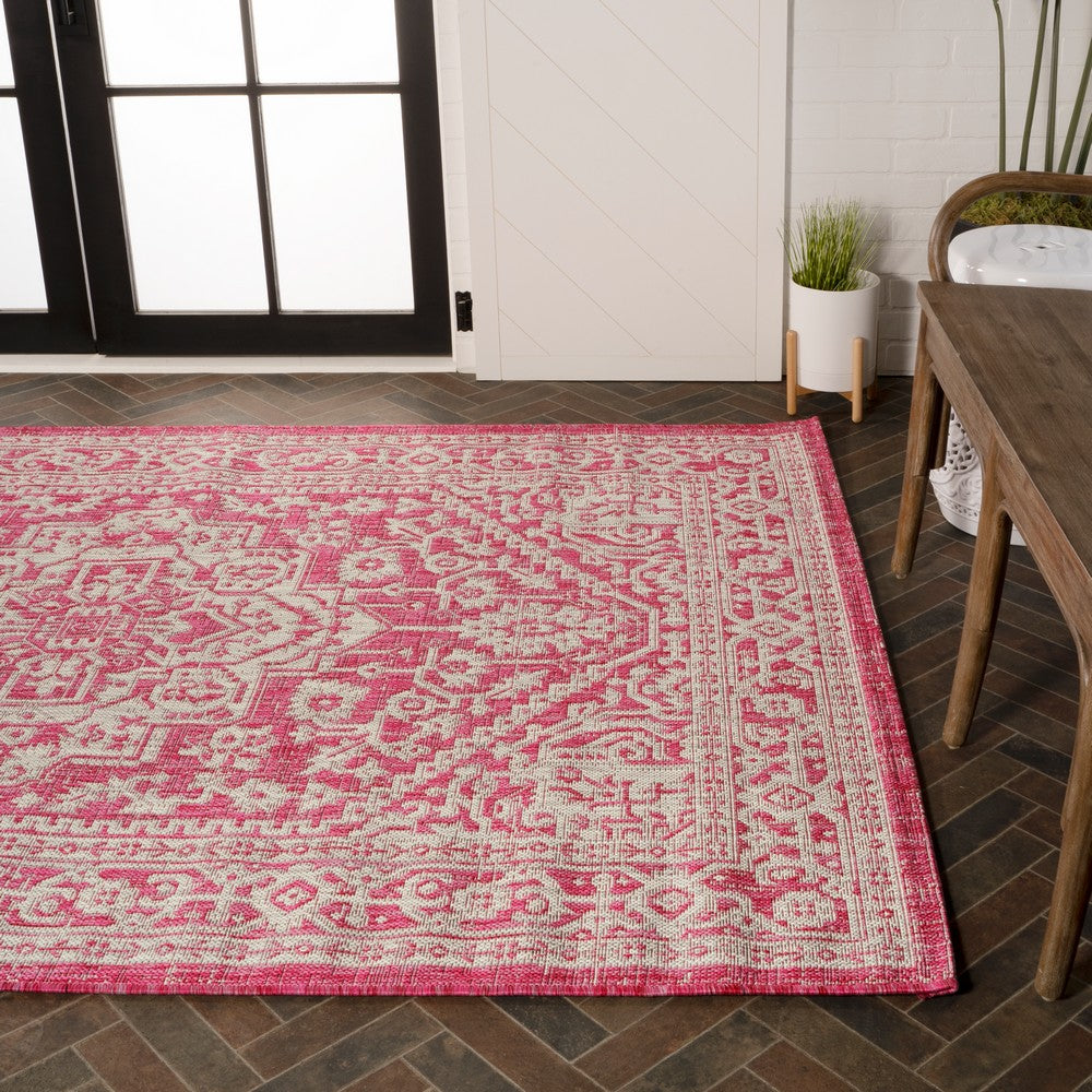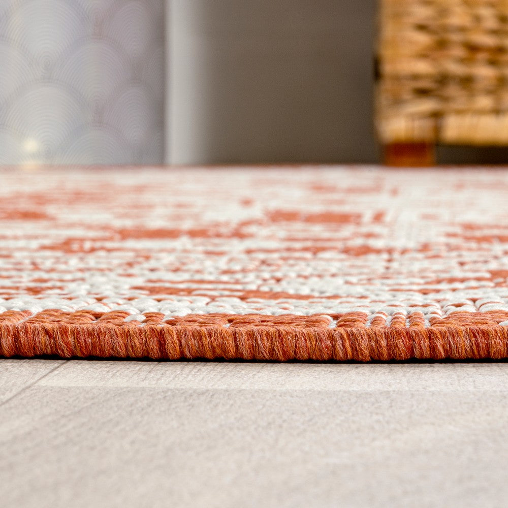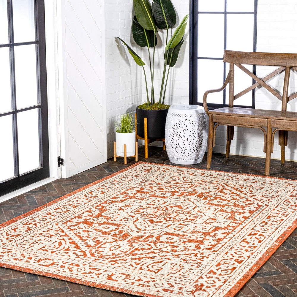 This ornate medallion rug's lively pattern adds exotic style to an outdoor porch or patio. Varied tones of red and rust mingled with a taupe pattern give this rug a hand-woven, vintage vibe. The flatweave design is great for high-traffic spaces indoors too.