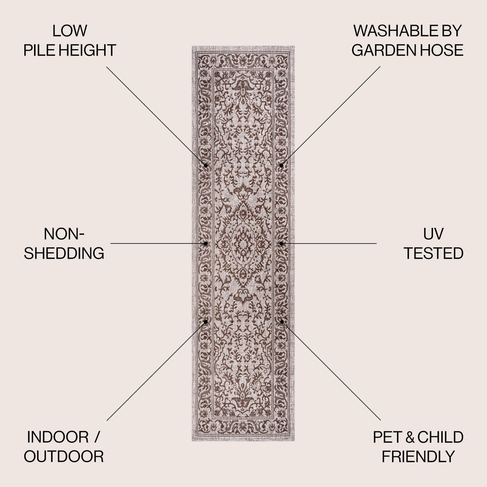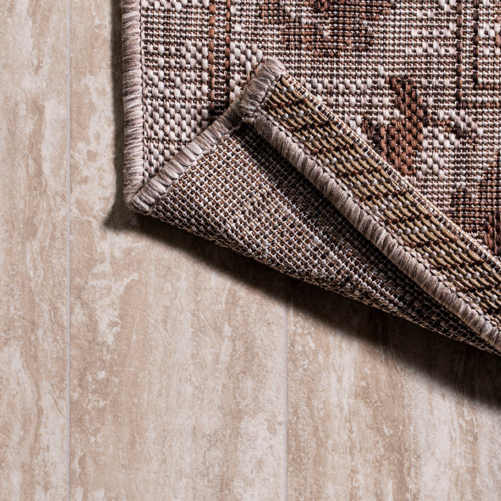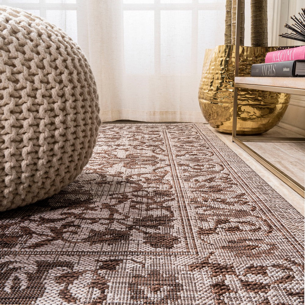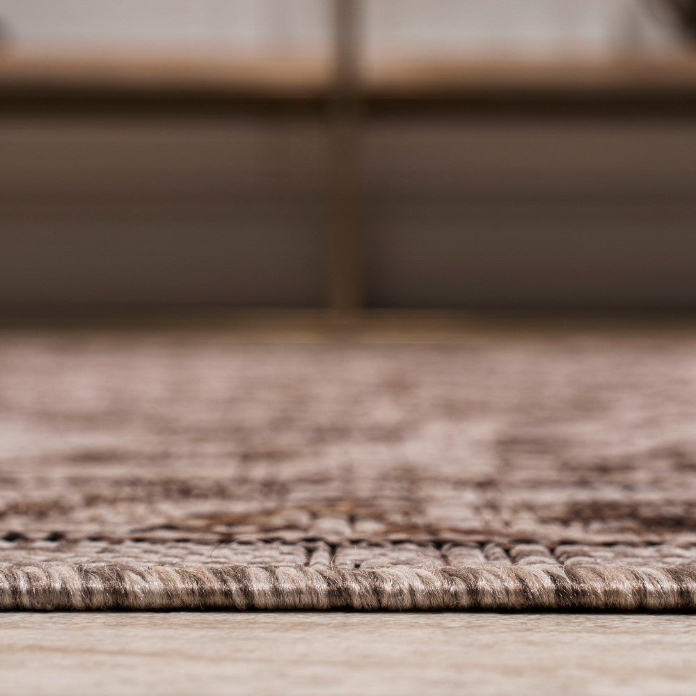 This ornate medallion rug's Persian-inspired pattern adds dreamy Bohemian cottage style to your patio, porch or sunroom. Mingled threads in the beige background give this outdoor rug a hand-woven, vintage vibe. The busy pattern is ideal for your entry, kitchen, hallway, living room or bedroom too. The pet-friendly and kid-proof flatweave design makes it easy to clean, and perfect for the mountain house.