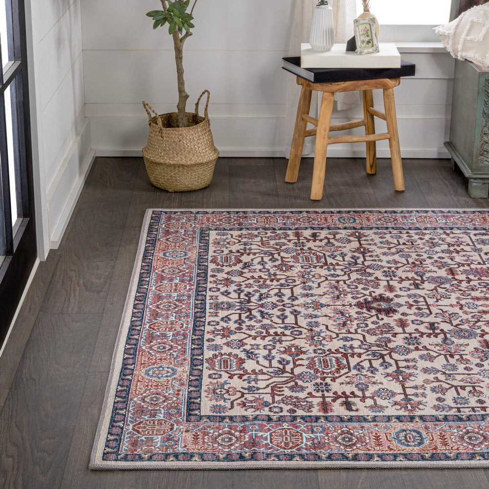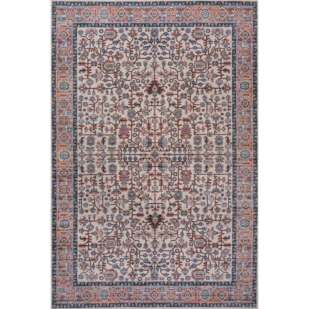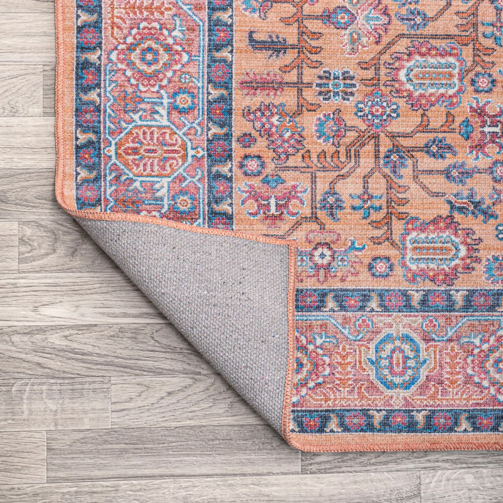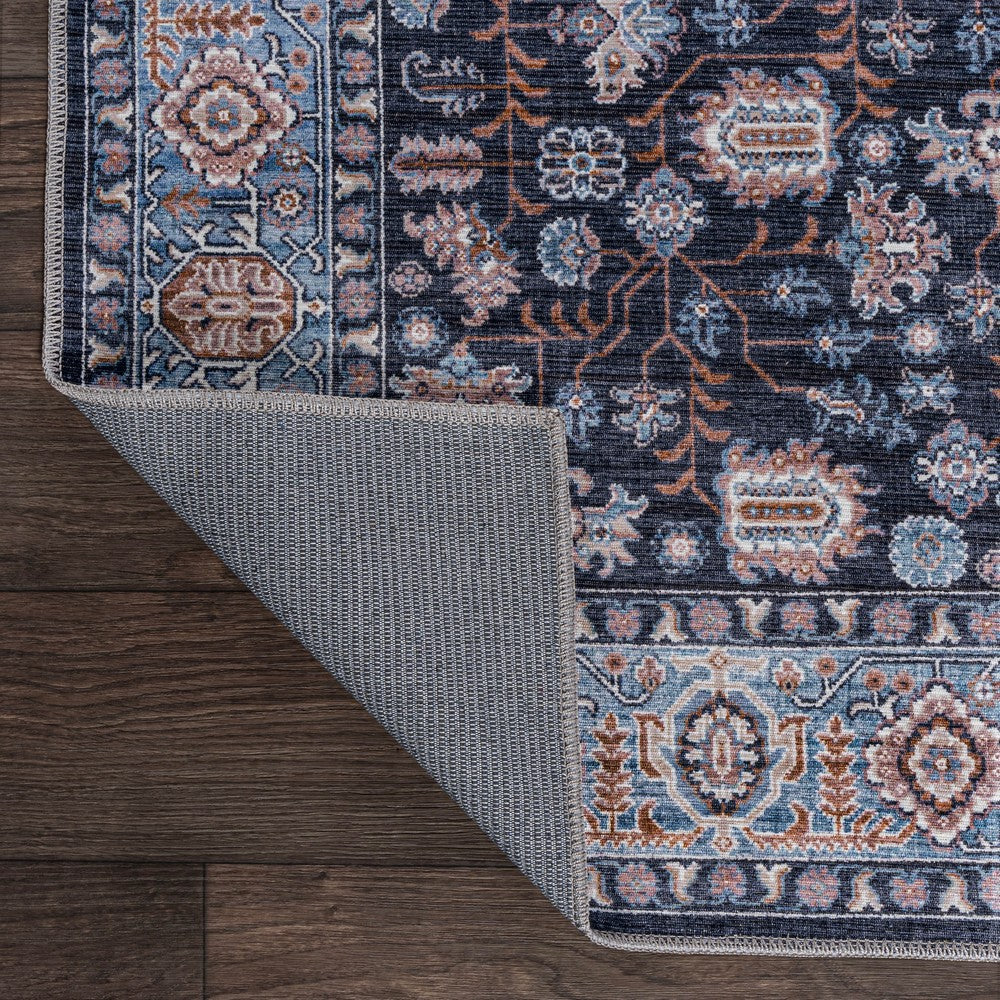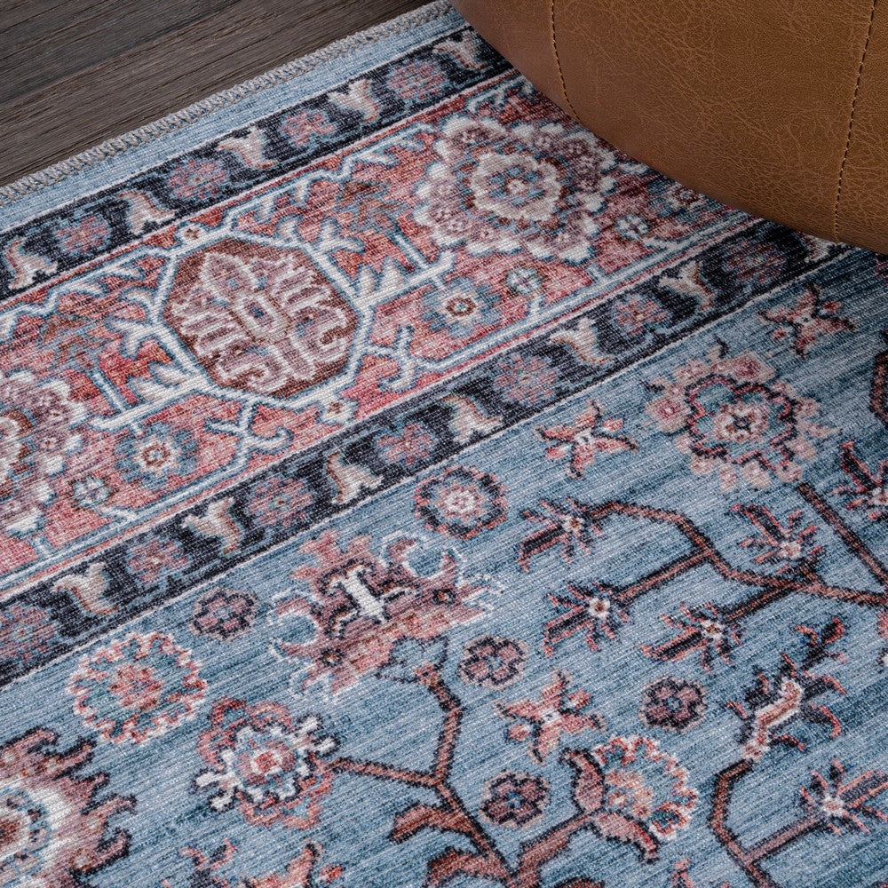 Stylized vines and flowers in the center of this rug's design recall ancient Persian rug designs. Updated colors add a modern Bohemian-inspired twist to a classic design. With its pet-friendly pattern, this easy-care rug would be perfect for a dining room, living room, entry, bedroom or porch.