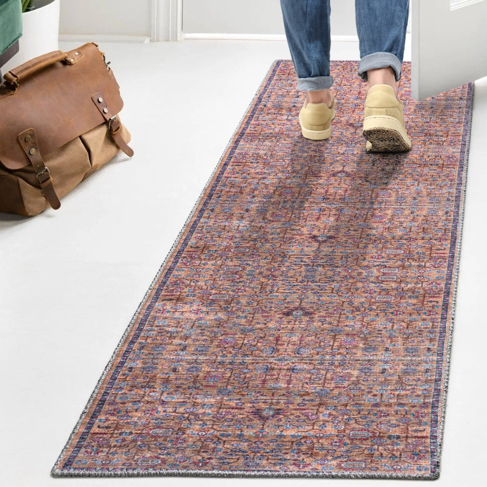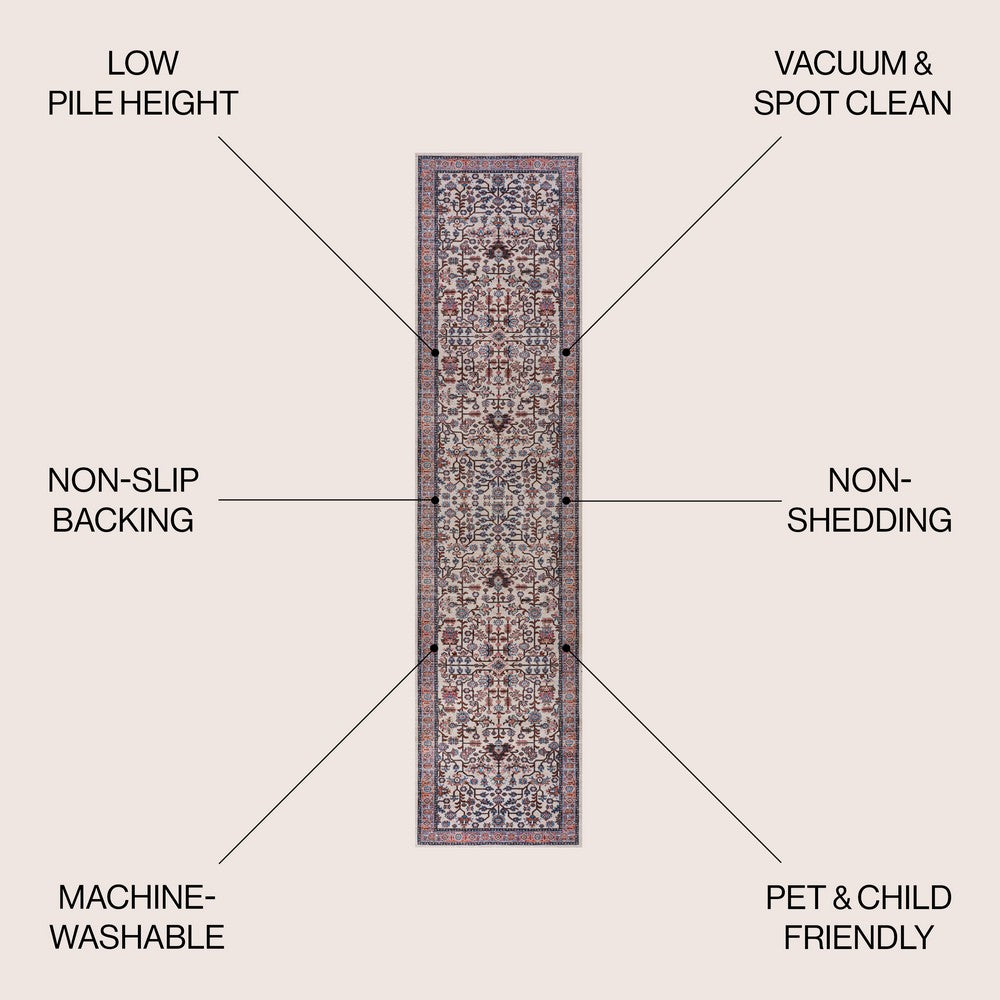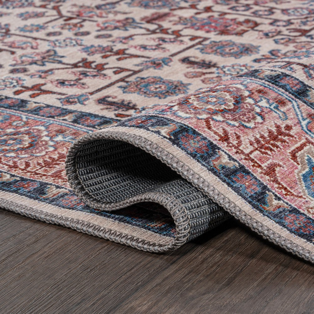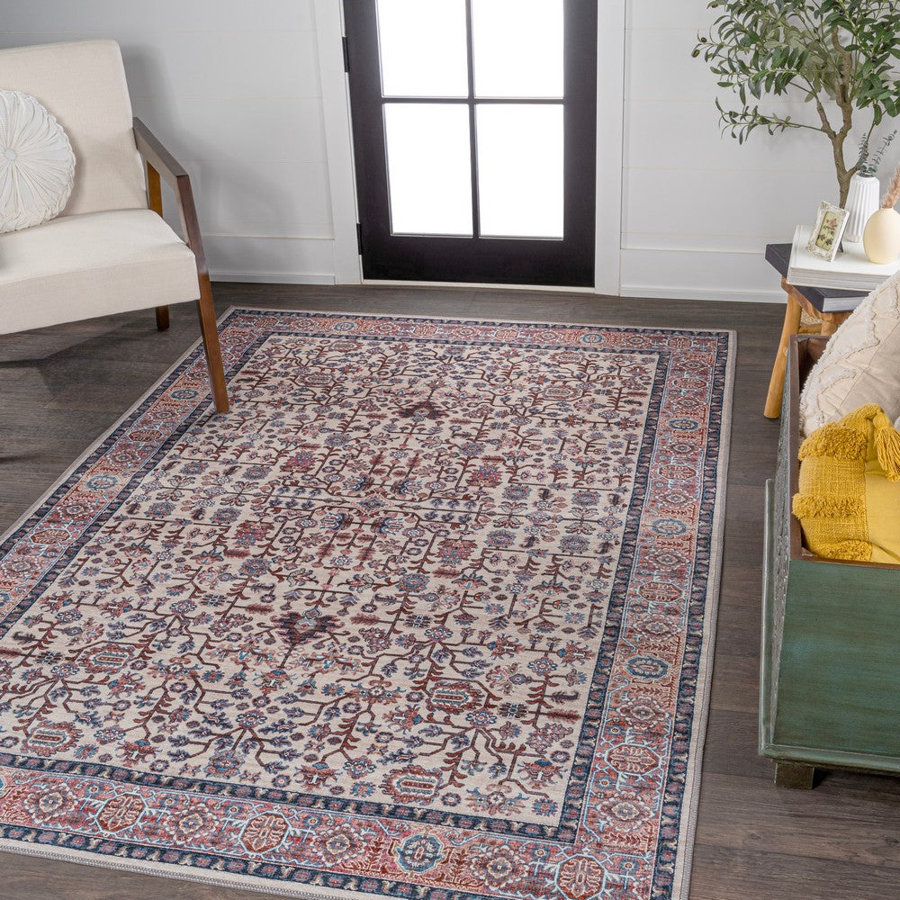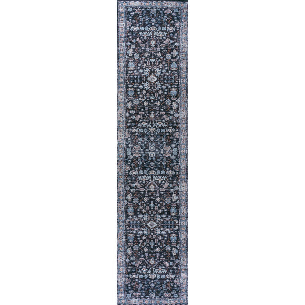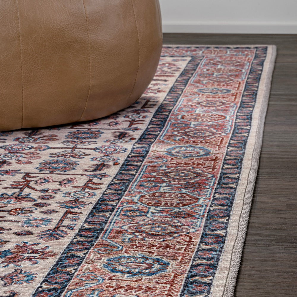 Stylized vines and flowers in the center of this rug's design recall ancient Persian rug designs. Updated colors add a modern Bohemian-inspired twist to a classic design. With its pet-friendly pattern, this easy-care rug would be perfect for a dining room, living room, entry, bedroom or porch.