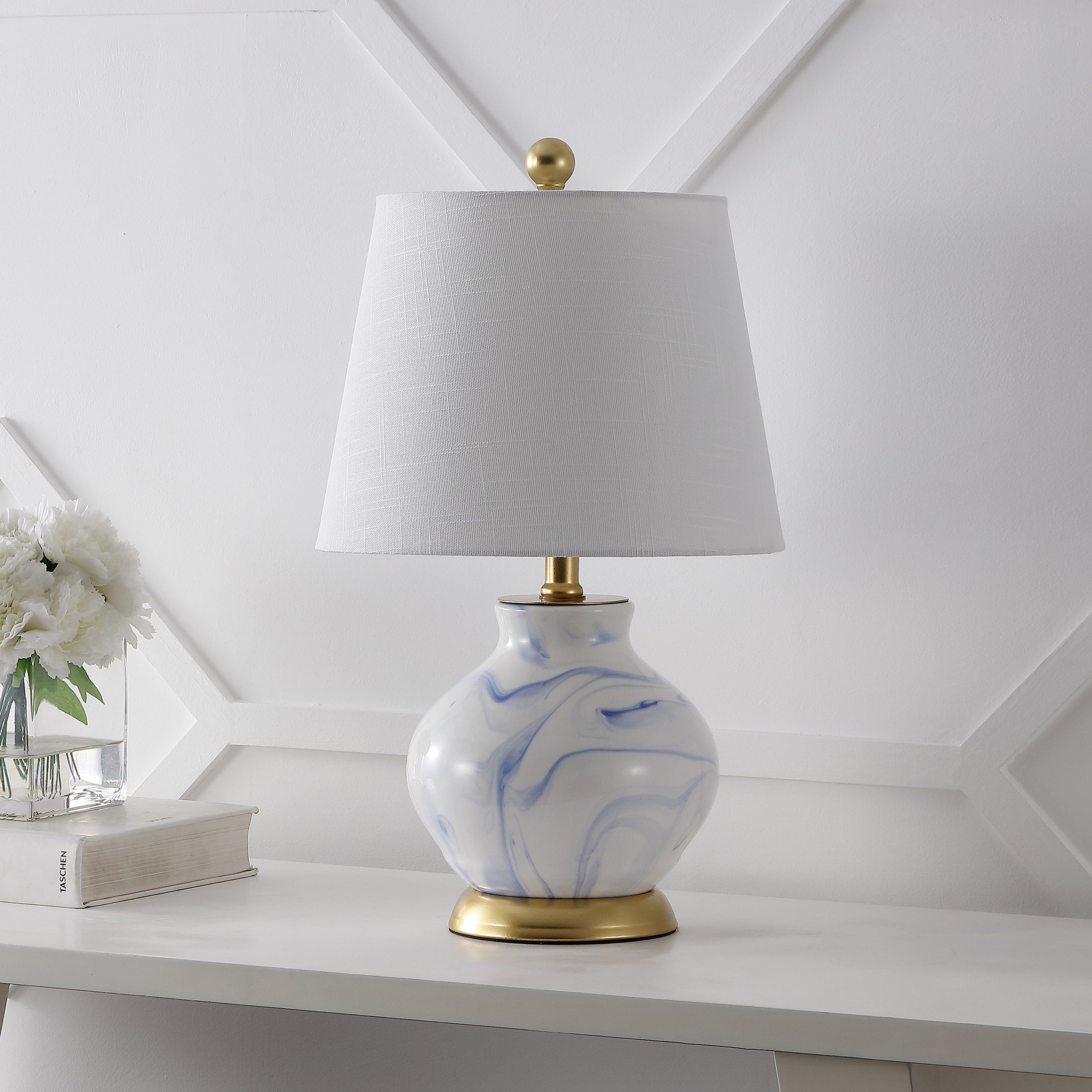 Add style to your home with the designer look of marble recreated in the elegant blue and white glaze of this ceramic table lamp. Artfully painted in a marbleized effect, this lamp is accented with gold leaf accents and a white linen drum shade. At 20.5", it is the perfect proportion for an accent on a side table or buffet.