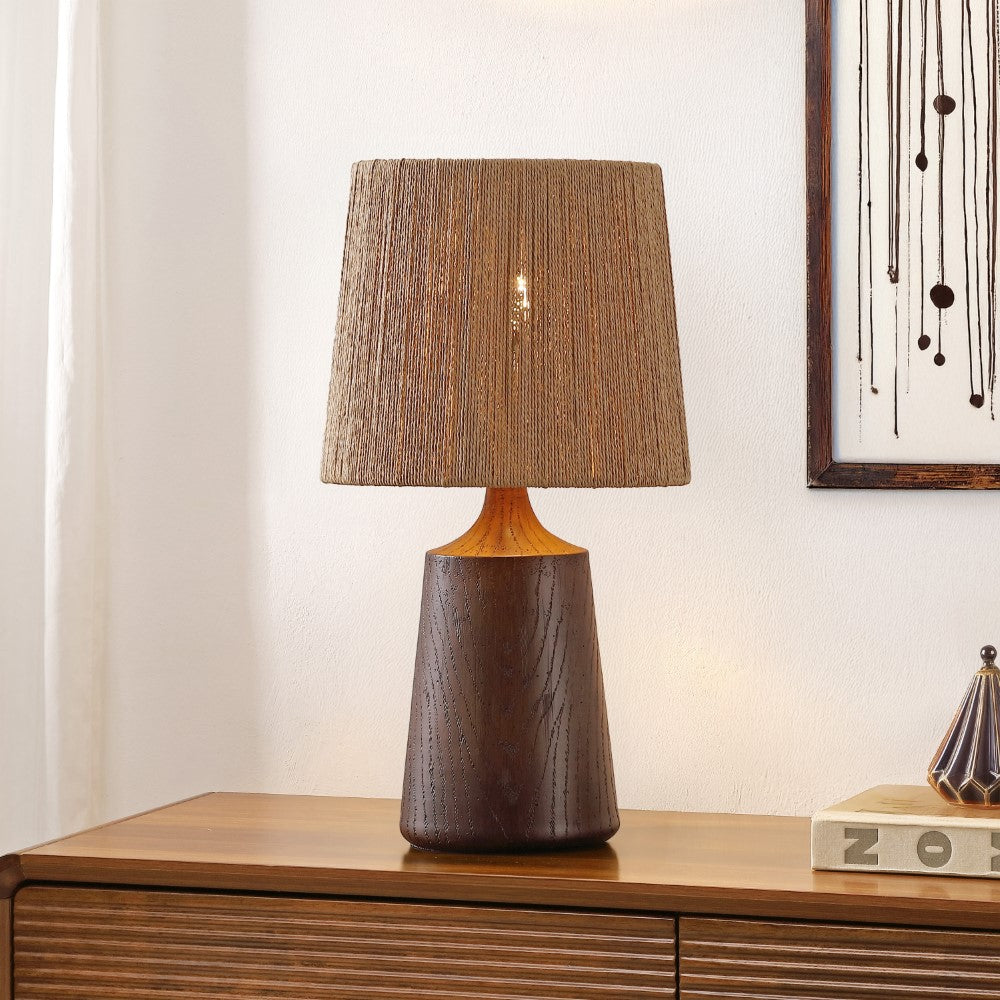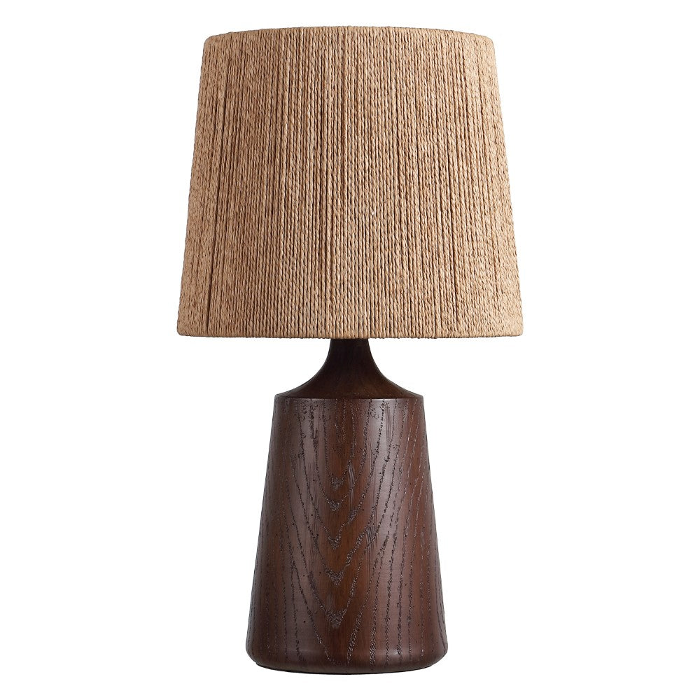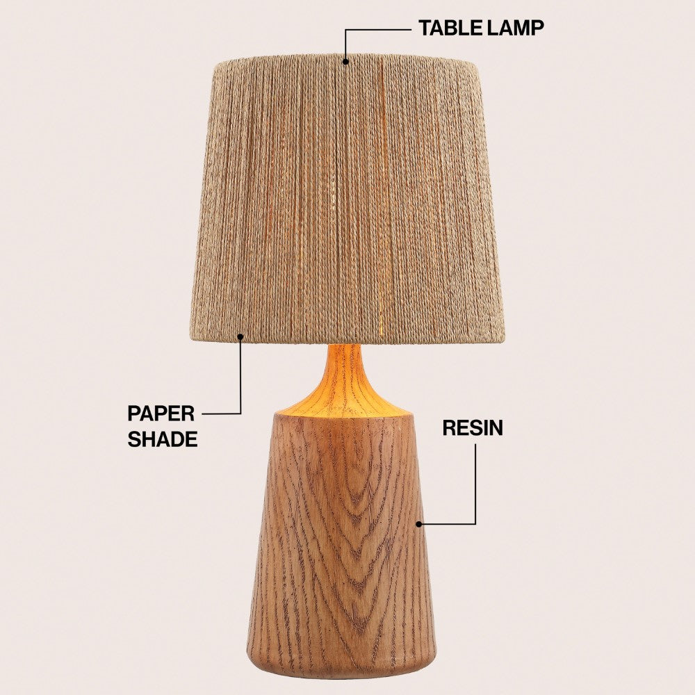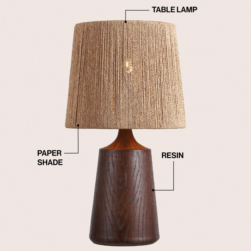 - Textured resin body finished in a warm brown tone with a coordinating paper shade