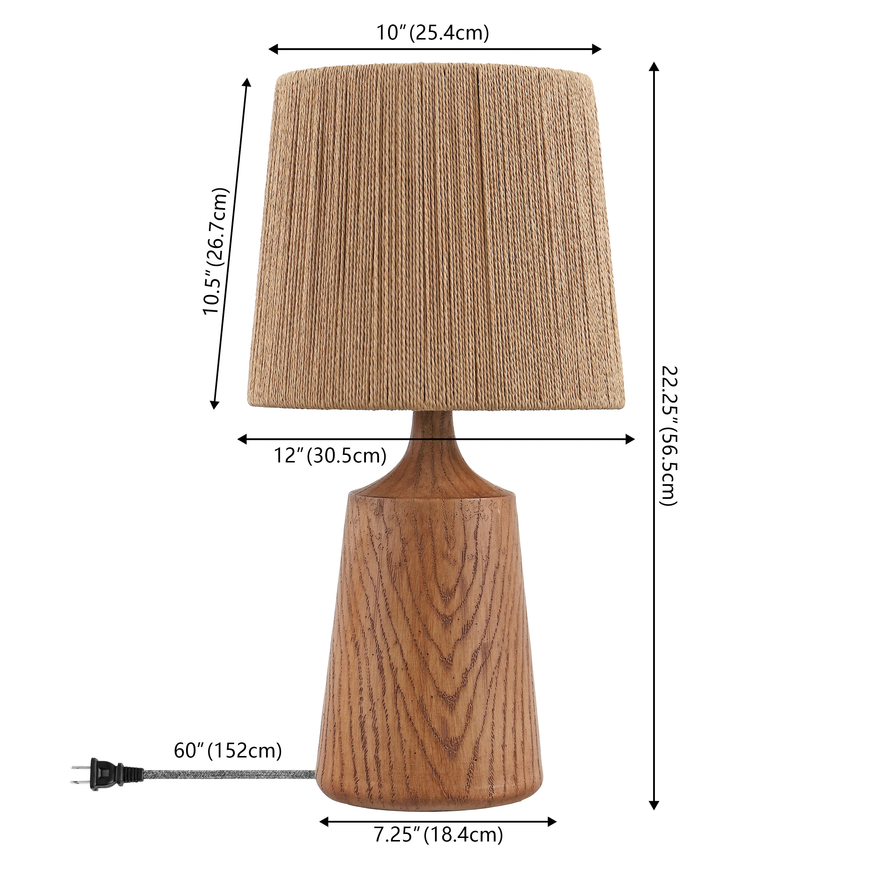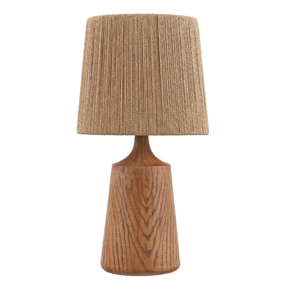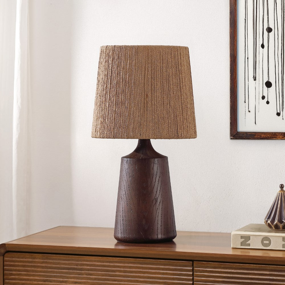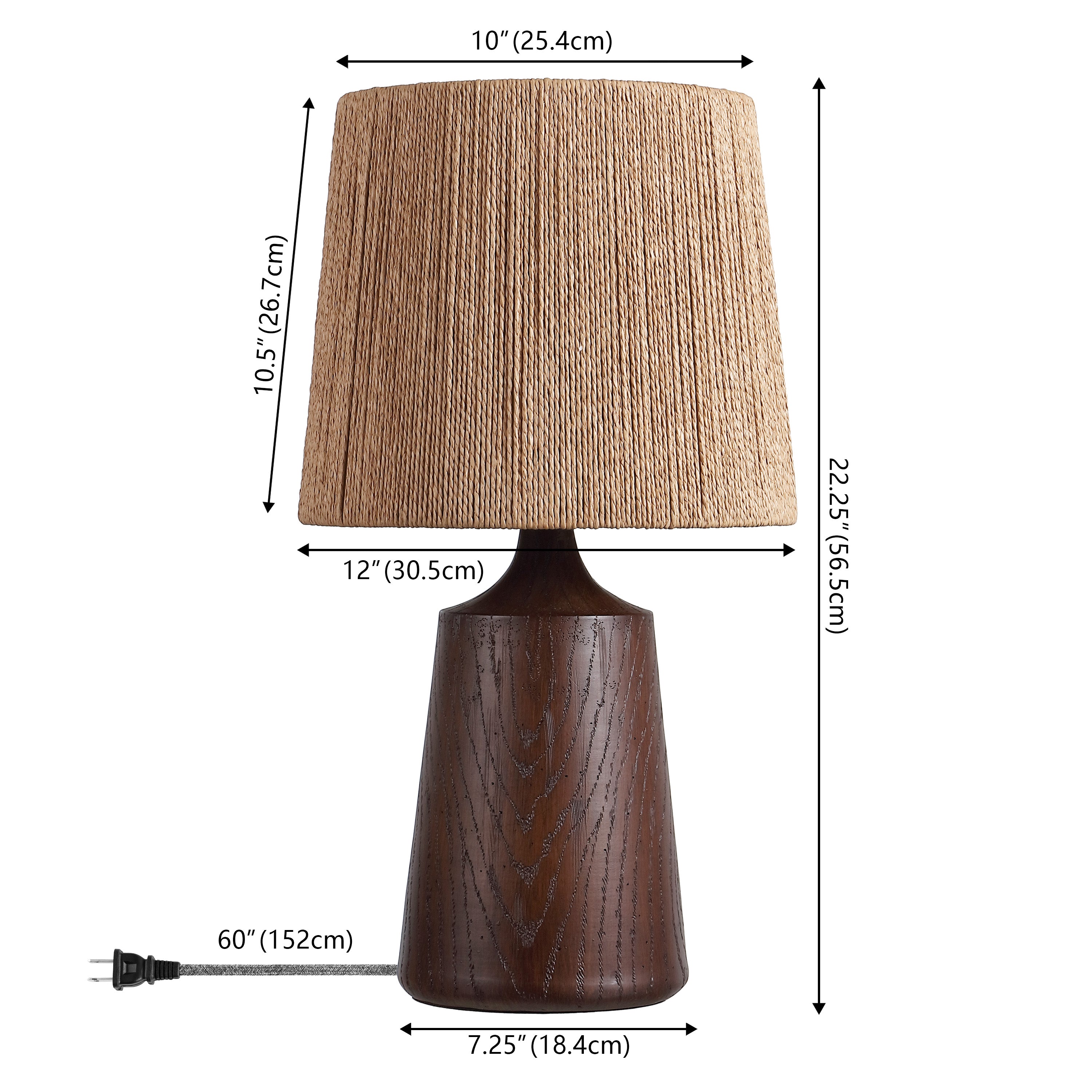 - Textured resin body finished in a warm brown tone with a coordinating paper shade