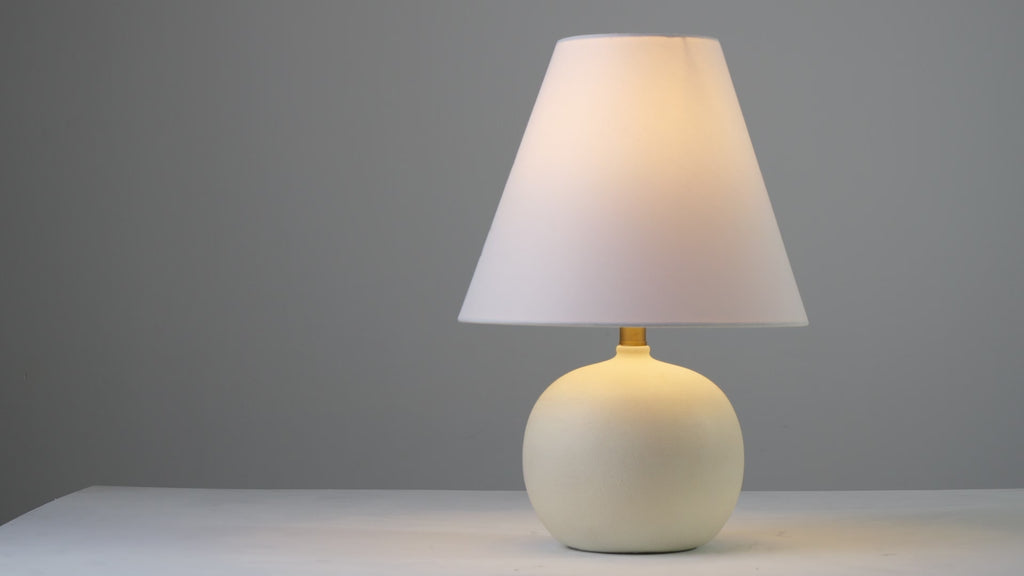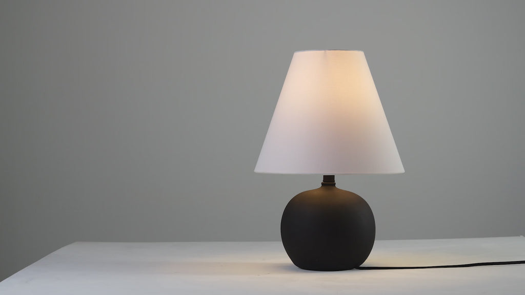 Make a modern statement with our pair of minimalist, geometric lamps. Heavy resin bases in a classic gourd shape are topped with cone-shaped linen shades. The chic matte finish adds contrast to a bedroom, office or living room.
