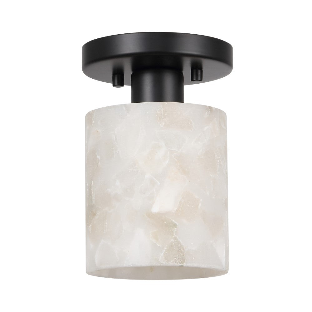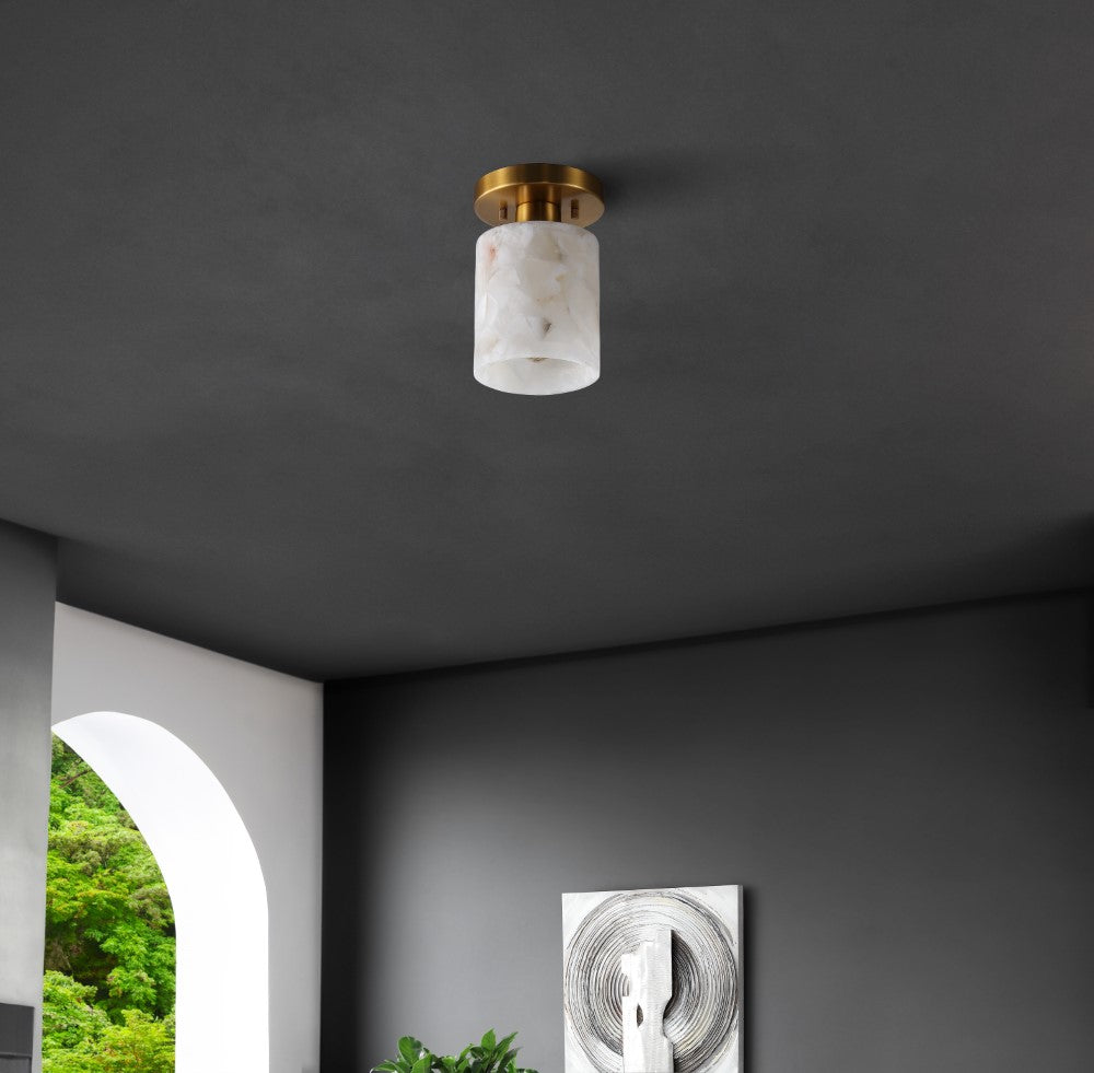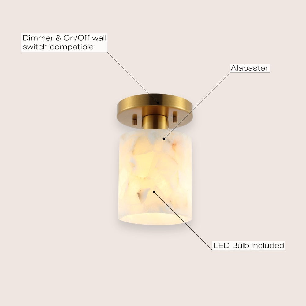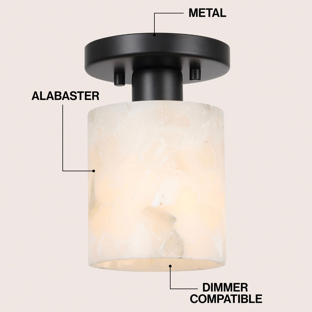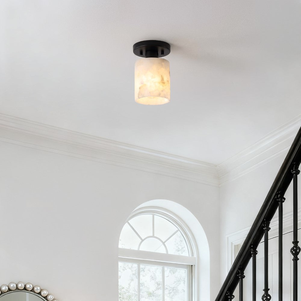 Our modern semi-flush light fixture combines elegant finishes with a minimalist design. The alabaster cylinder shade surrounds a single warm LED bulb; the base is a matching circle. This chic ceiling light adds a contemporary touch to the hallway, bedroom, bathroom, or even a closet.
