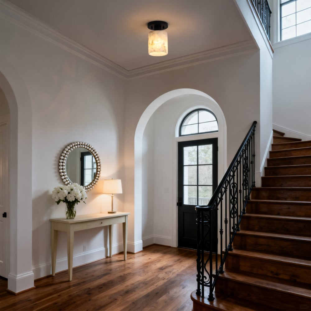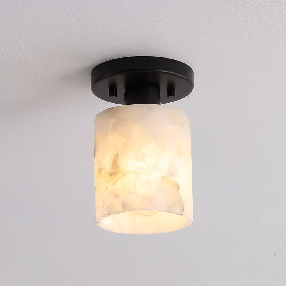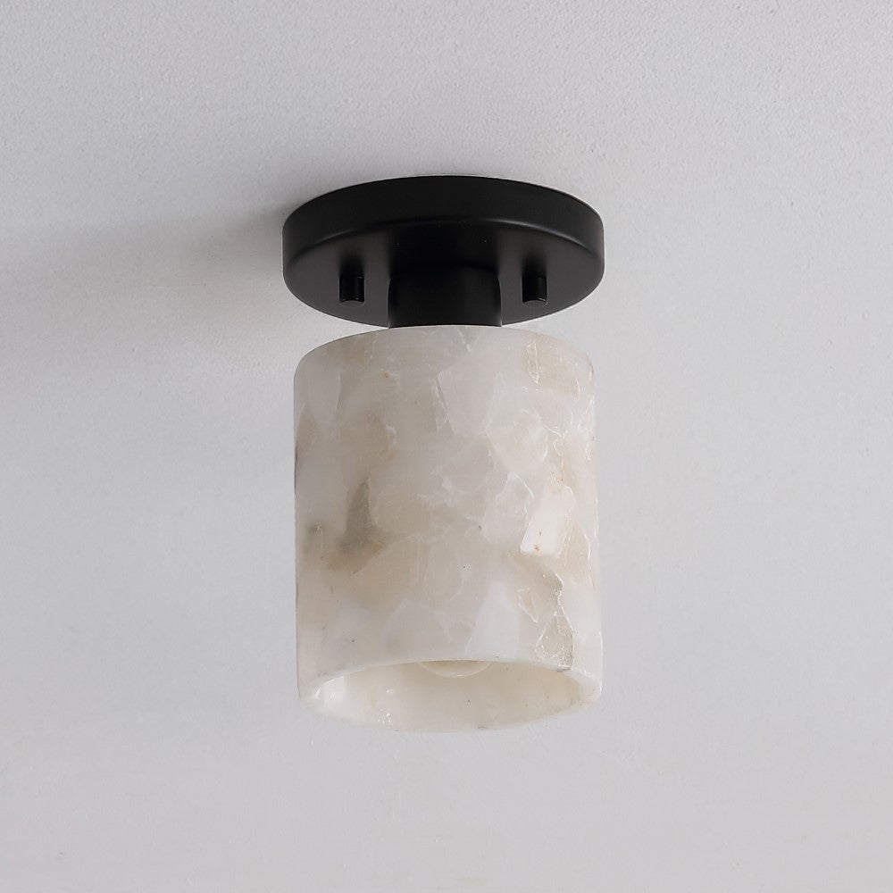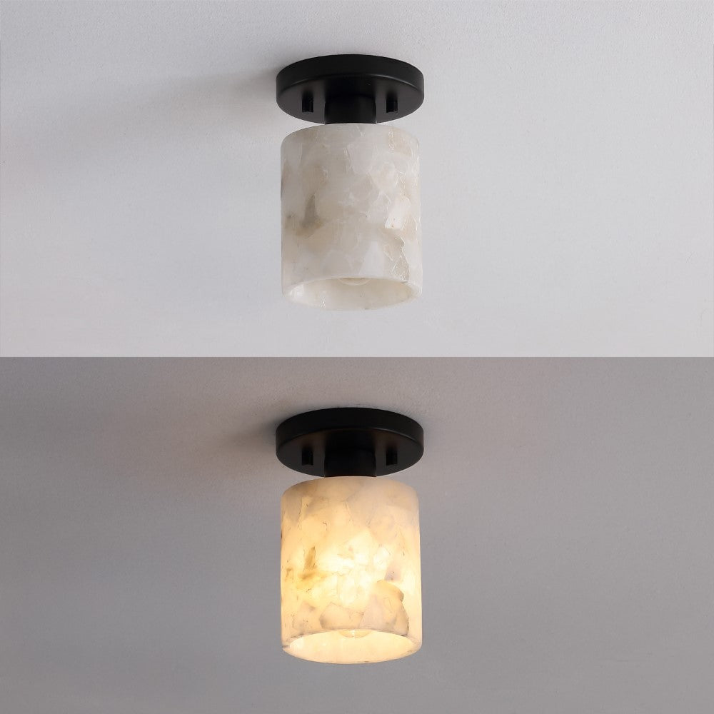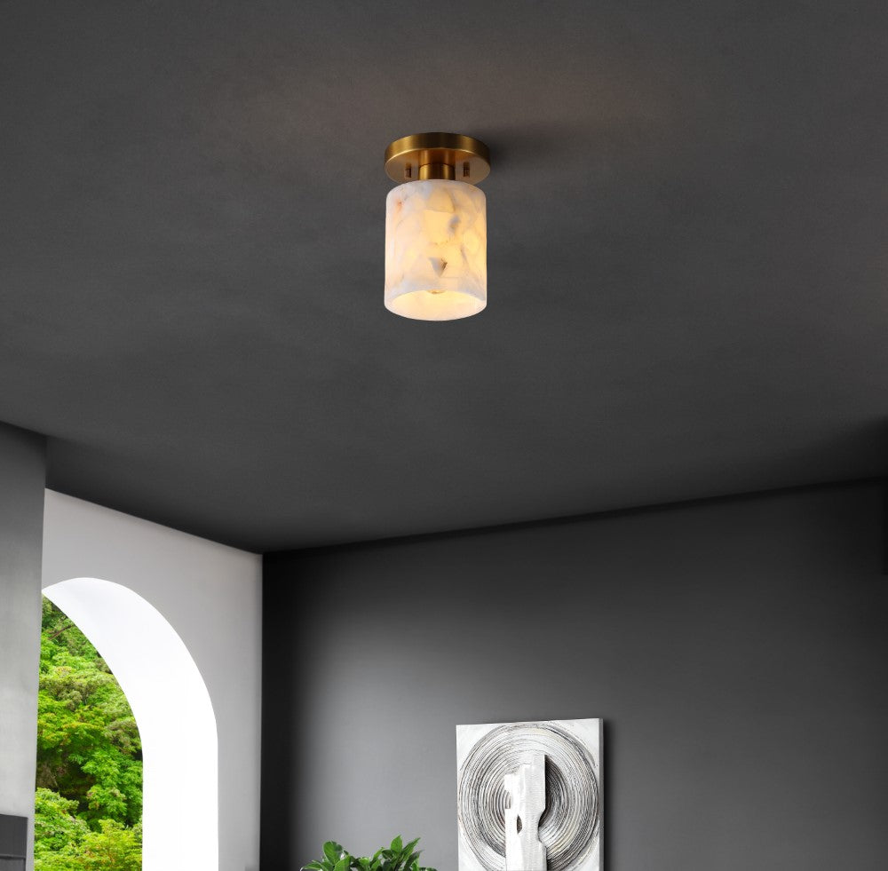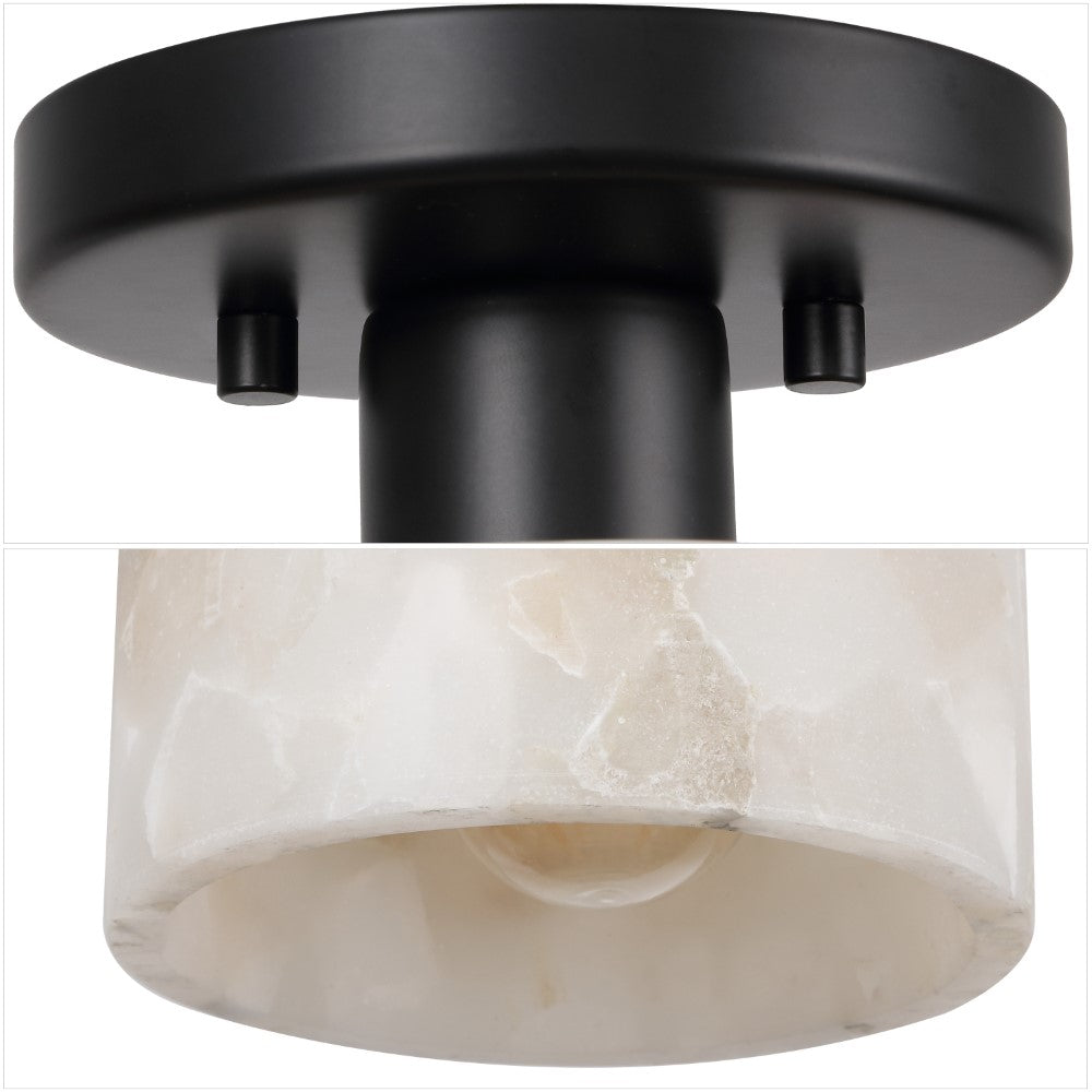 Our modern semi-flush light fixture combines elegant finishes with a minimalist design. The alabaster cylinder shade surrounds a single warm LED bulb; the base is a matching circle. This chic ceiling light adds a contemporary touch to the hallway, bedroom, bathroom, or even a closet.