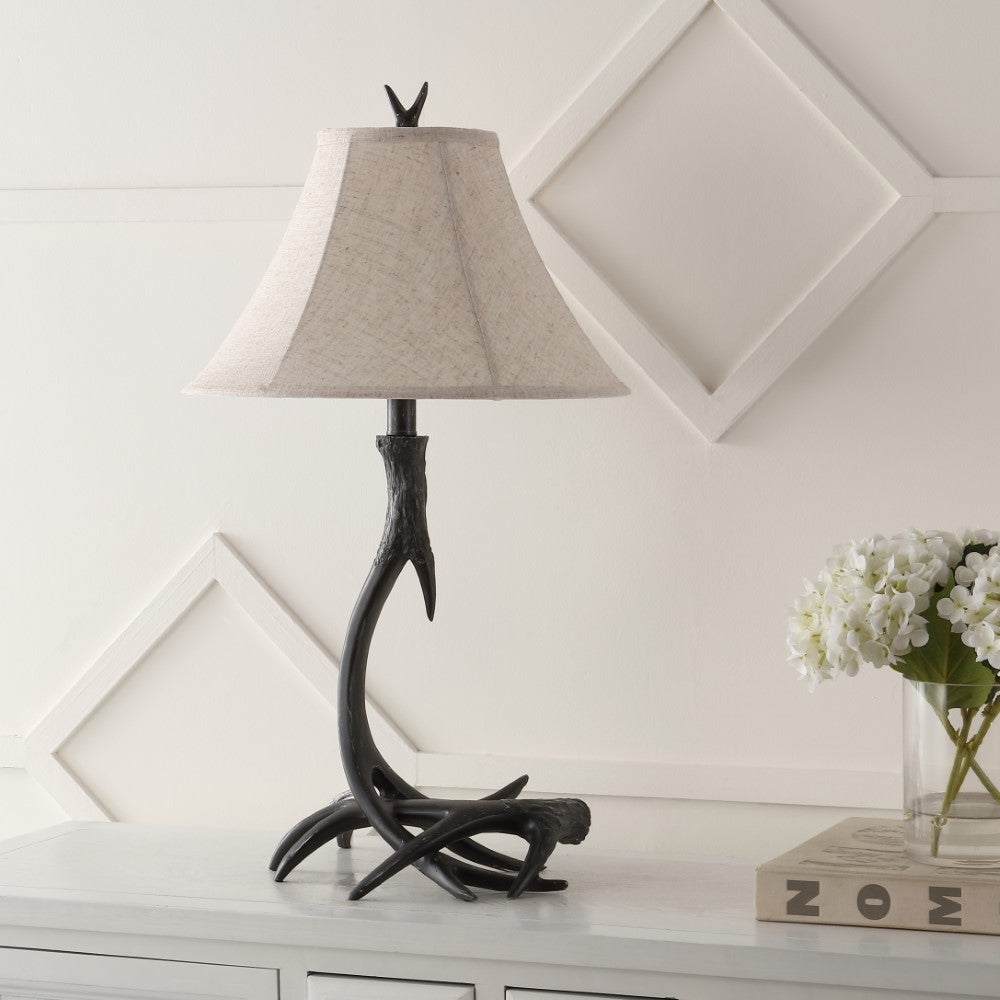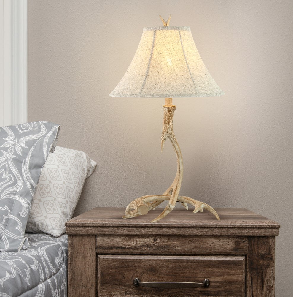 Create a classic lodge feel in your home with this rustic table lamp. Featuring a faux antler base, this nature-inspired lamp is beautifully rugged and artistic. The natural linen drum shade diffuses the light for a soft, warm cabin glow.