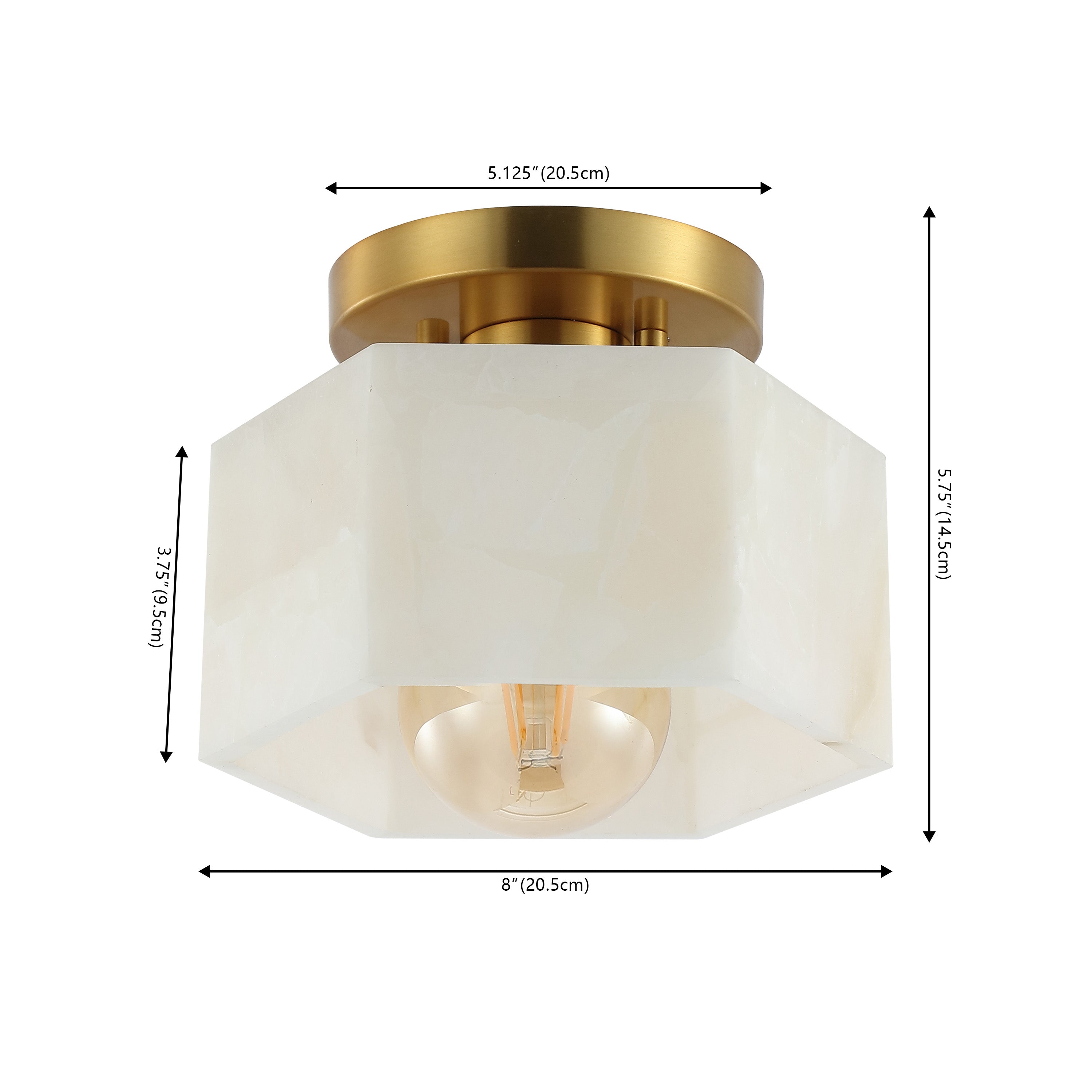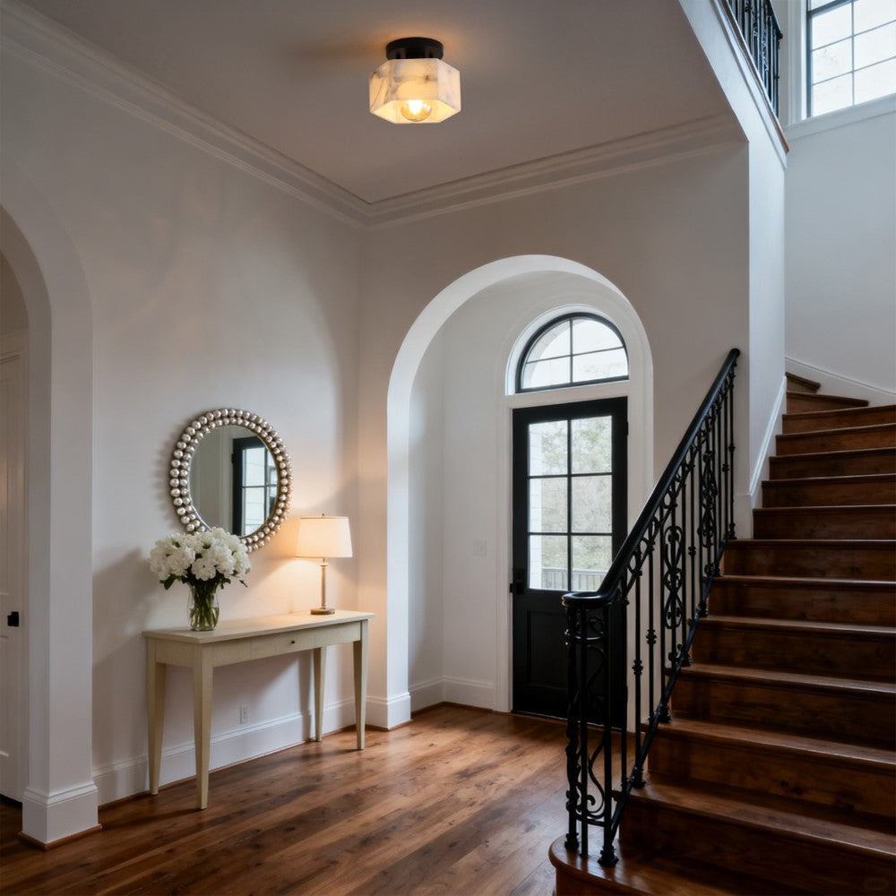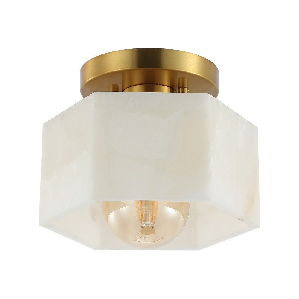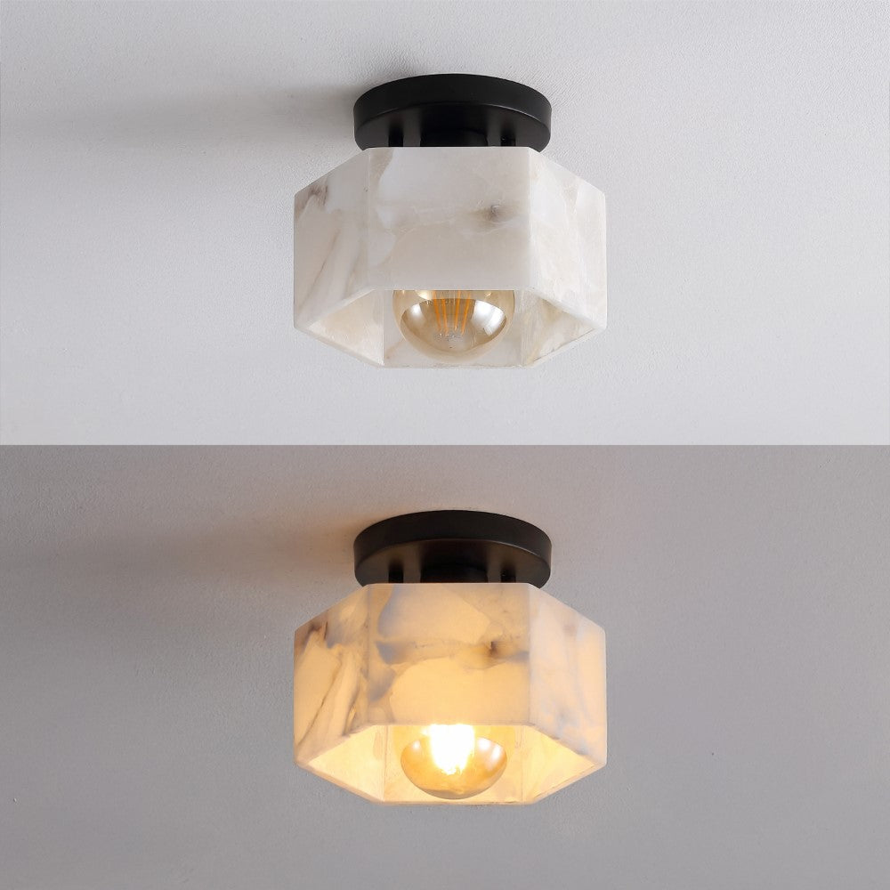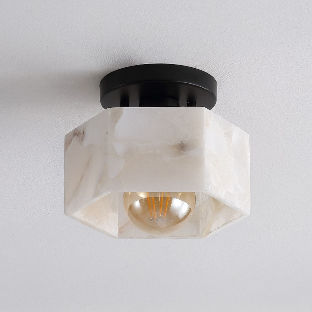 Our minimalist, semi-flush light fixture combines refined finishes with understated design. A hexagonal alabaster shade frames the warm LED bulb; the base is a complementary circle. This ceiling light adds a classic touch to the hallway, bedroom, bathroom, or even a closet.