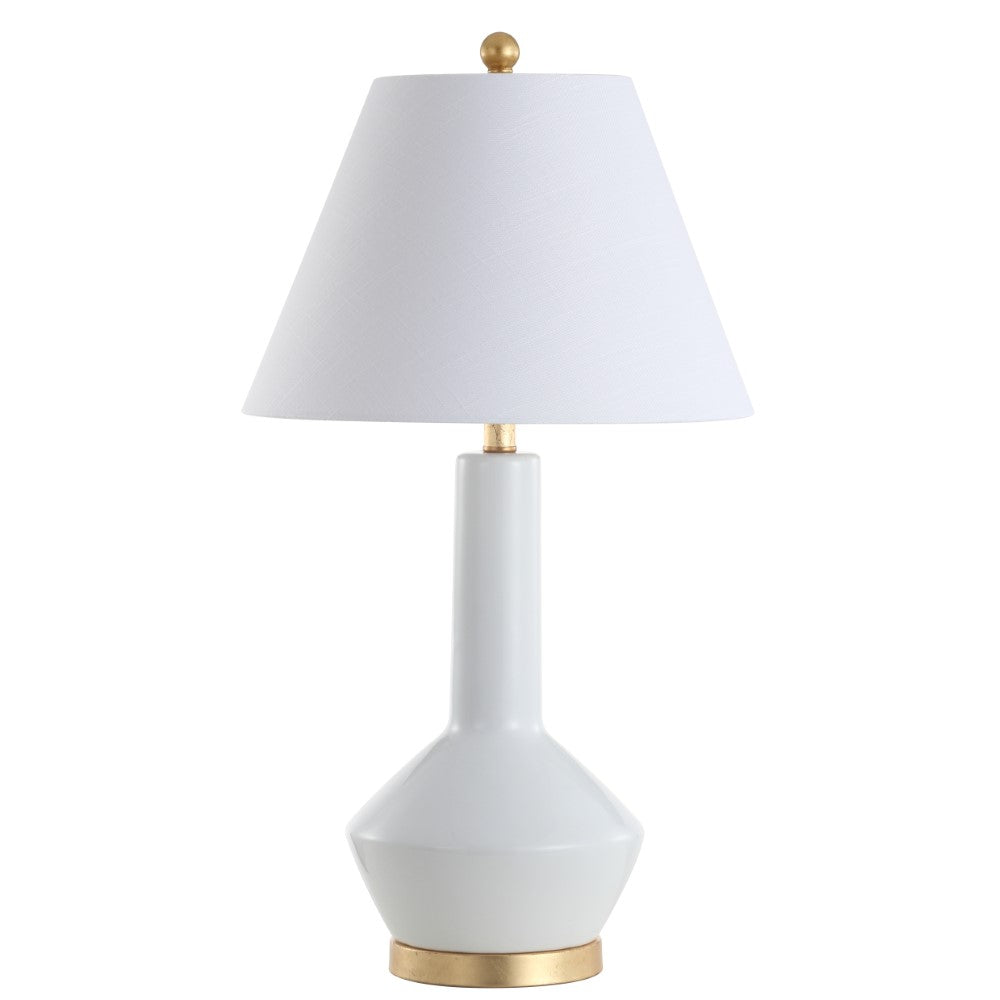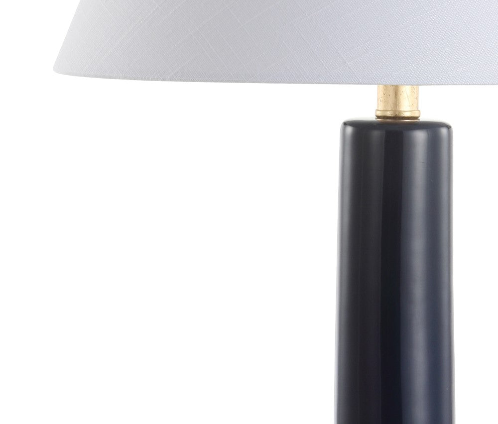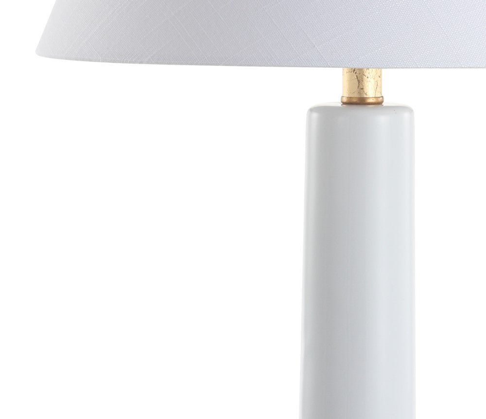 A modern update to the ubiquitous midcentury gourd lamps, this glossy ceramic silhouette adds intrigue to any décor. We love the brushed brass pedestal, and how the angles of the base are mirrored in the tapered linen empire shade. The designer elements extend to the plug, with a 60" silk-wrapped cord.