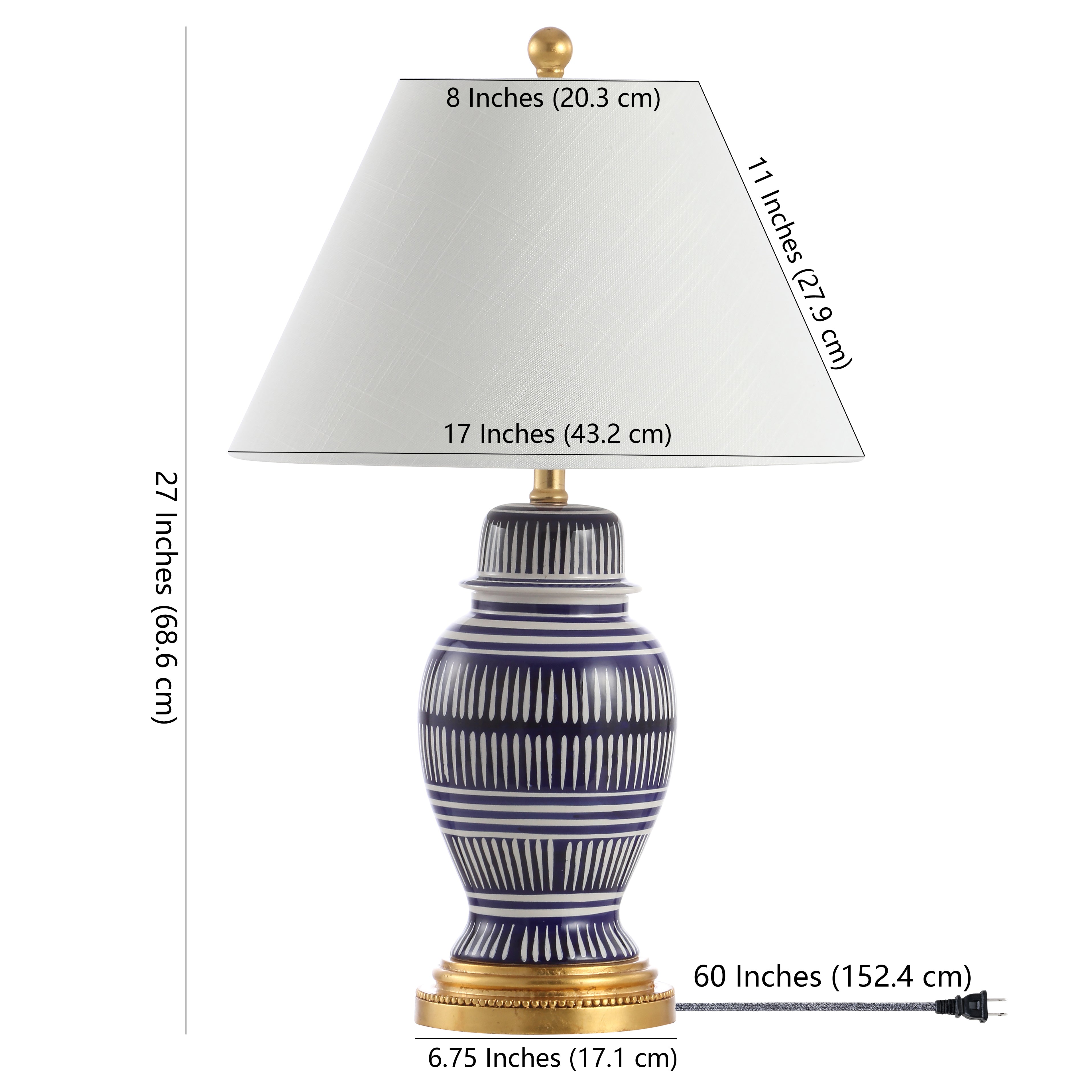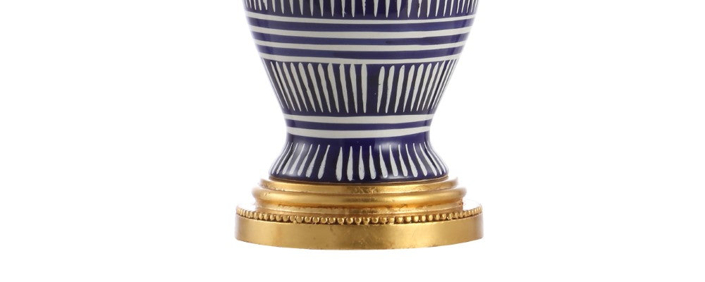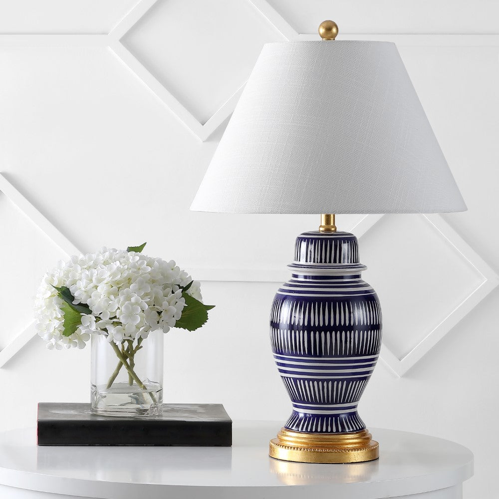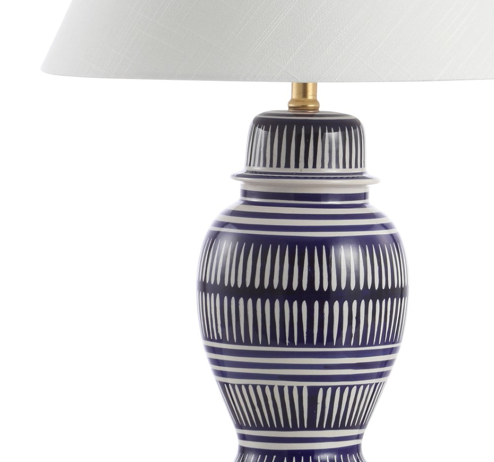 Your favorite blue and white coastal lamp gets a modern update, with its graphic white pattern on a navy background. Gold fittings and a white linen shade are a nod to the traditional ginger jar design. Add a pair to your resort condo, cottage, beach house, or nautical themed bedroom. Includes an energy-saving LED bulb.
