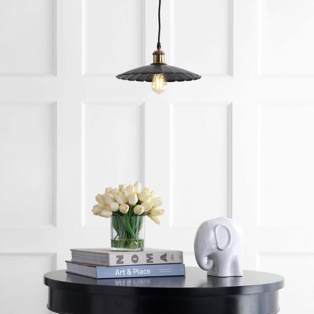 With a fanned shade reminiscent of the lotus leaf, this lily pad of a light makes any space bloom. Whether in a trio over a kitchen island, in a row of pendants down a hallway, or hung singularly over a seating area, the gentle simplicity of the design adds a chic understated element. Made from painted iron and electroplated brass components coupled with an adjustable cord for customized ceiling drop, it's a lovely addition to any space.