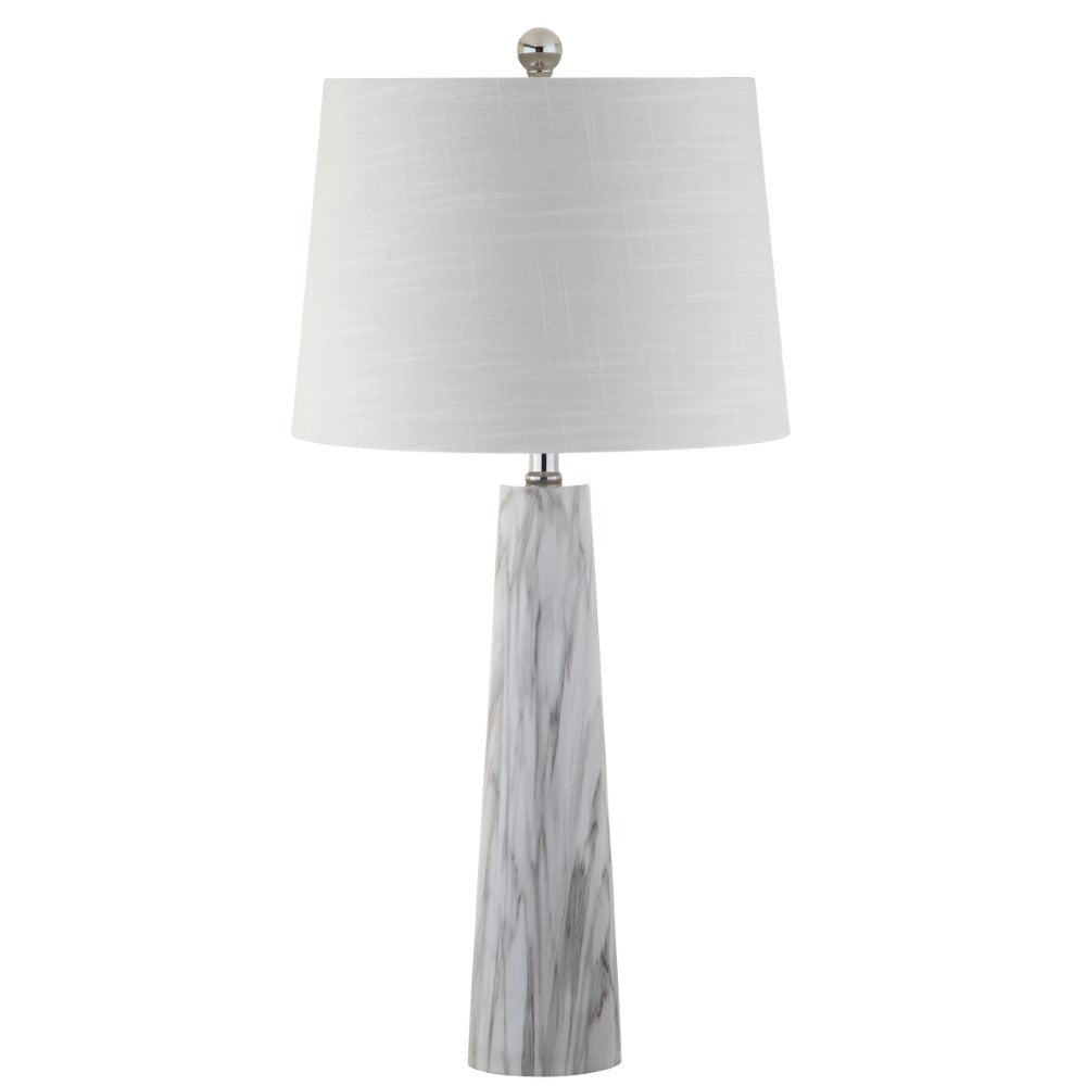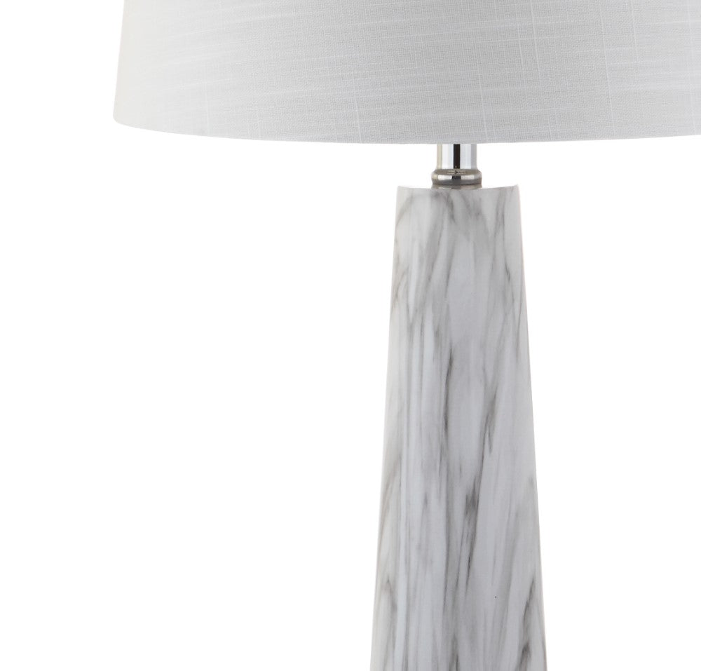 Contemporary charm characterizes the conical base of this modern table lamp. A radiant mix of chromed metal components and white faux marble yields an elegant geometric effect with an artful influence. A chrome finial and linen drum shade complete the look.