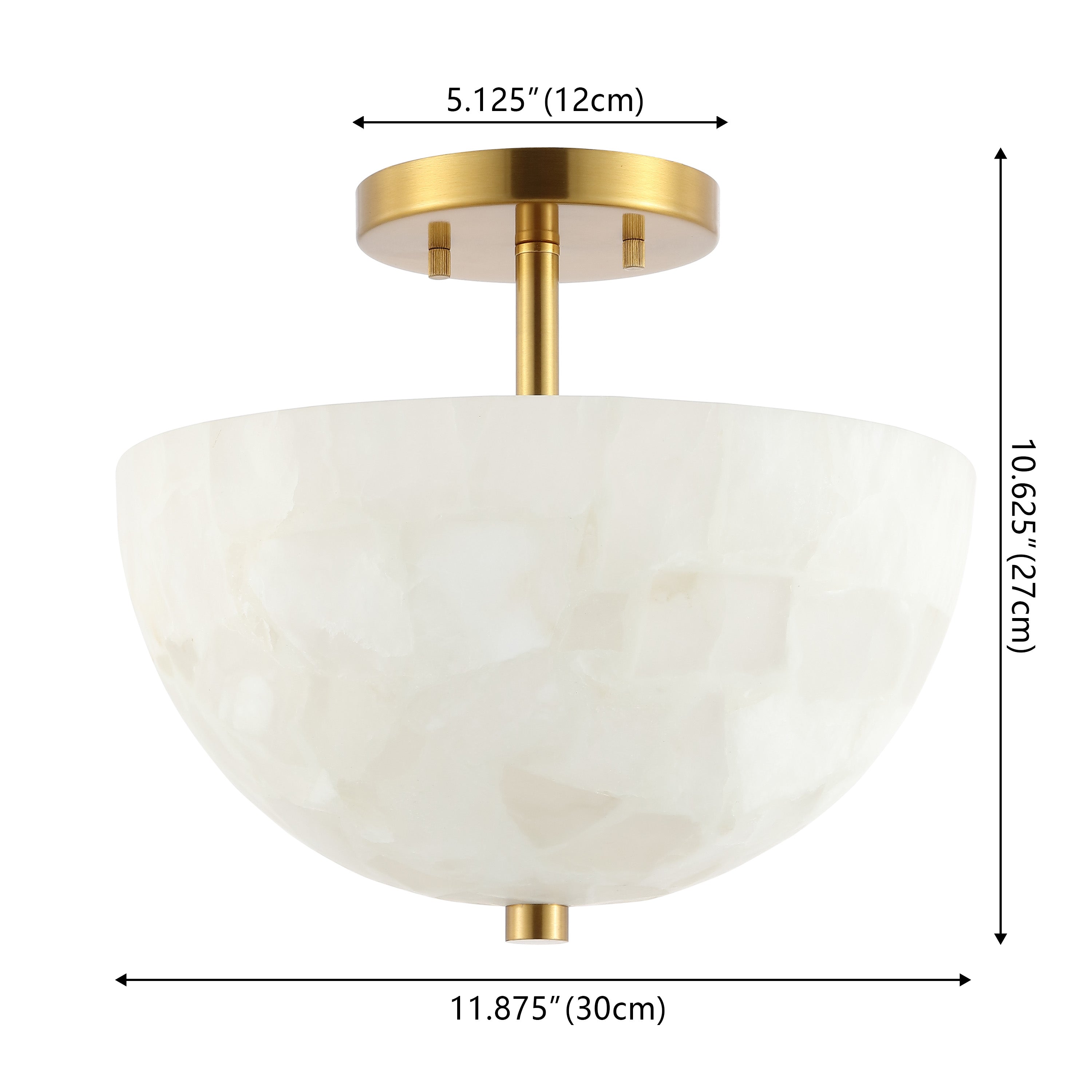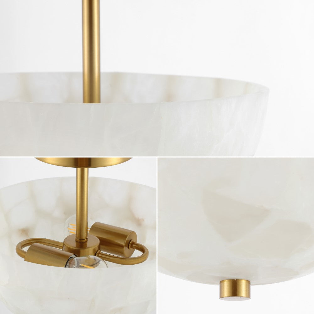 - Matte brass finish, alabaster shade with natural veining in gray and brown