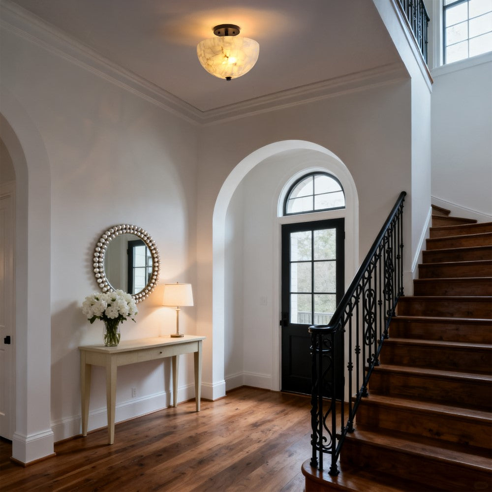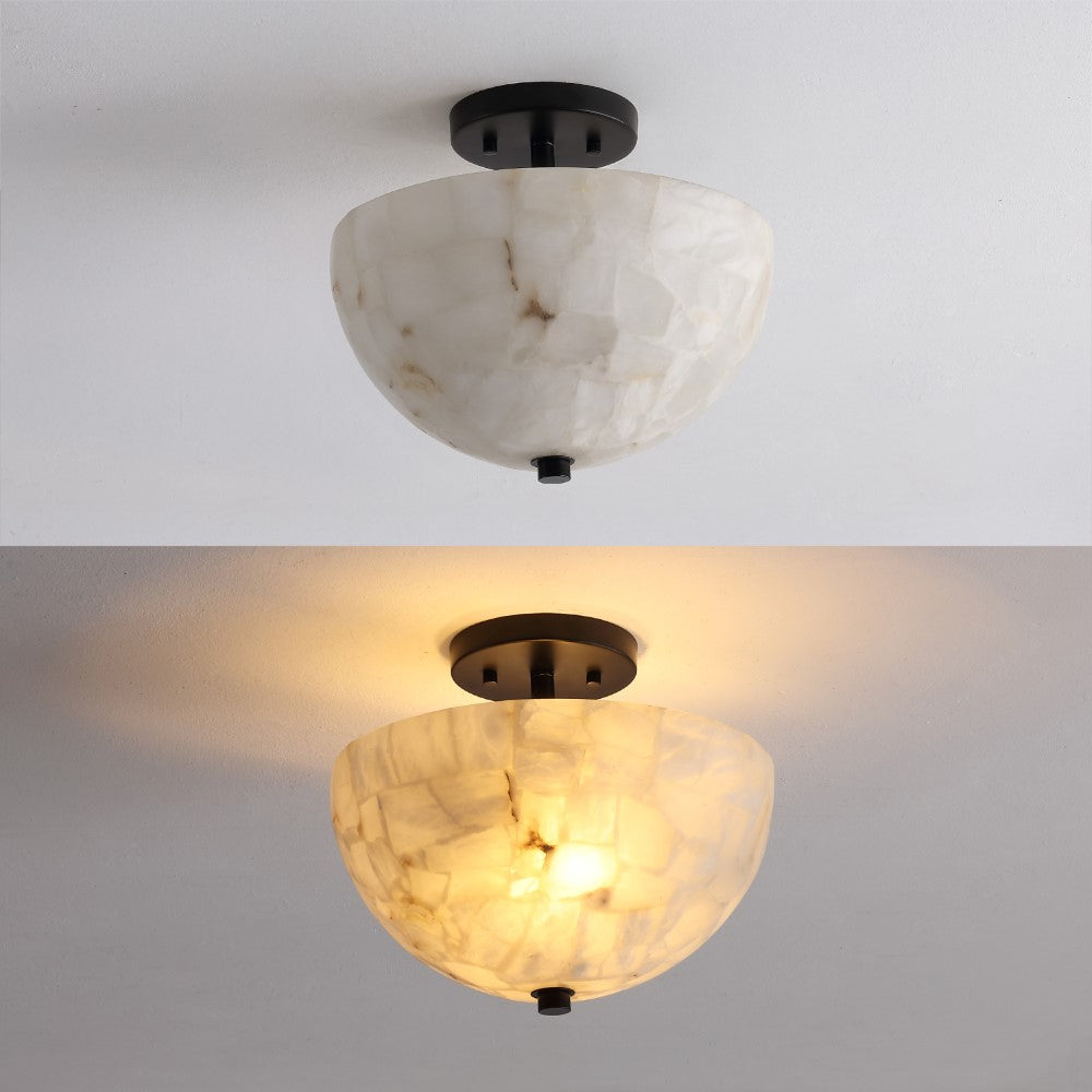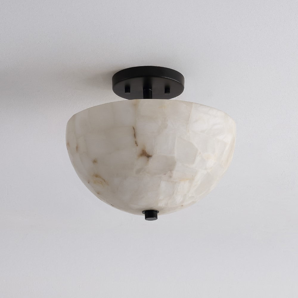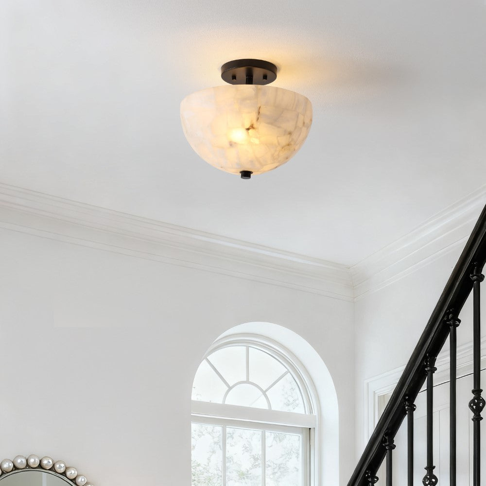 Our modern take on a domed ceiling fixture combines refined finishes with an understated semi-flush design. The alabaster shade conceals a warm LED bulb; its complemented by a simple round base. This ceiling light brings traditional style to the hallway, bedroom, bathroom, or even a closet.