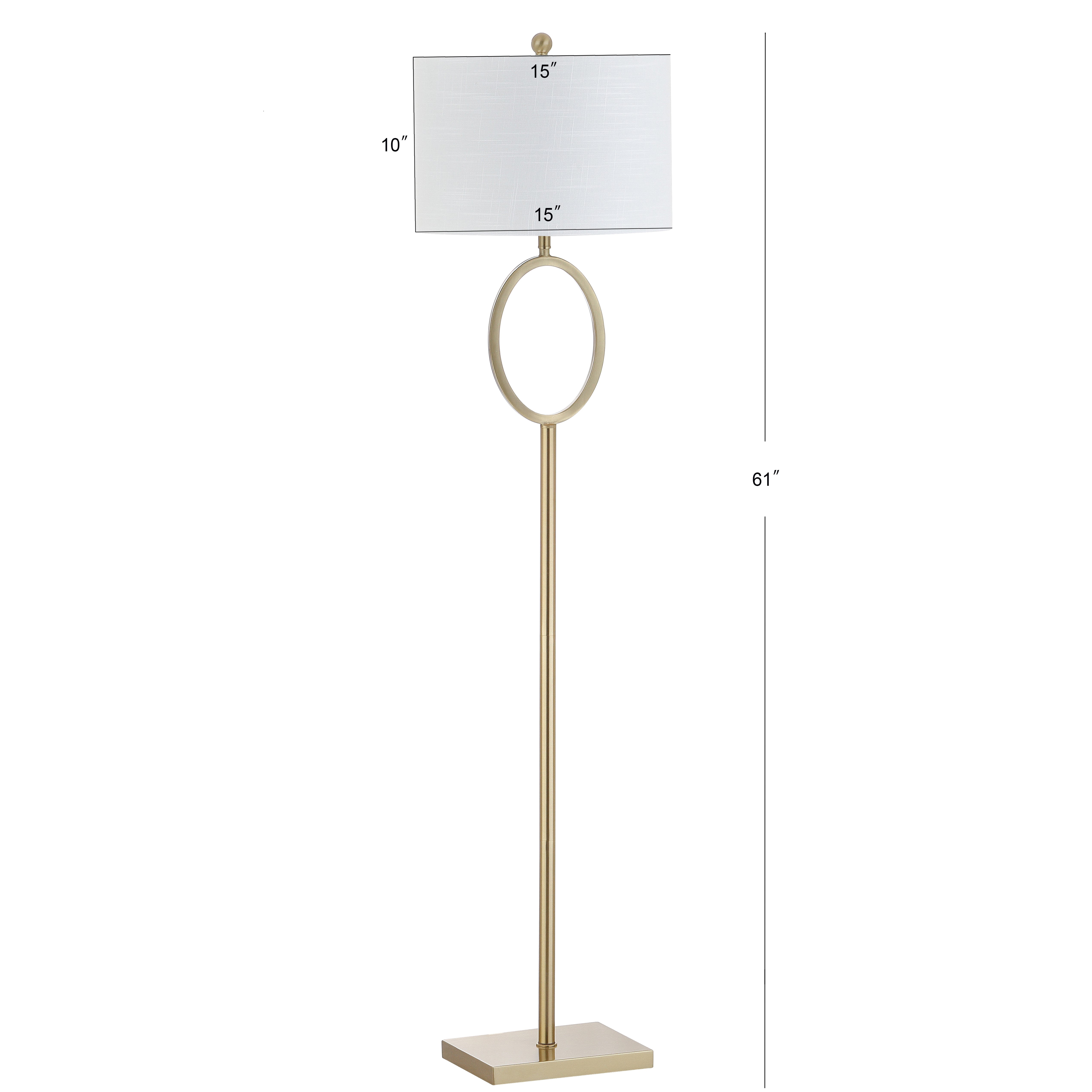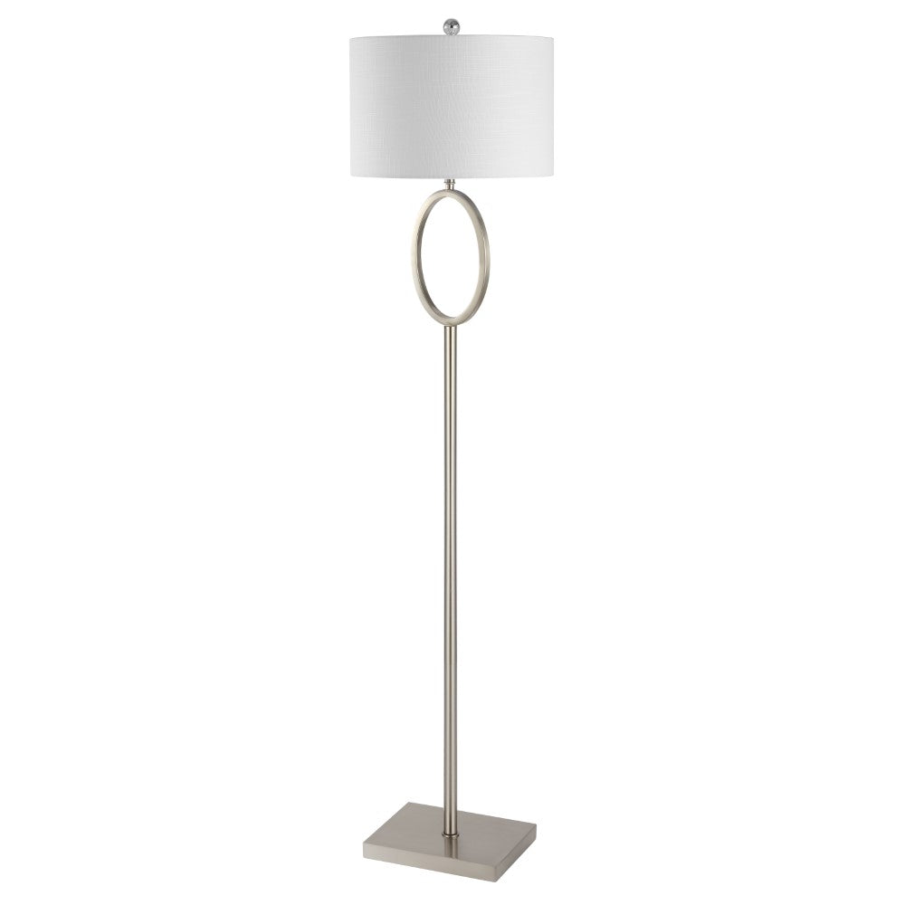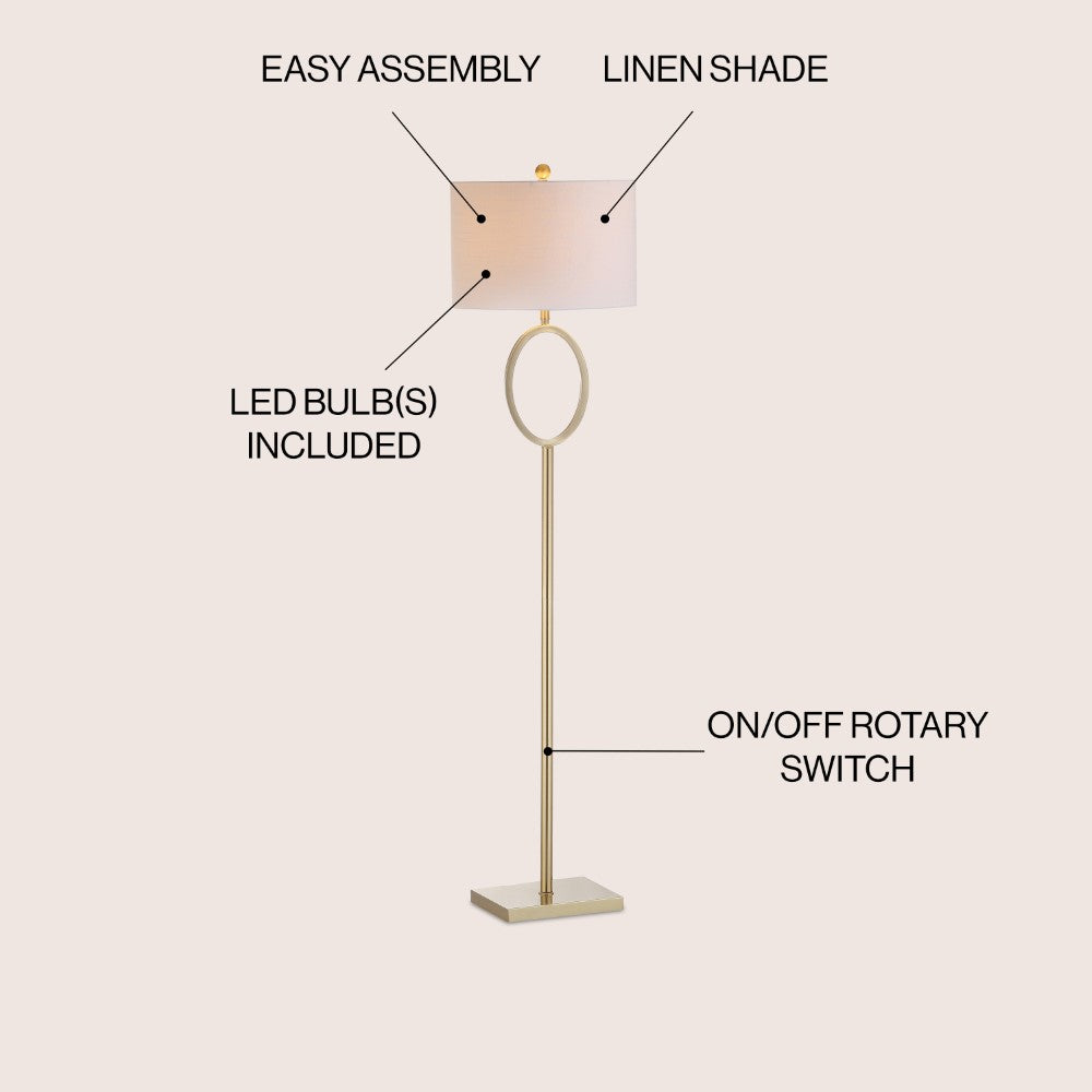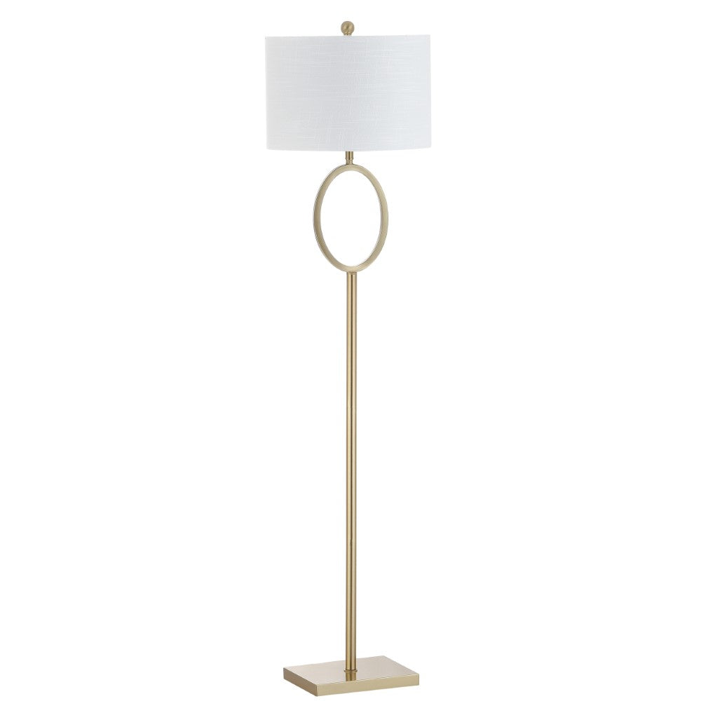 - Standard brass floor lamp base is punctuated with a stylish hoop design