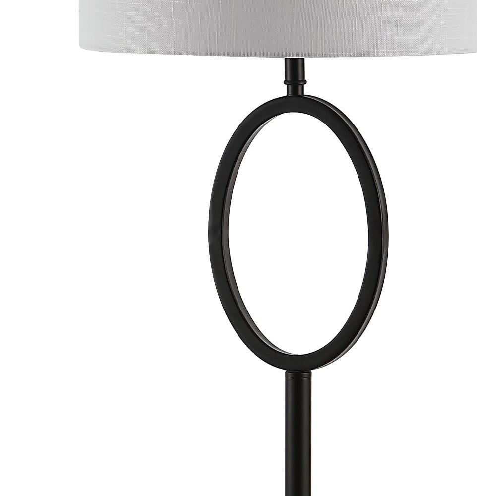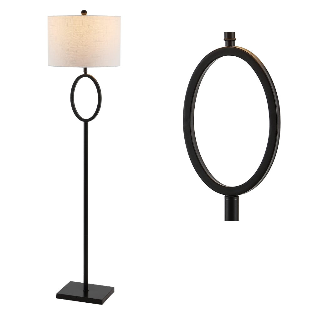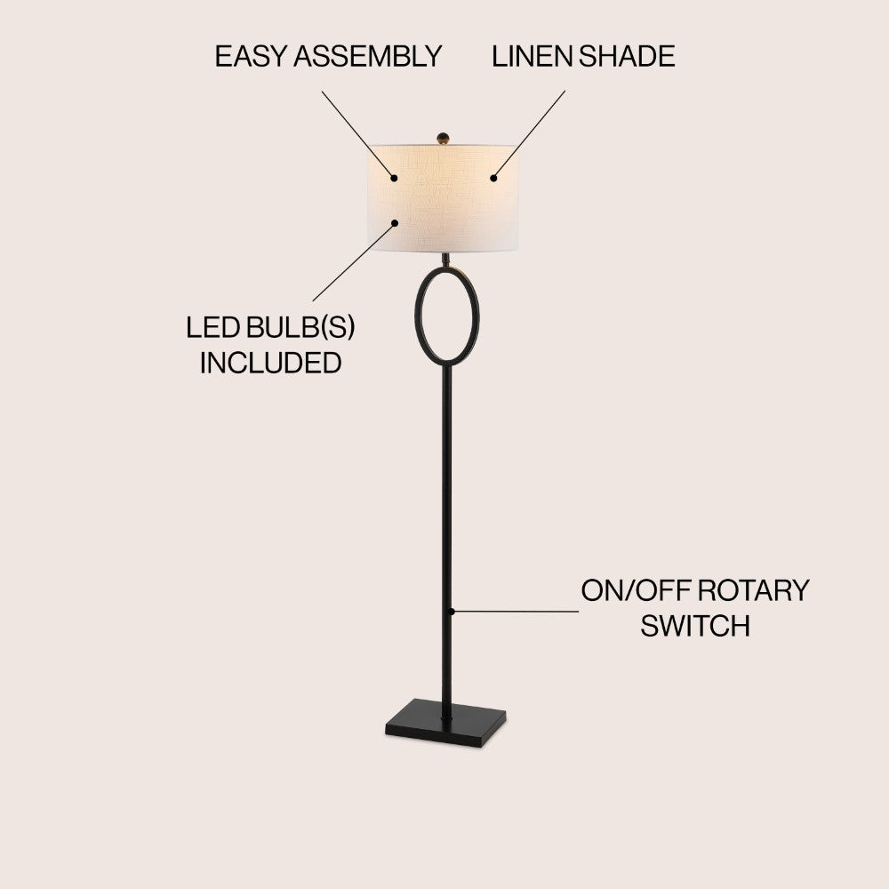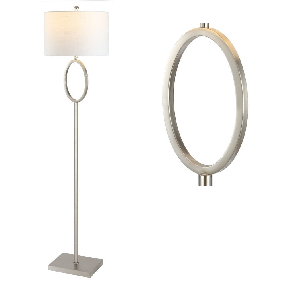 - Standard brass floor lamp base is punctuated with a stylish hoop design