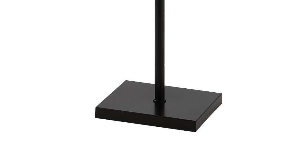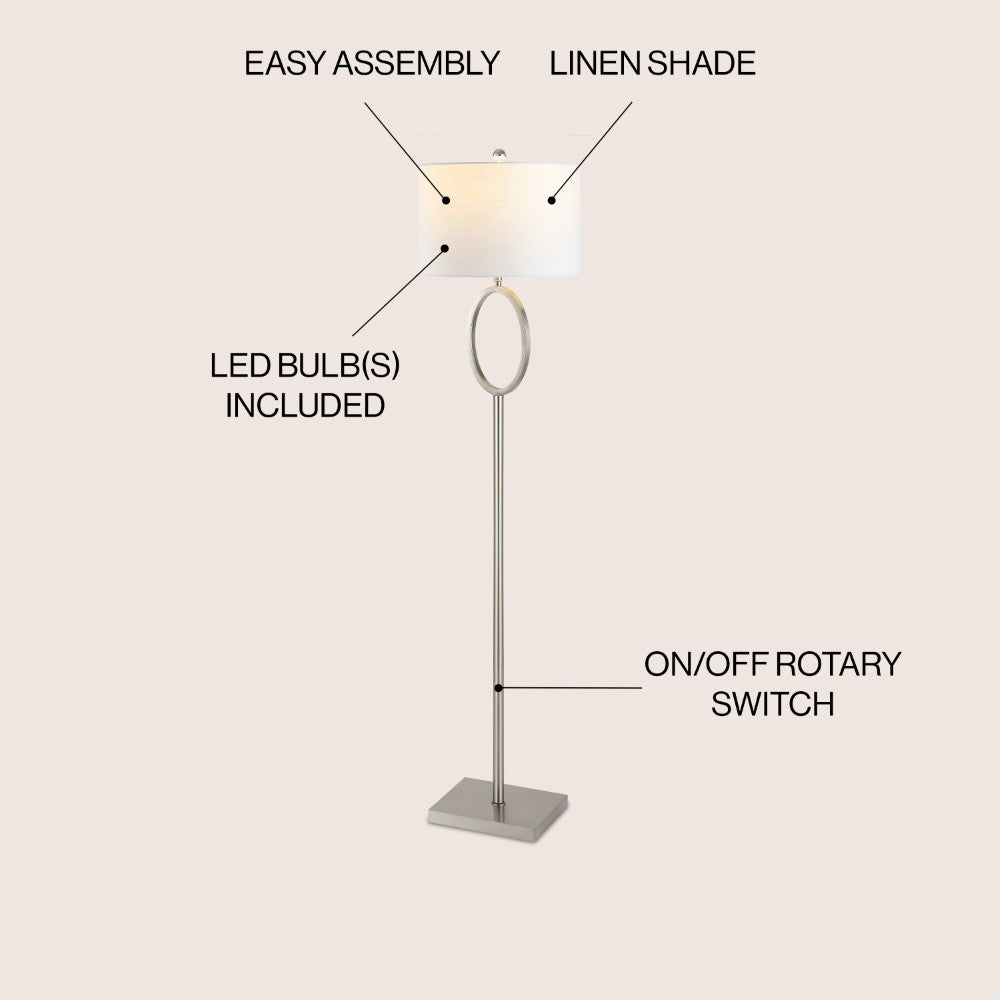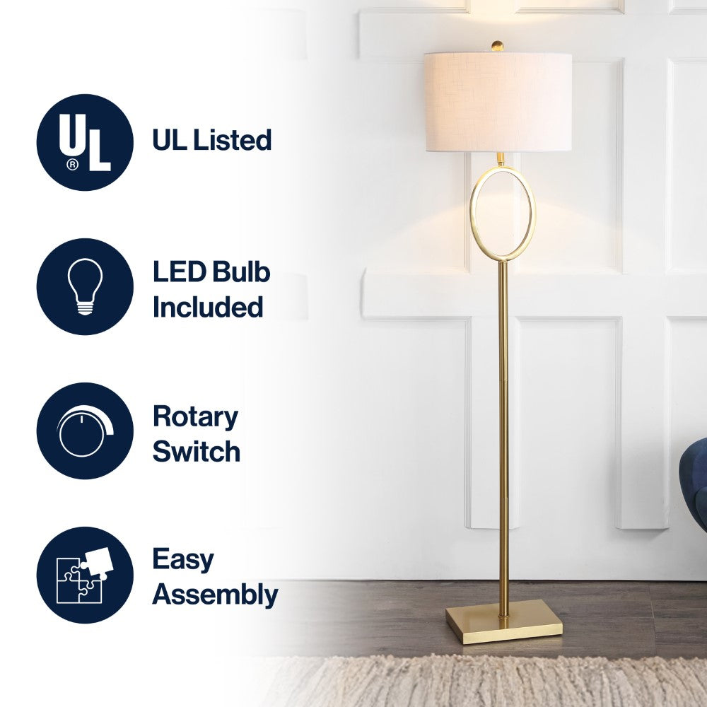 Supported by a square metal base, this floor lamp shows off a slender brass-plated body that's punctuated with a dynamic hoop detail. A crisp cotton drum shade and silk-wrapped cord complete the piece. Great for extra reading light next to a sofa or chair.