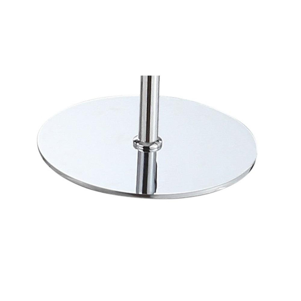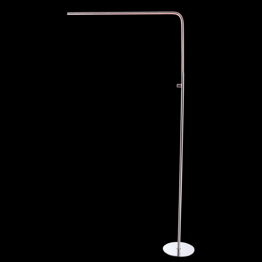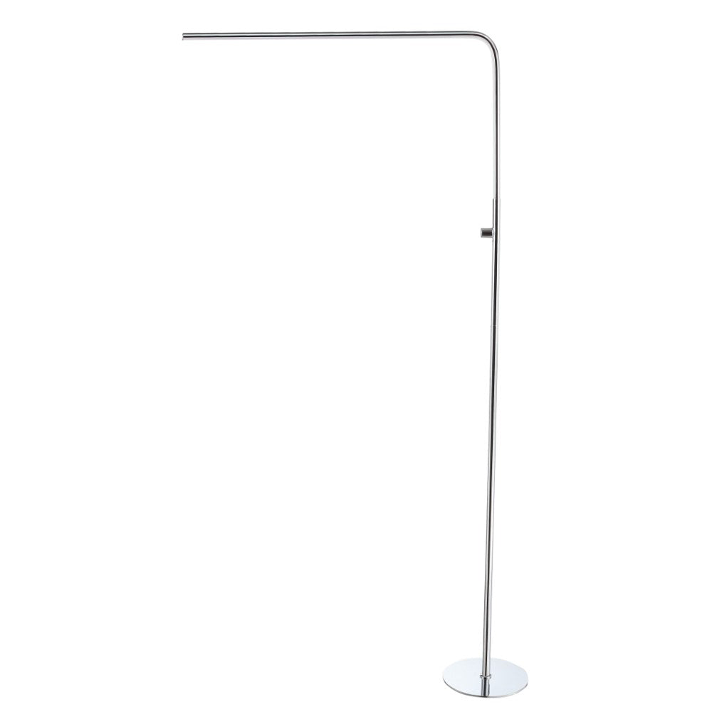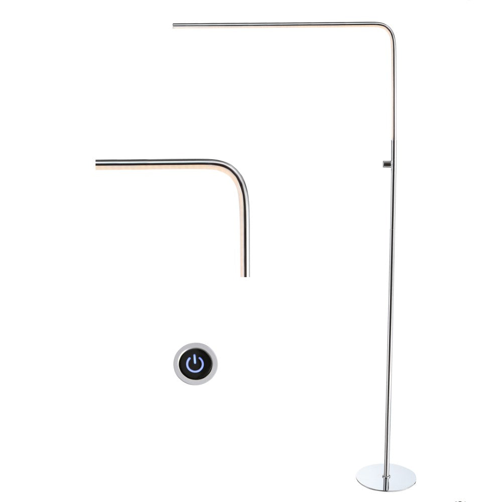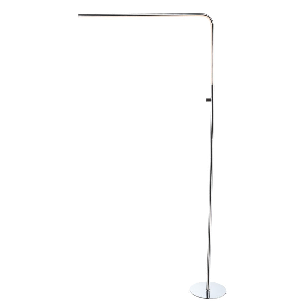 This sleek, minimalist, energy-saving LED floor lamp has an updated pharmacy floor lamp design. Finished in gleaming chrome, it has a wide, slender, arm that can be rotated over your position for reading. A simple round base anchors this stylish task lamp to the floor.