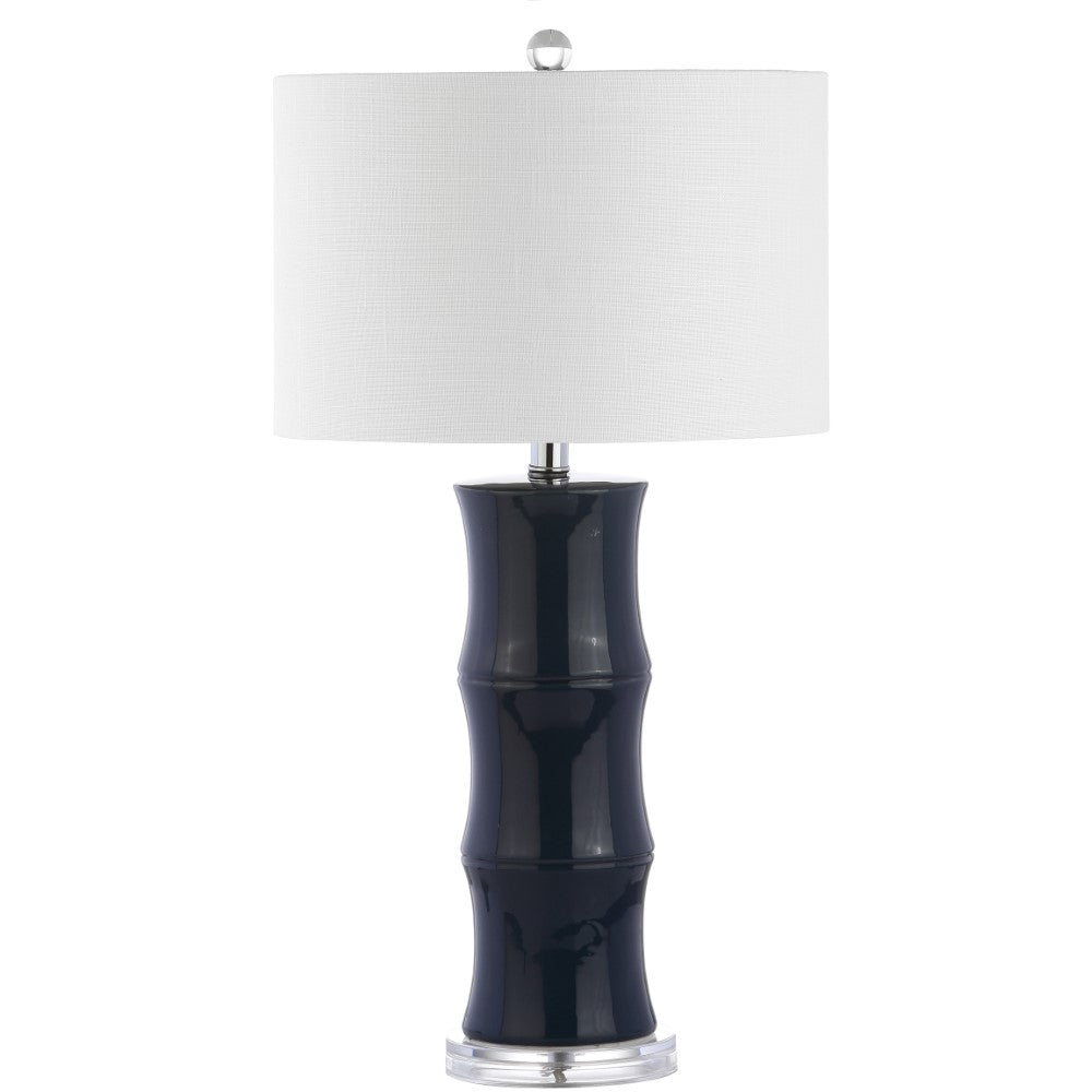 This eye-catching navy ceramic table lamp takes its inspiration from the beauty of natural bamboo. The resulting look is a perfect balance between Asian and modern styles, with a preppy flair. Nickel accents, a crystal base and a white cotton drum shade keep the look contemporary and fresh.