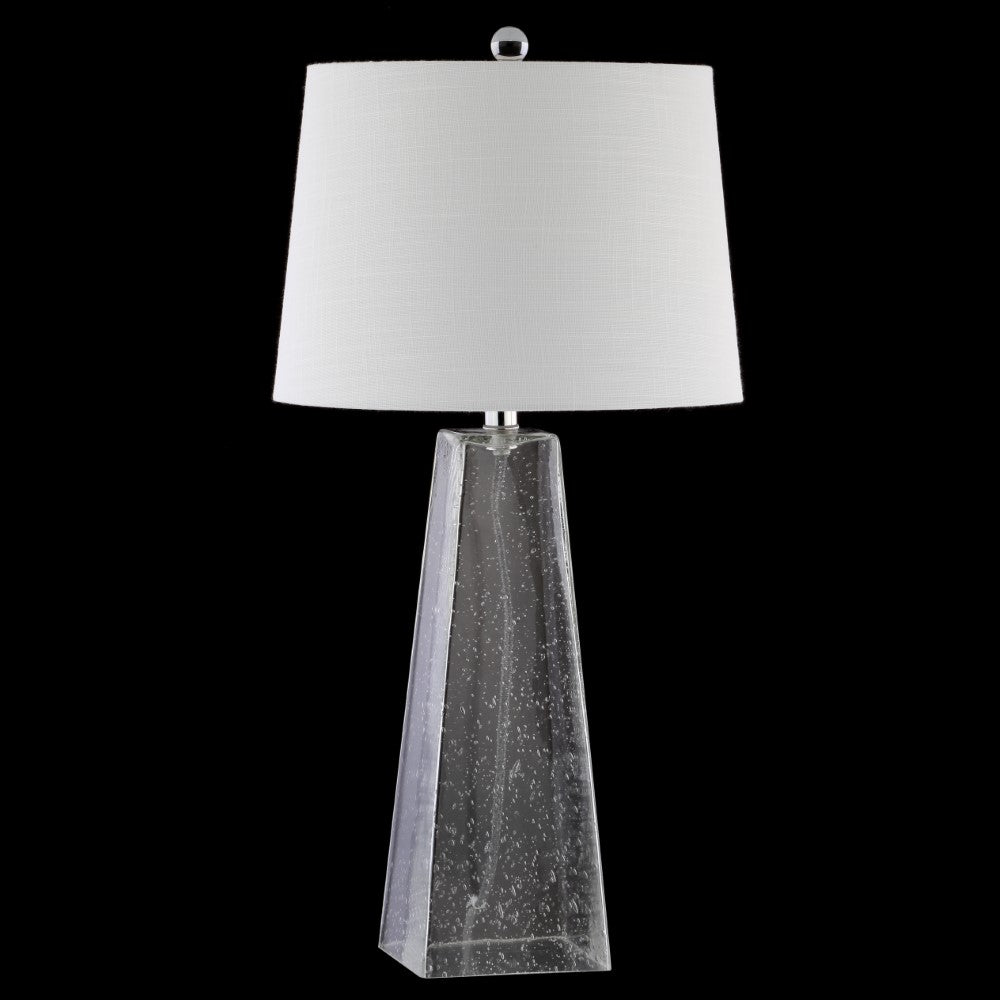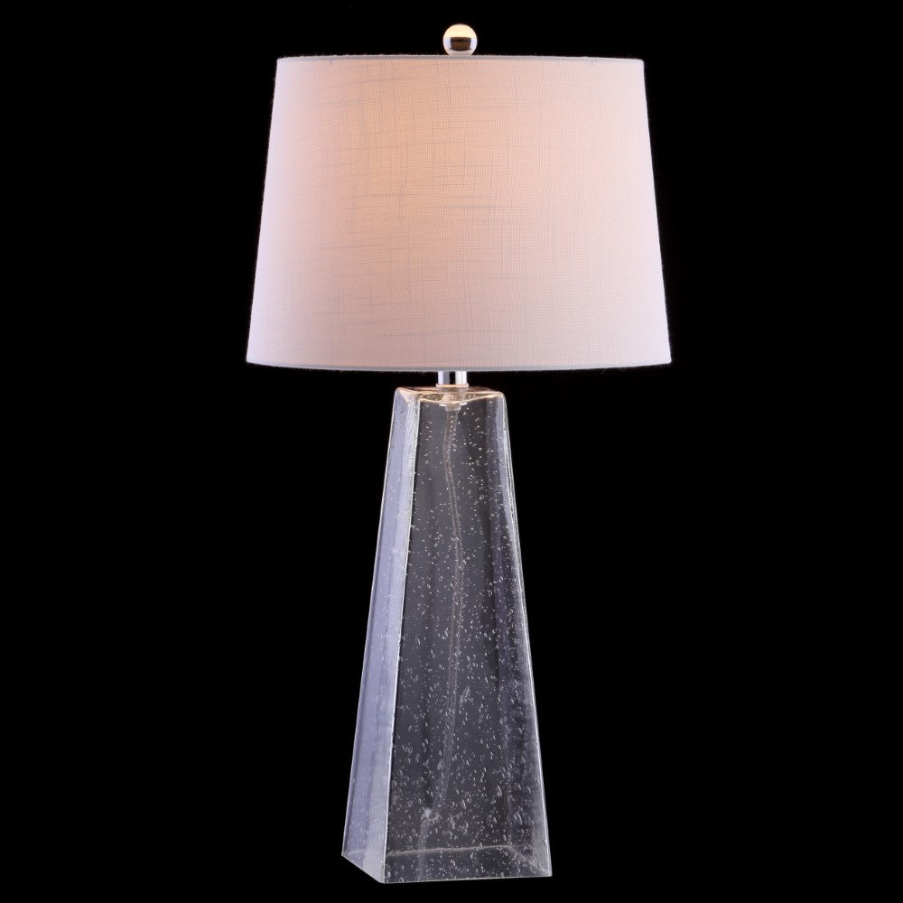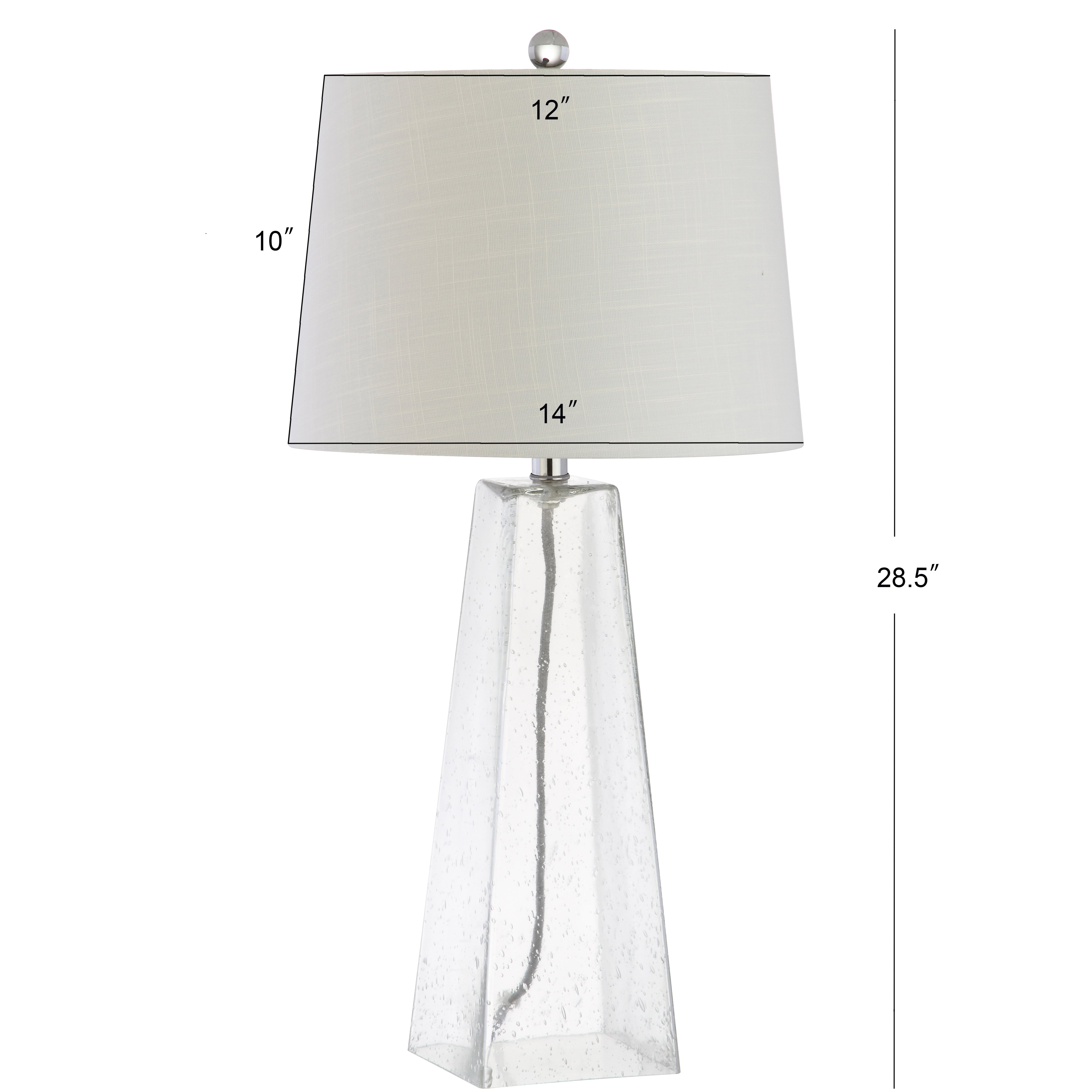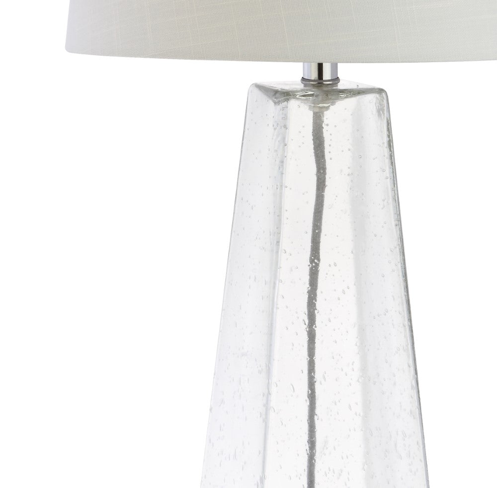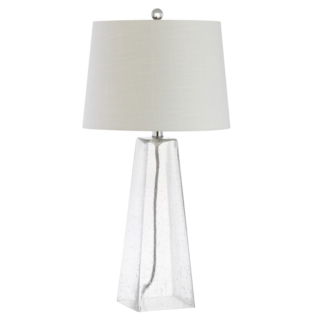 Clear glass and a gently tapered base give this contemporary column table lamp simple, modern style. Paired with a slightly tapered drum shade to match the lean of the base, the proportions are perfectly paired to create a look that is both simple and elegant. Finished with a silk-wrapped cord that falls through the center, the subtle design elements of this classic style are sure to stun in any space.