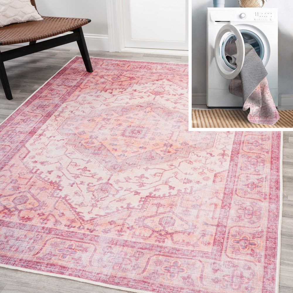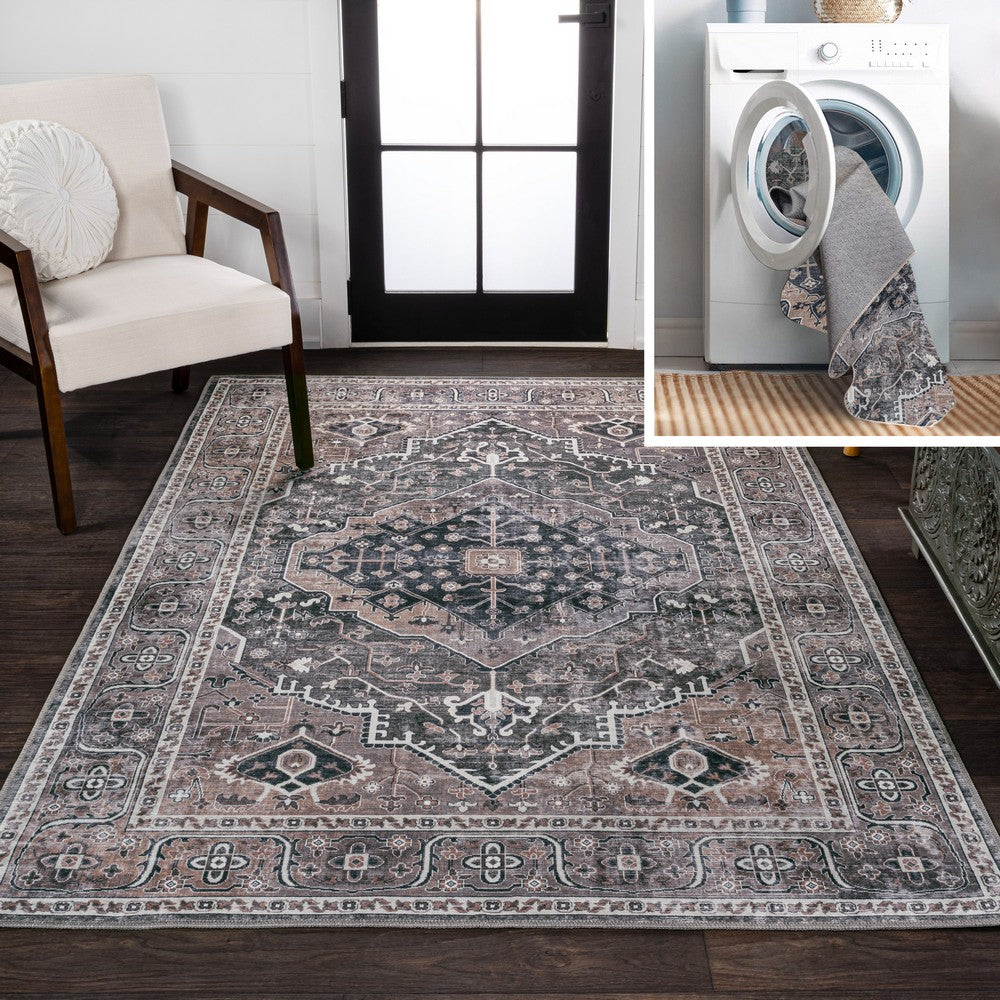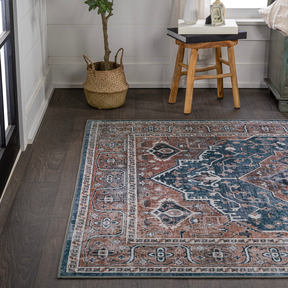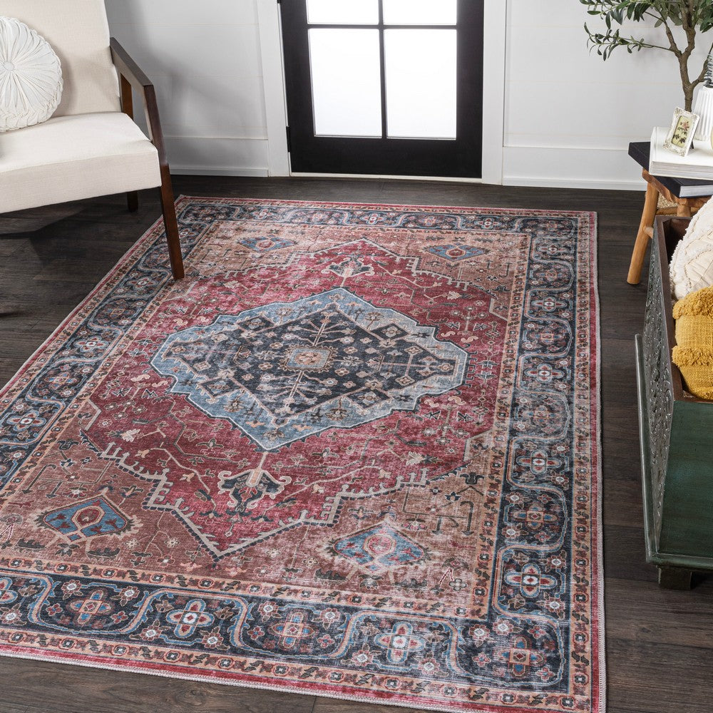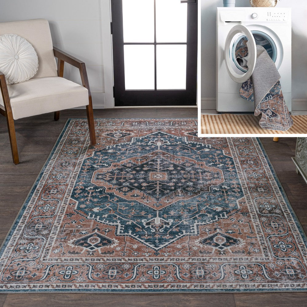 The ornate ogee medallion in the center of this rug recalls ancient Persian rug designs. Updated colors add a modern Bohemian-inspired twist to a classic design. With its pet-friendly pattern, this easy-care rug would be perfect for a dining room, living room, entry, bedroom or porch.