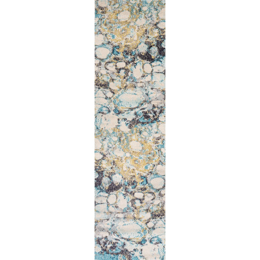 Inspired by the colorful abstract designs of marbled papers, this bold rug has a modern, coastal vibe. Deep blue and accents of gold swirl around pebble-gray elements. This unique rug's overall pattern makes it perfect for homes with kids and pets. It's the perfect centerpiece for a mid-century modern, contemporary, beach house or minimalist interior.