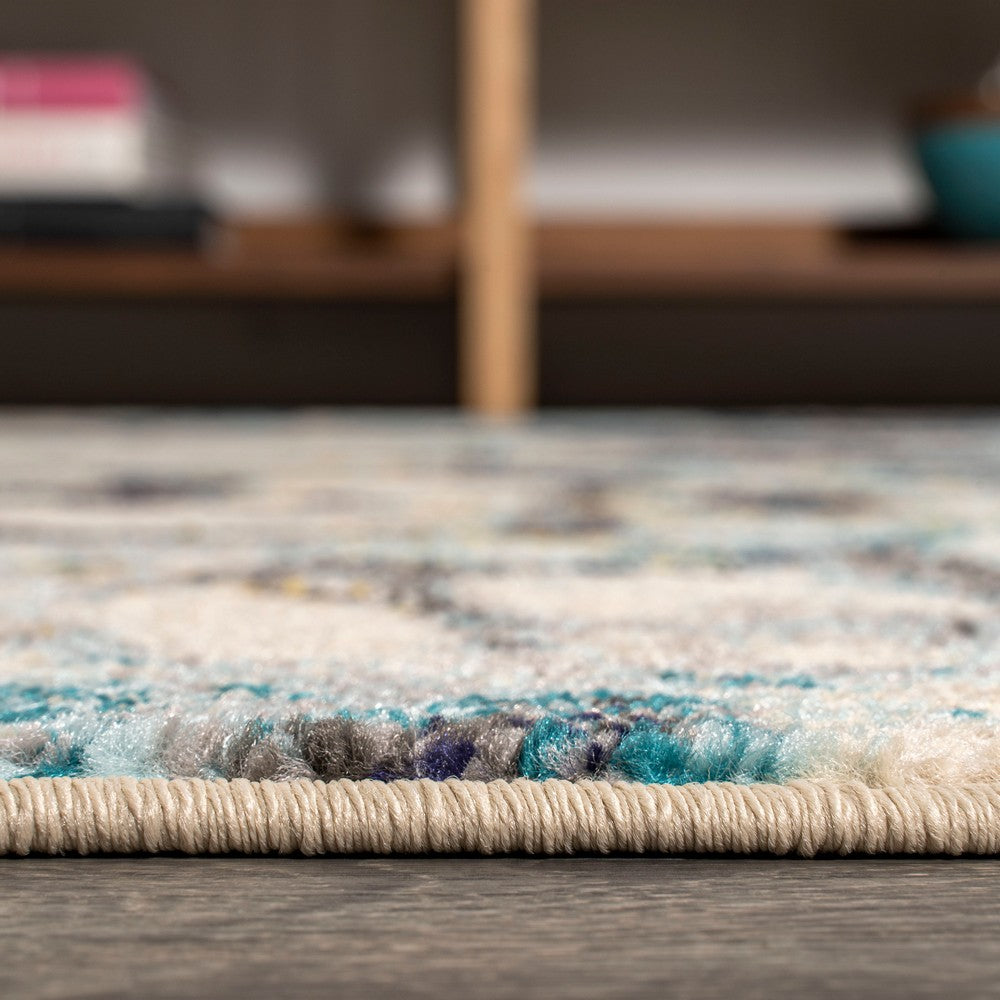 - Deep blue, mingled against a soft gray and ivory with gold accents, give this rug its modern abstract look
