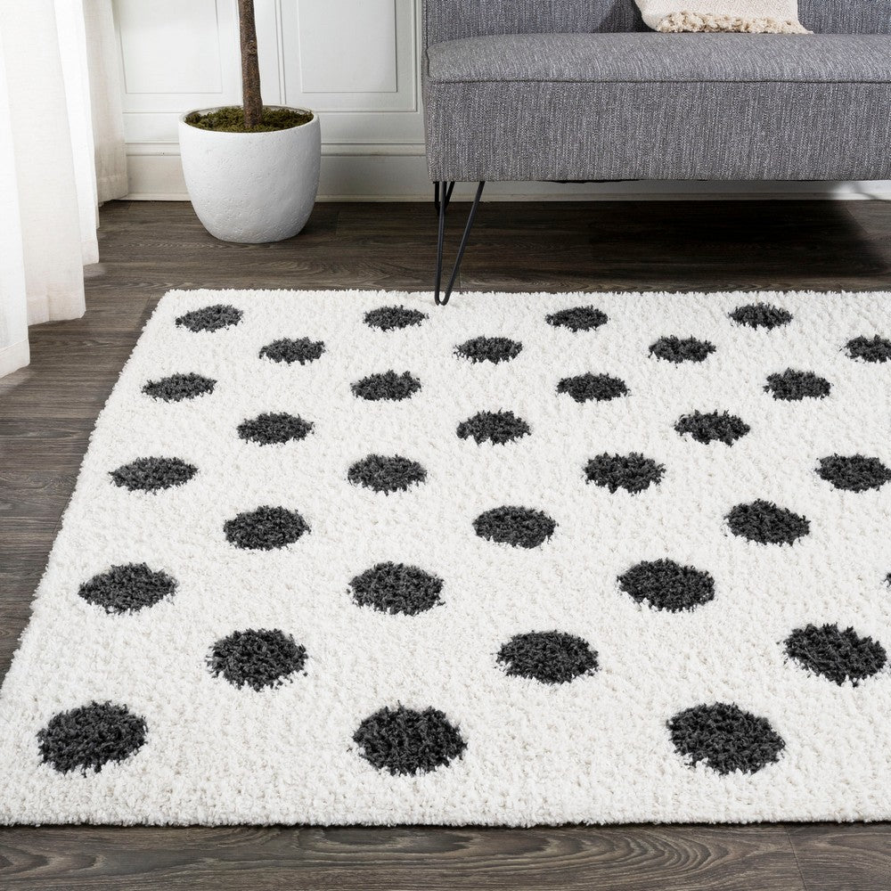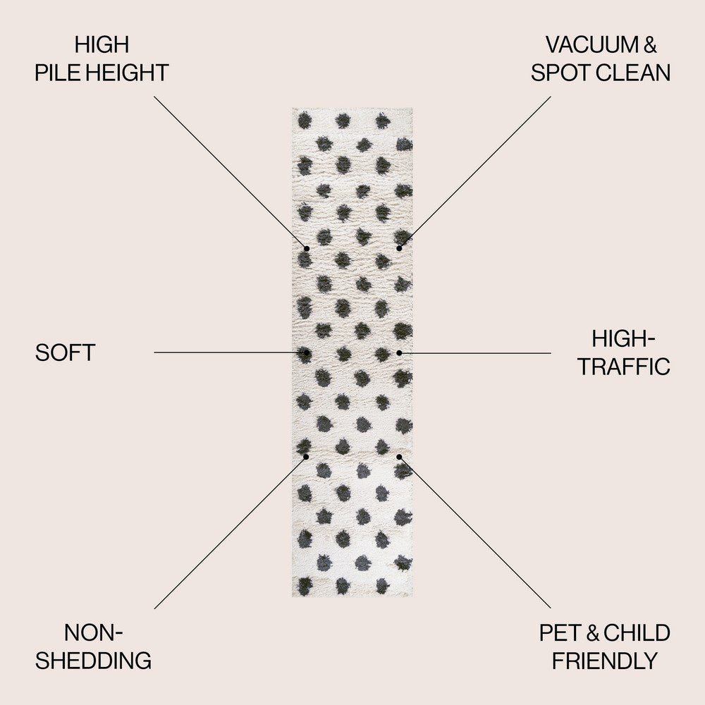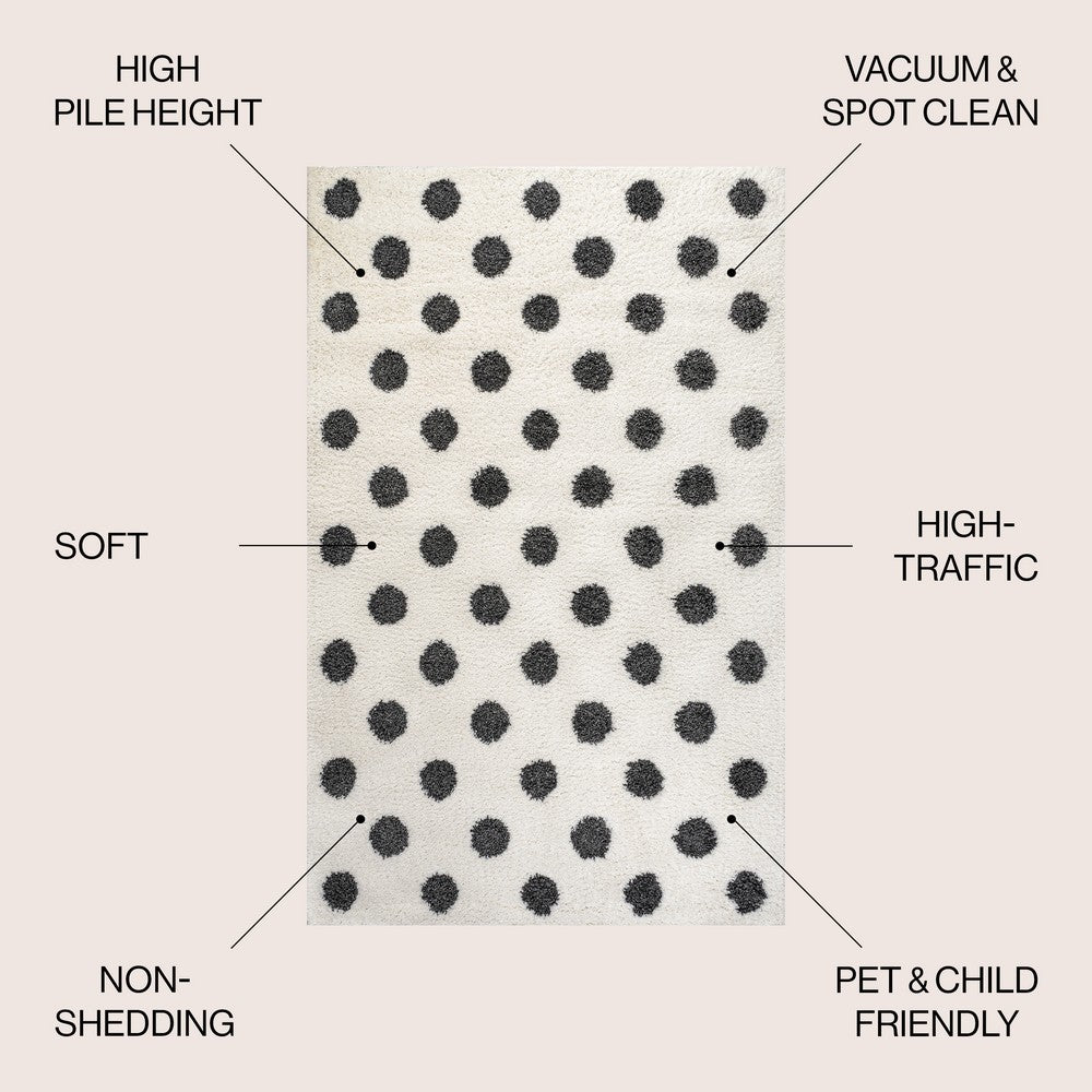 Inspired by mid-century rugs, our polka dot rug has a soft, low shag pile. The all-over pattern is woven in black on an ivory background. Add some graphic punch to your living room, bedroom, or reading nook with this easy-care rug.
