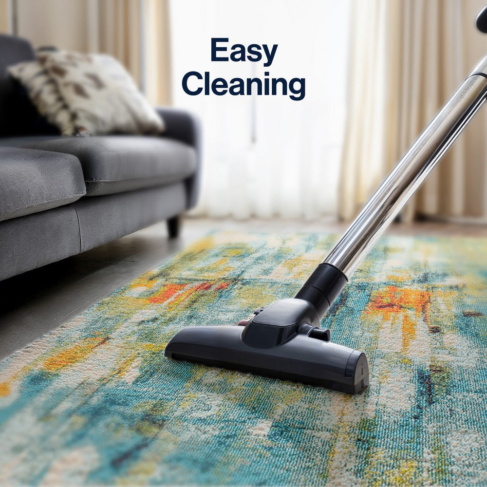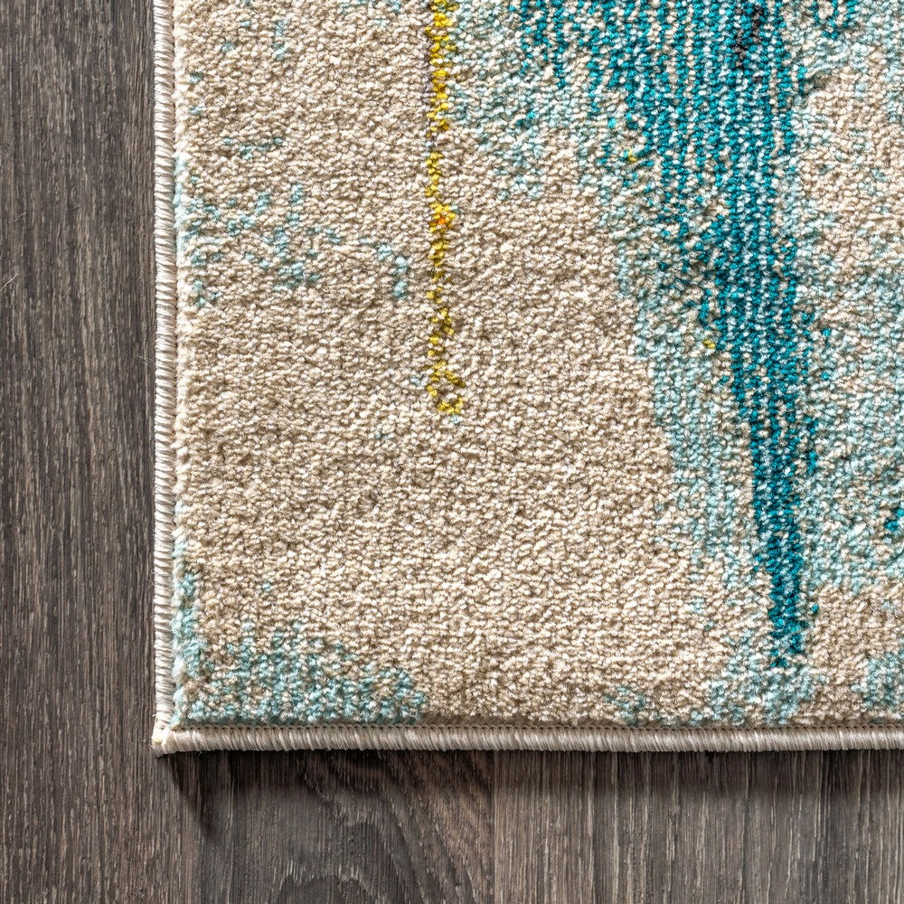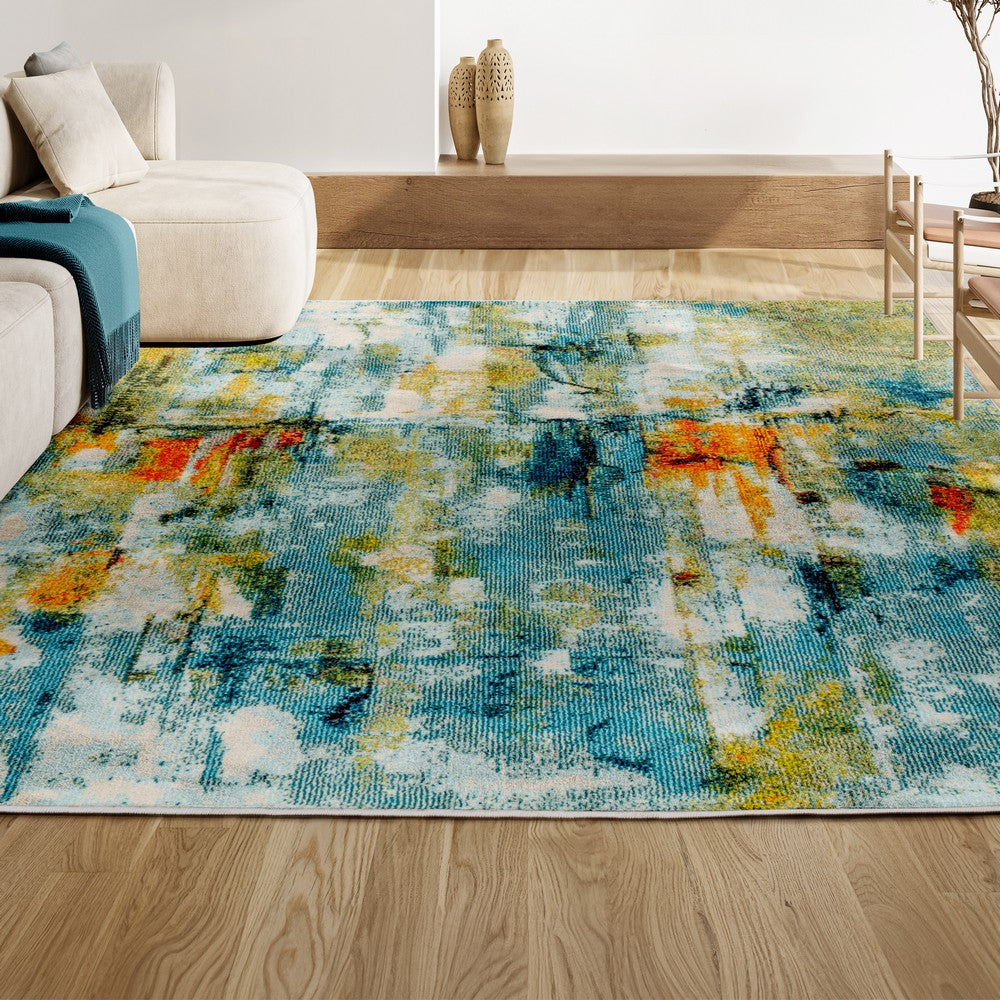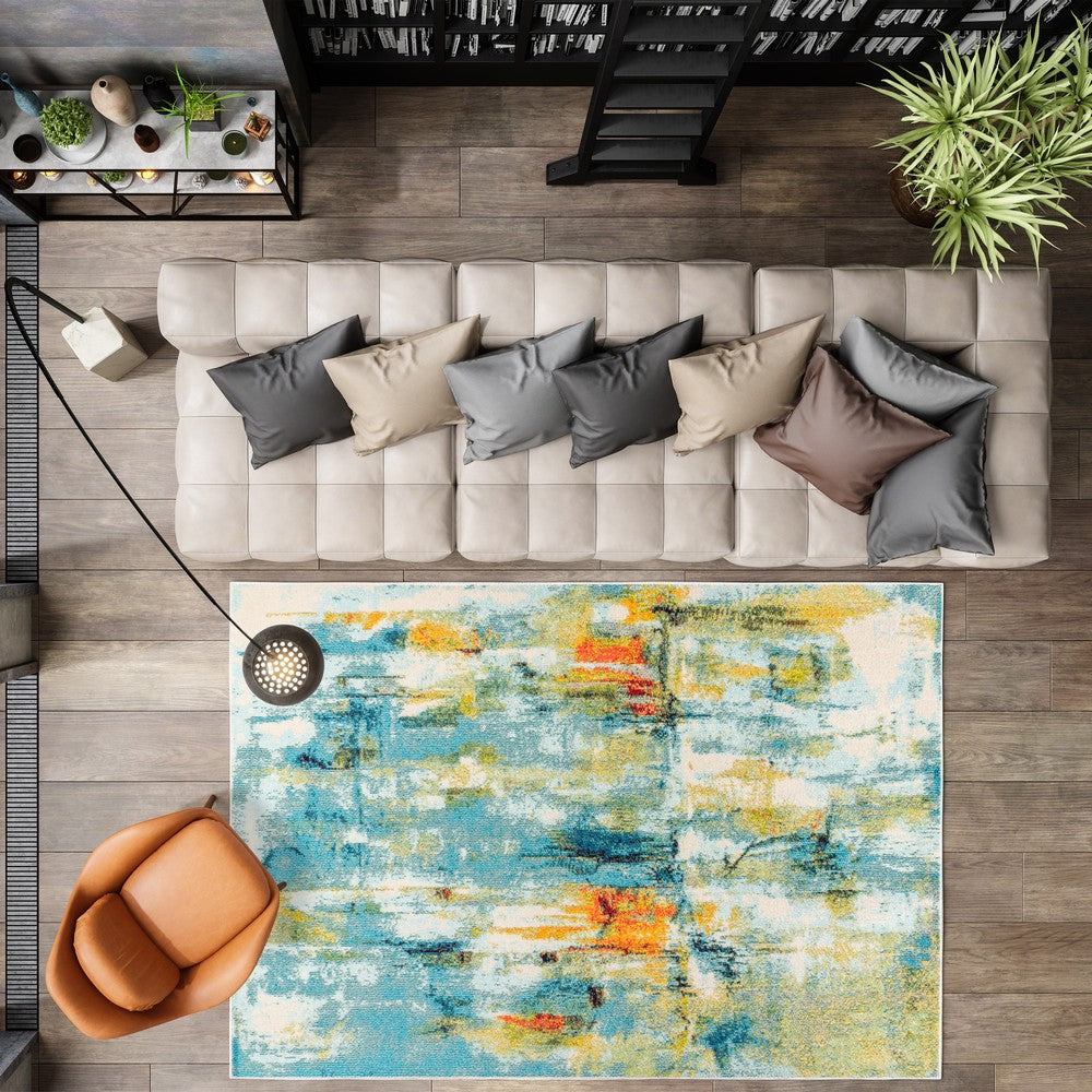 If rugs are truly "art for your floors" than this abstract contemporary piece is a perfect painterly addition to any modern space. Befitting a museum wall, its high style is matched by the durability and versatility of its power loomed polypropylene design. In shades of aqua, turquoise, yellow, orange, and black, its lively mélange of brushstrokes will give new life to your decor.
