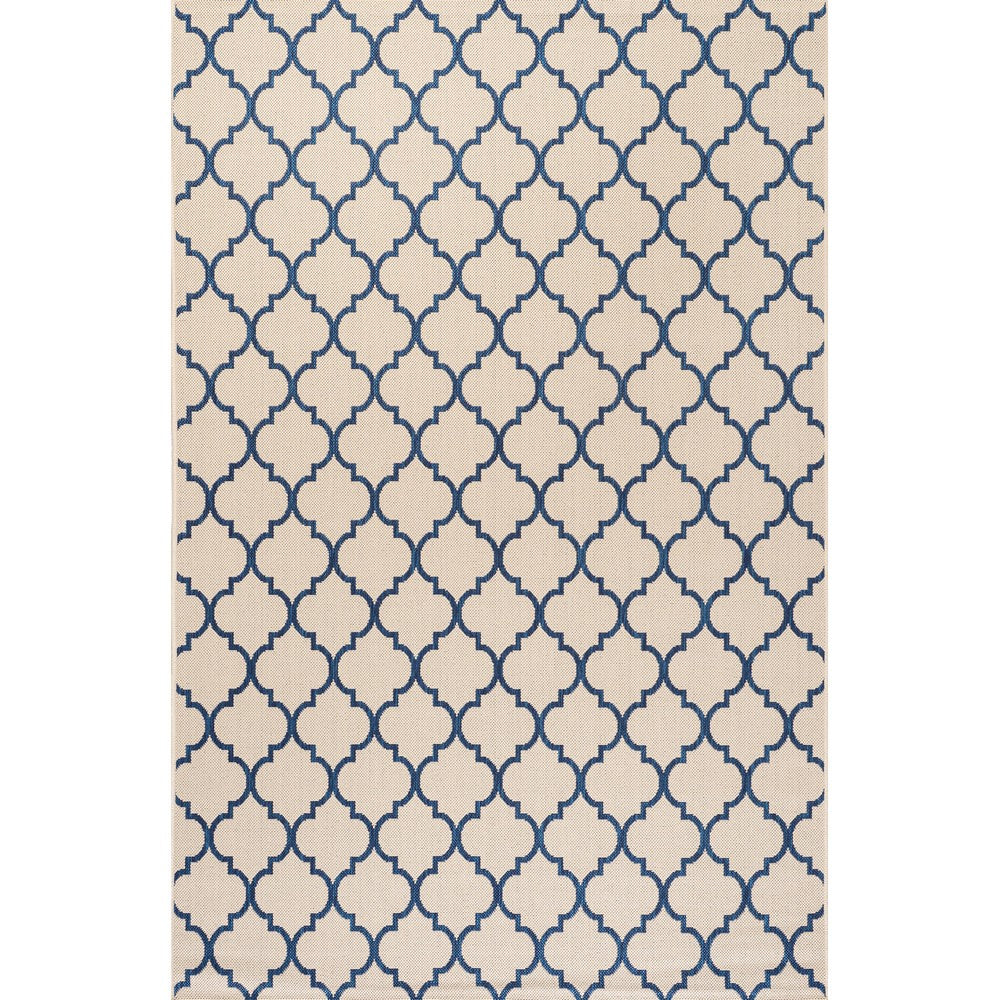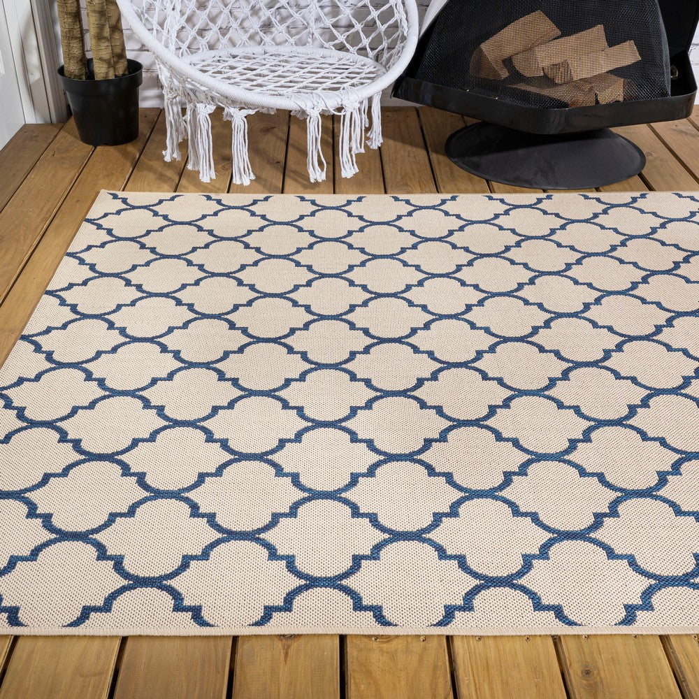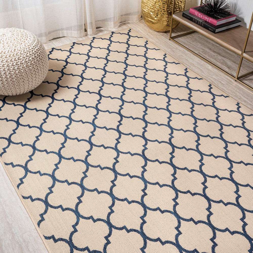 Inspired by the tile floors of Morocco, this indoor/outdoor rug adds elegant pattern to your porch, patio or sunroom. The ogee-curved trellis woven in navy adds graphic punch to a beige background. Mingled threads give this pattern a handwoven, vintage vibe that's perfect for an entry, kitchen, hallway, living room or bedroom too. The pet-friendly and kid-proof flatweave design makes it easy to clean, and perfect for the beach house.