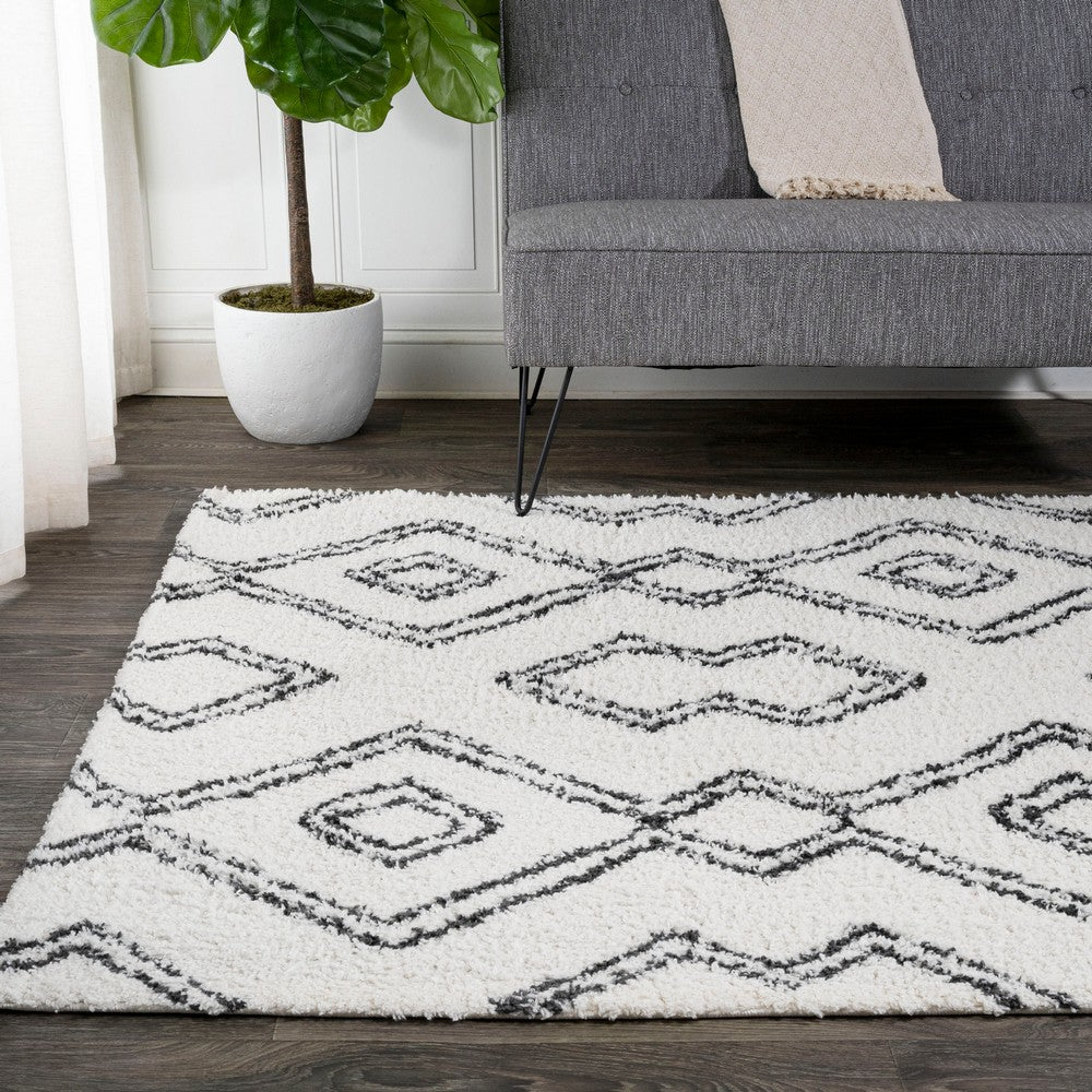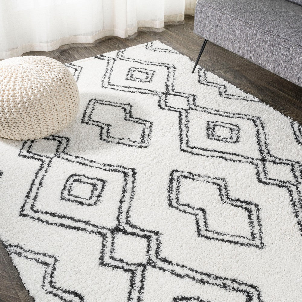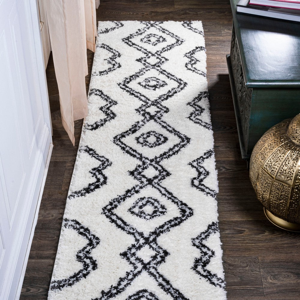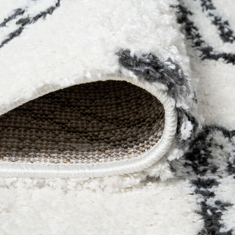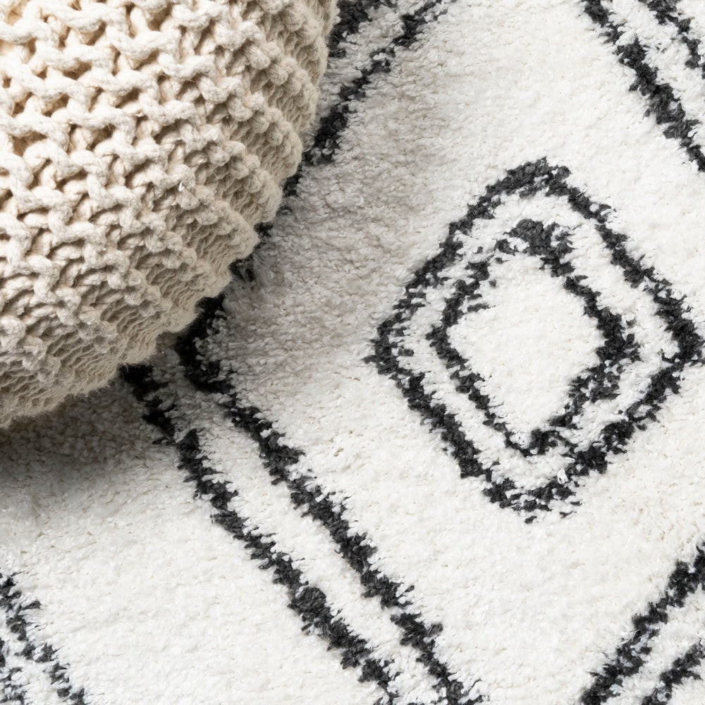 Inspired by vintage Beni Ourain Moroccan rugs, our soft and fluffy shag yarns make it easy to go barefoot. The classic Moroccan pattern has a geometric design of deep black diamonds on a field of ivory. Anchor your Bohemian space; add softness to a bedroom, living room, or cozy reading nook; this is a low-pile shag rug with timeless style.