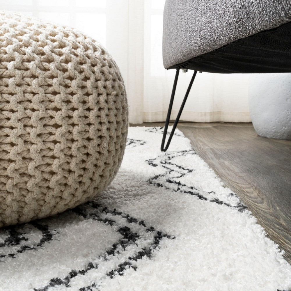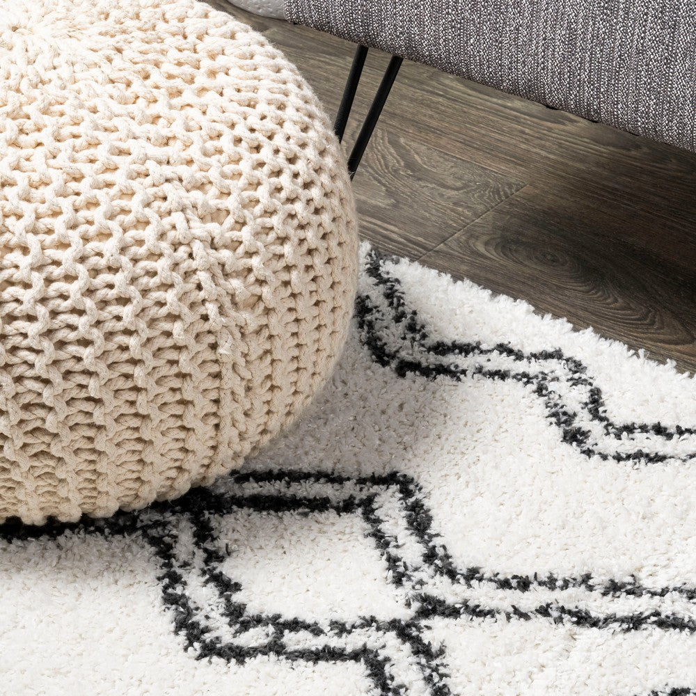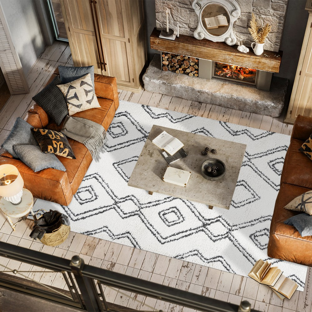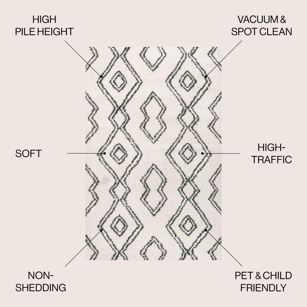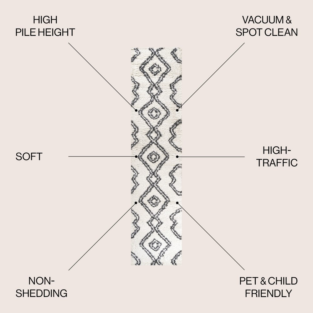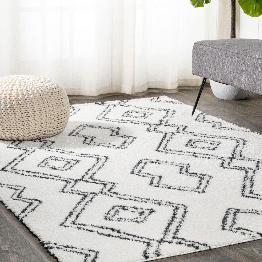 Inspired by vintage Beni Ourain Moroccan rugs, our soft and fluffy shag yarns make it easy to go barefoot. The classic Moroccan pattern has a geometric design of deep black diamonds on a field of ivory. Anchor your Bohemian space; add softness to a bedroom, living room, or cozy reading nook; this is a low-pile shag rug with timeless style.