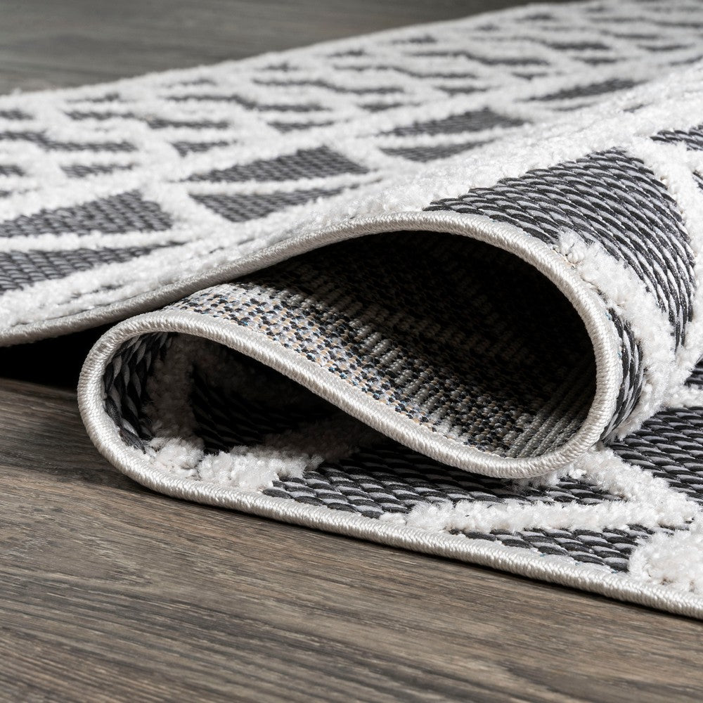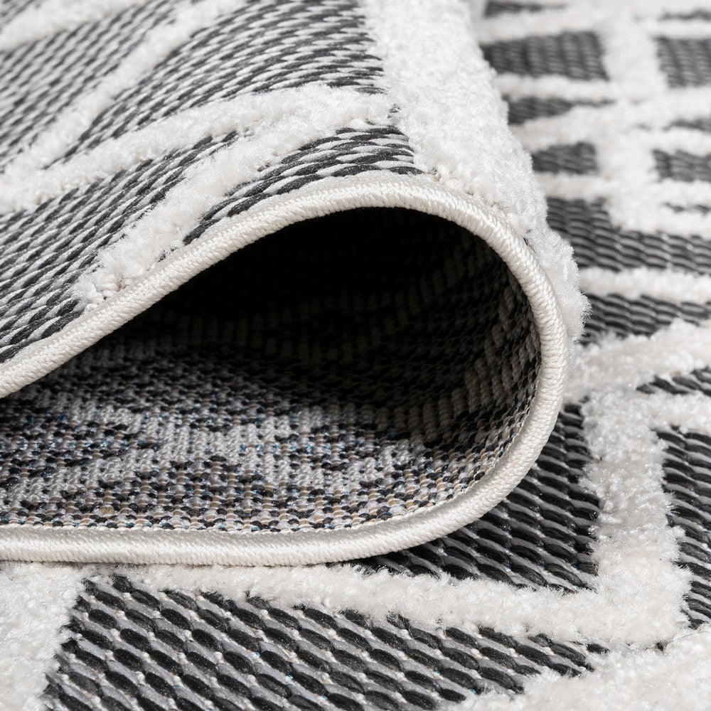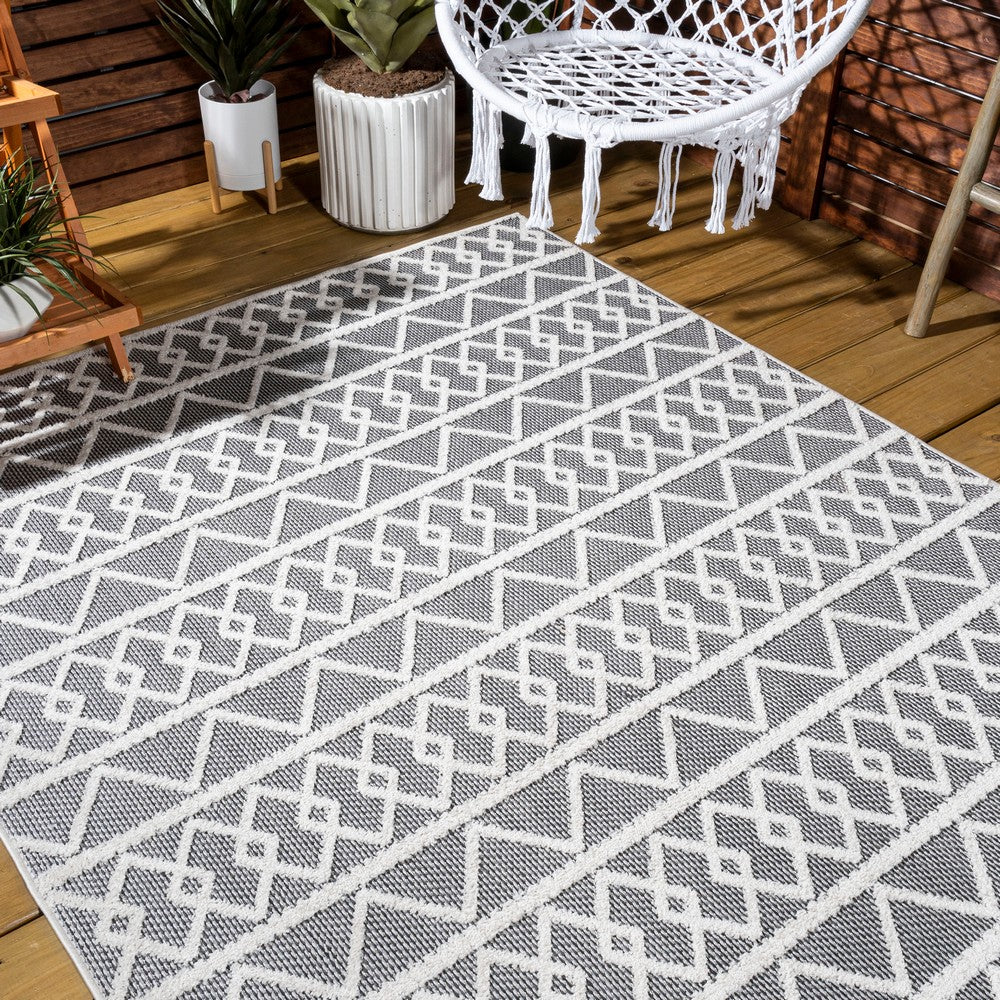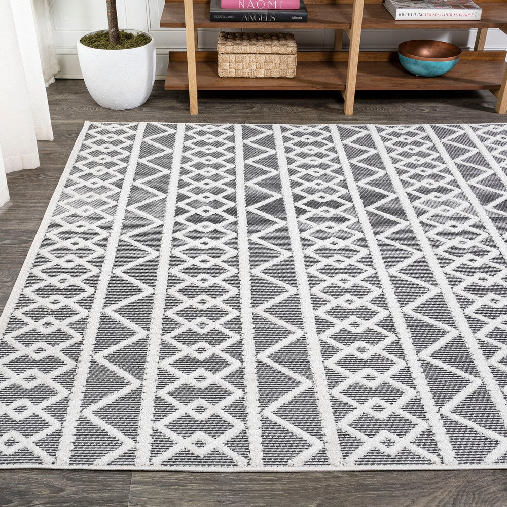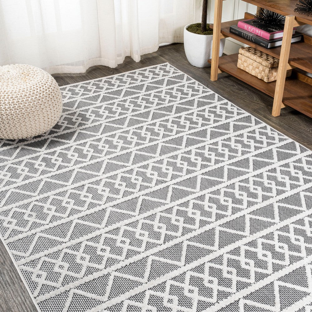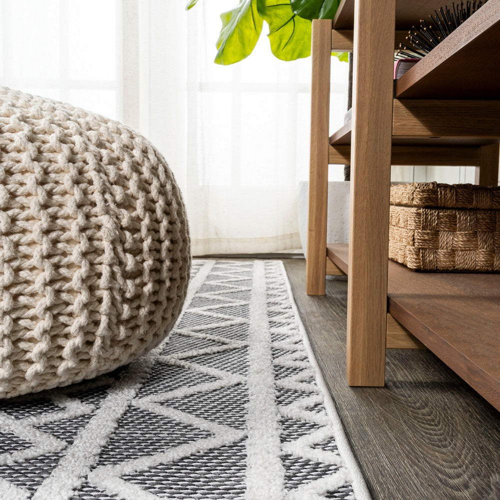 • The deep gray and ivory color scheme is a modern take on neutral geometric rugs