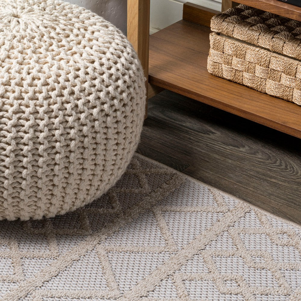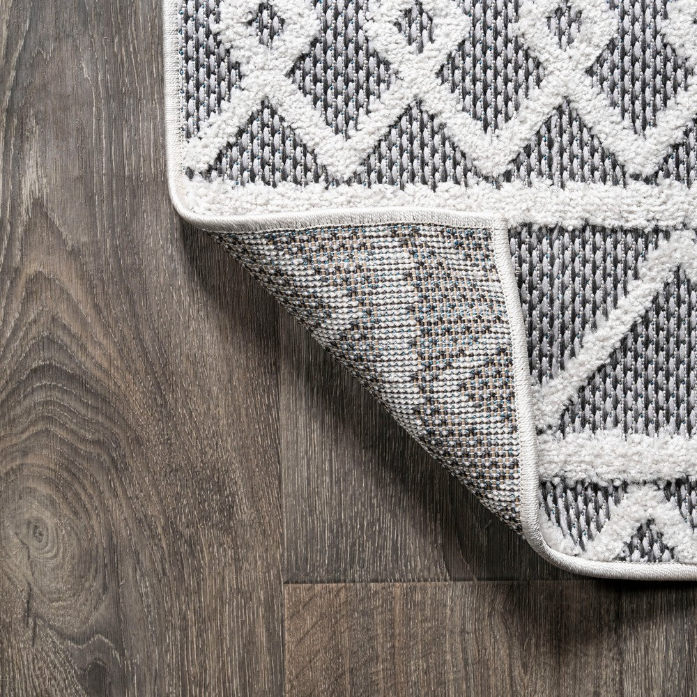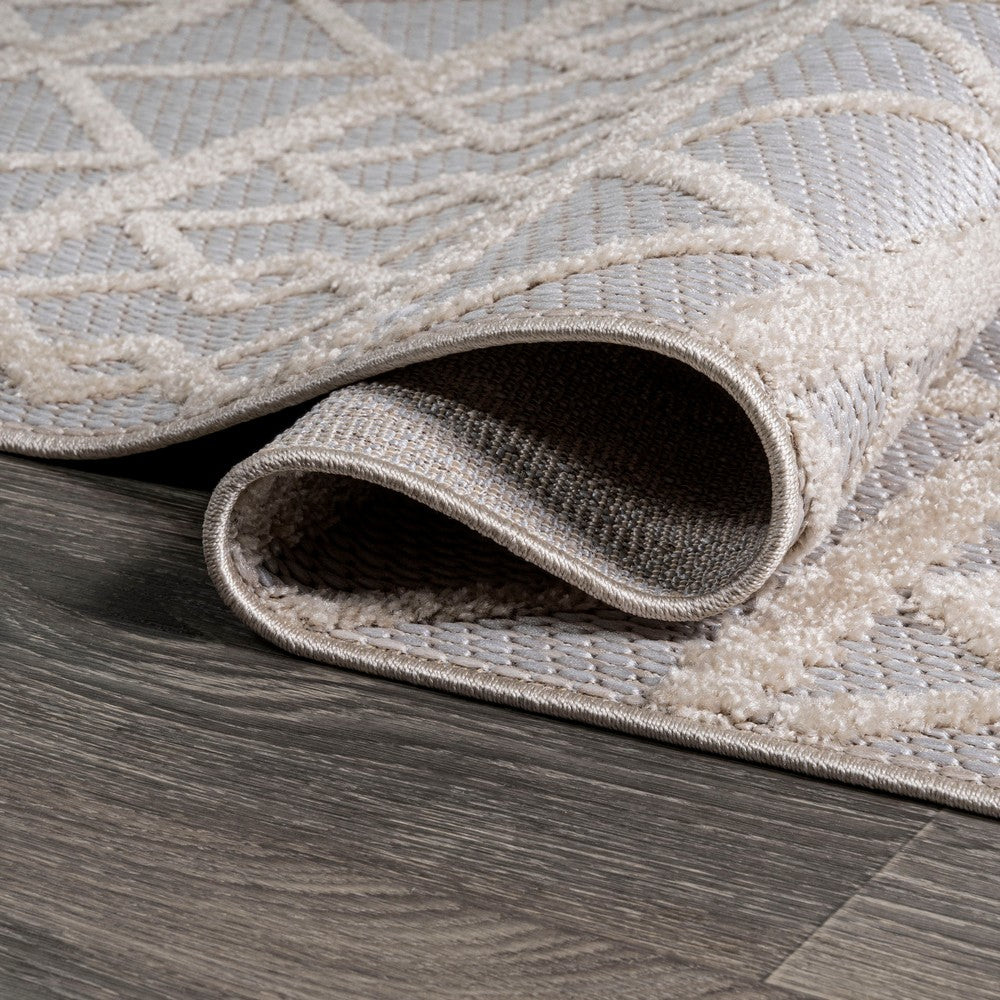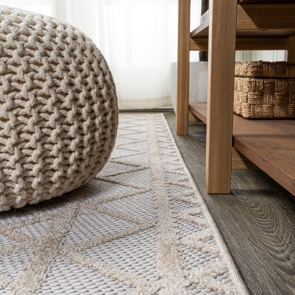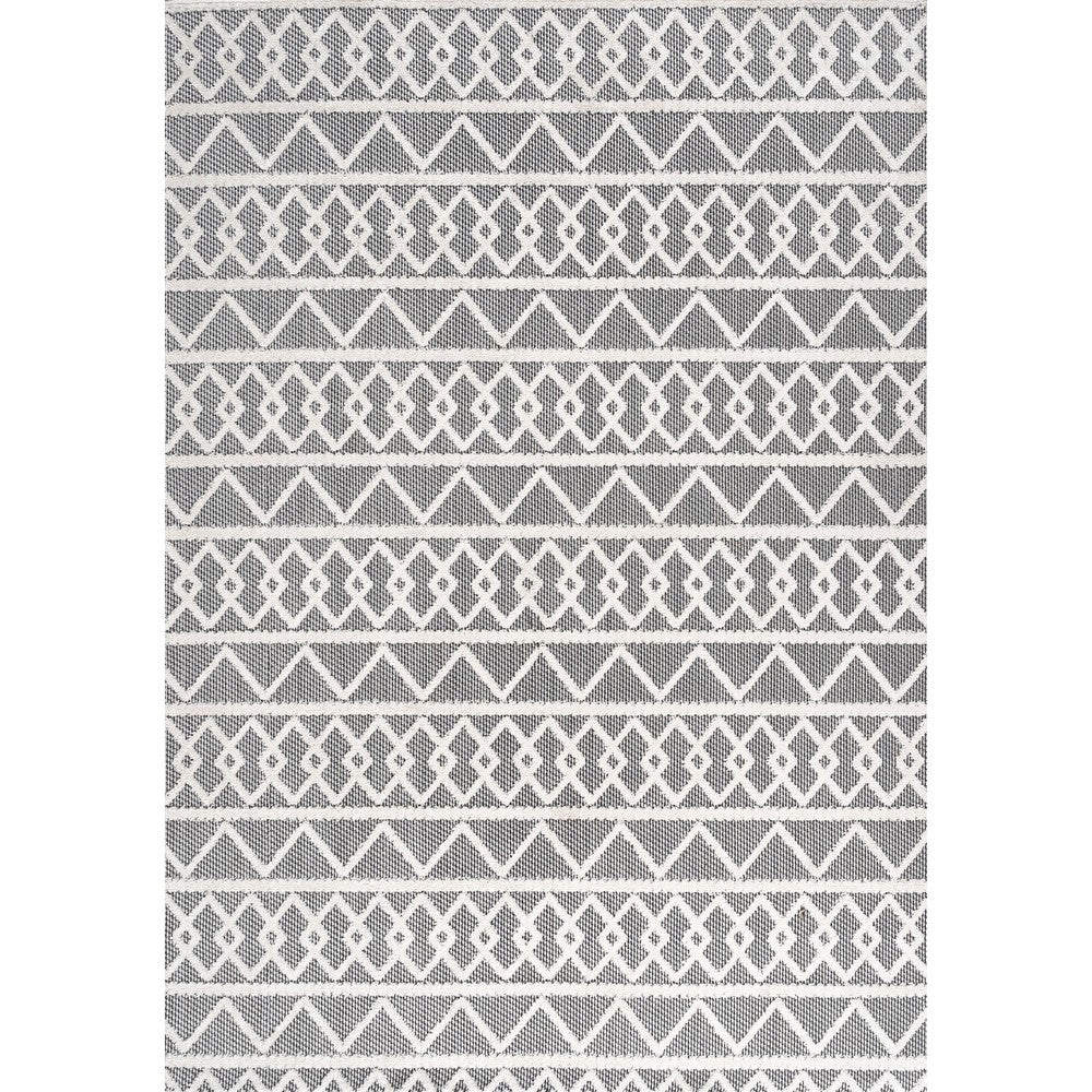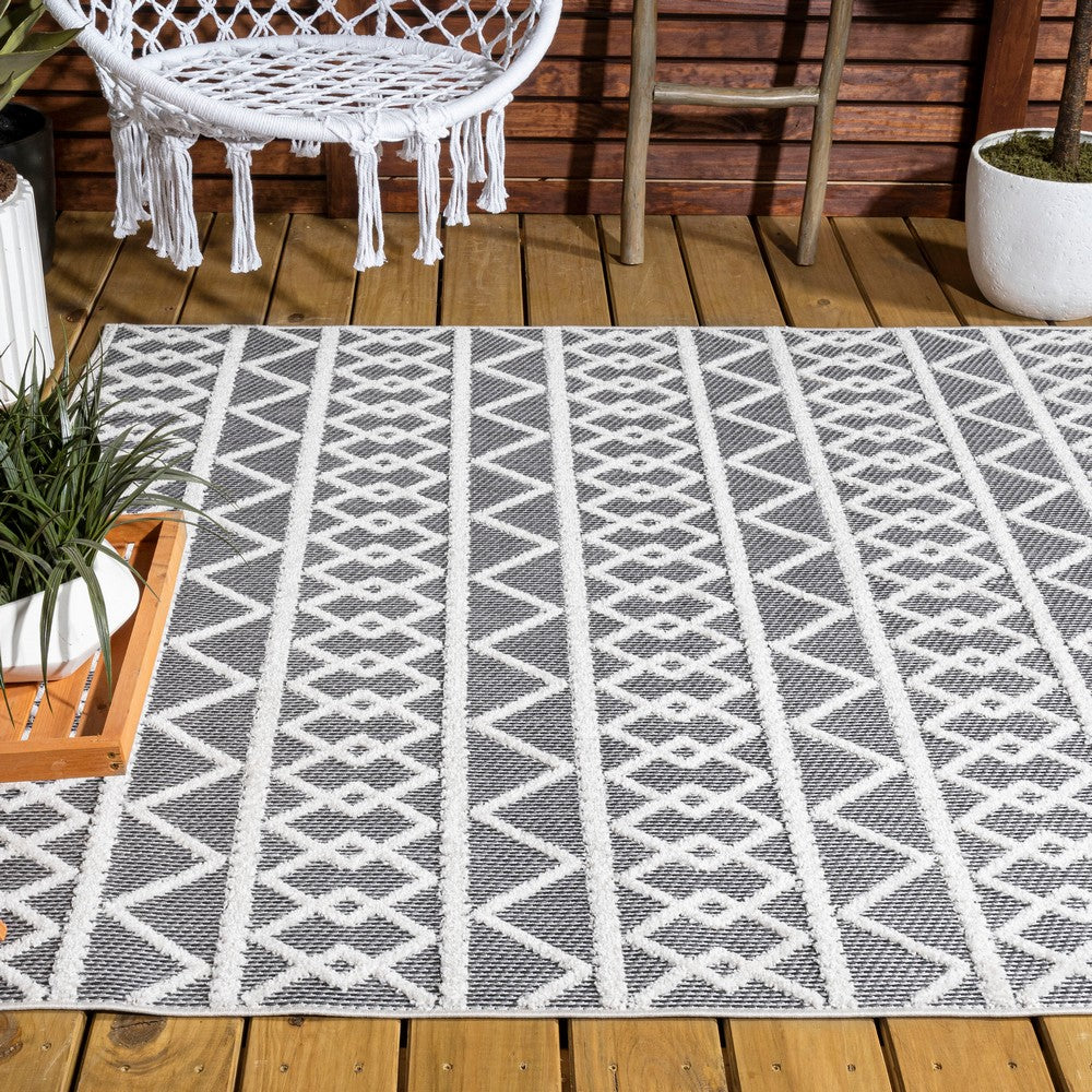 • The deep gray and ivory color scheme is a modern take on neutral geometric rugs