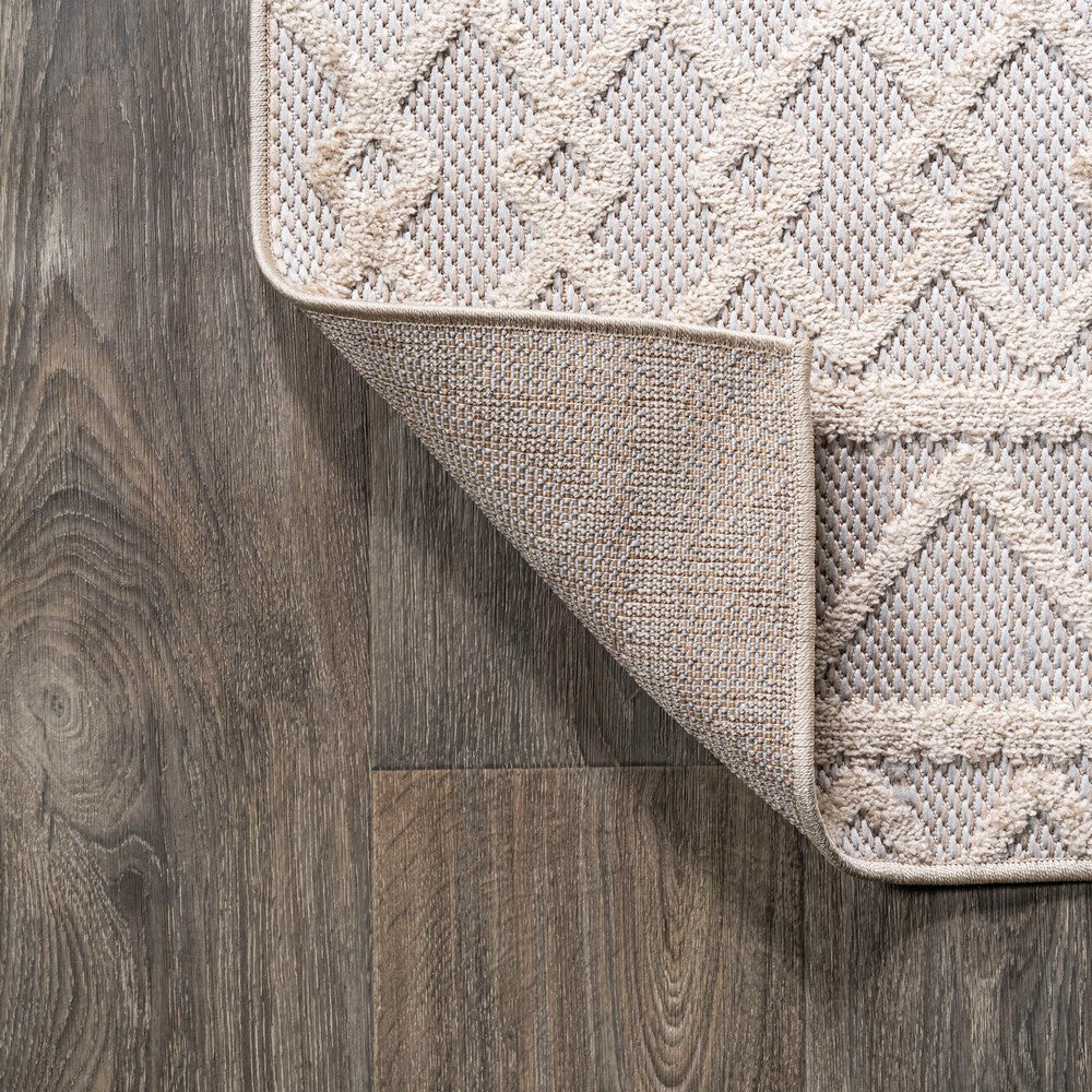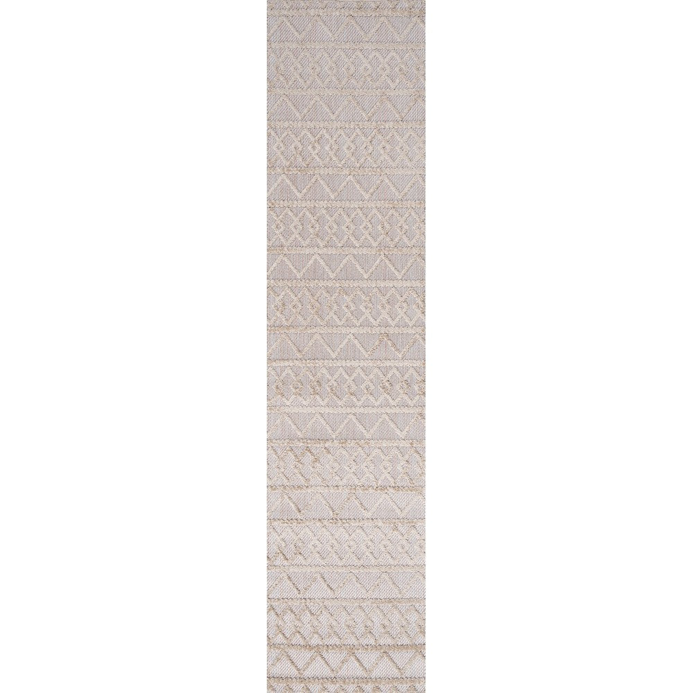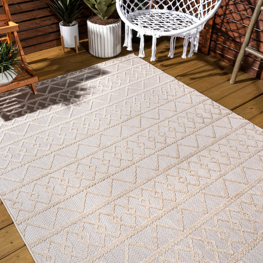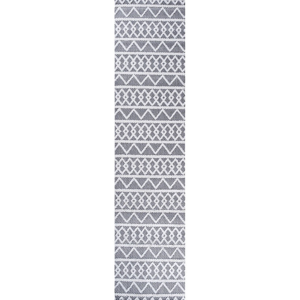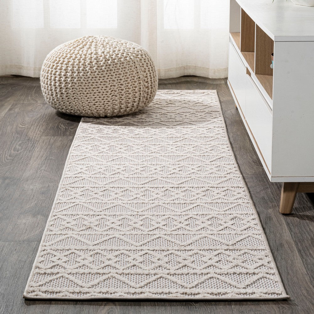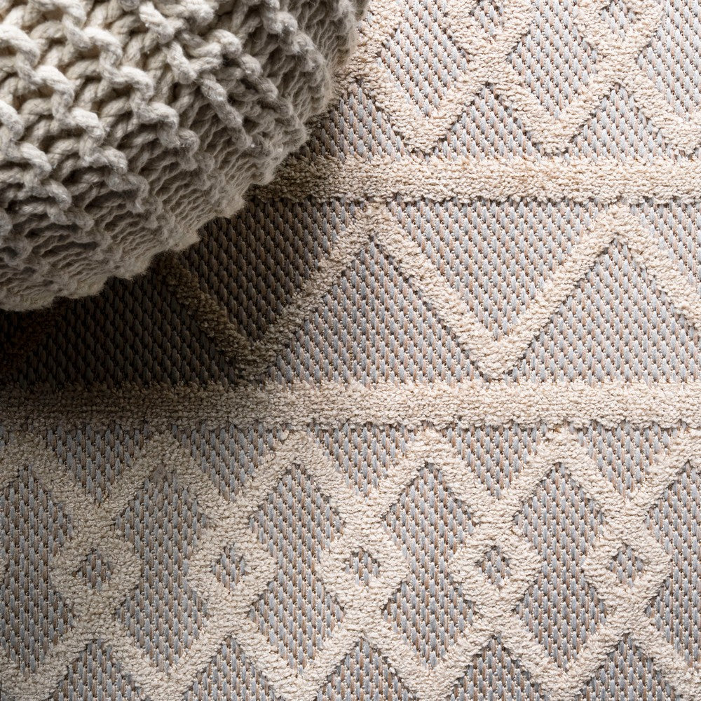 • The deep gray and ivory color scheme is a modern take on neutral geometric rugs