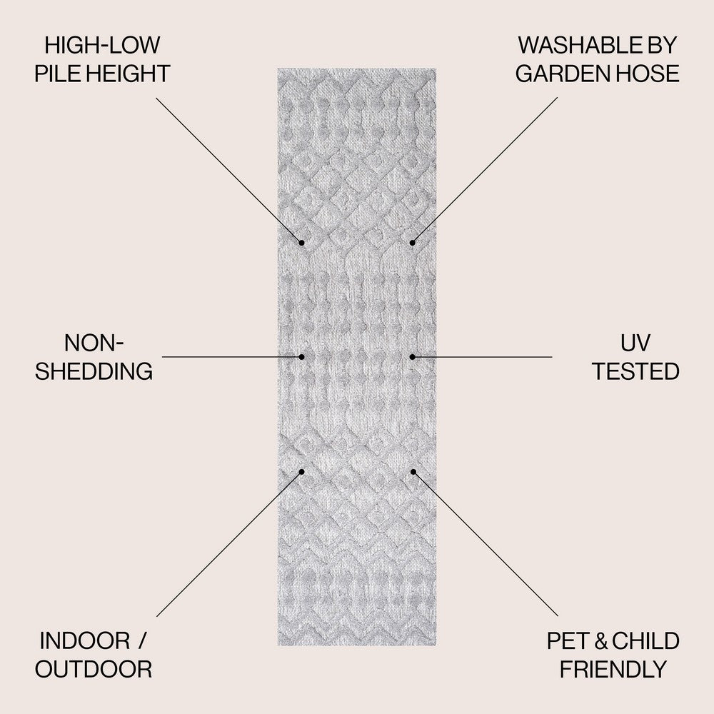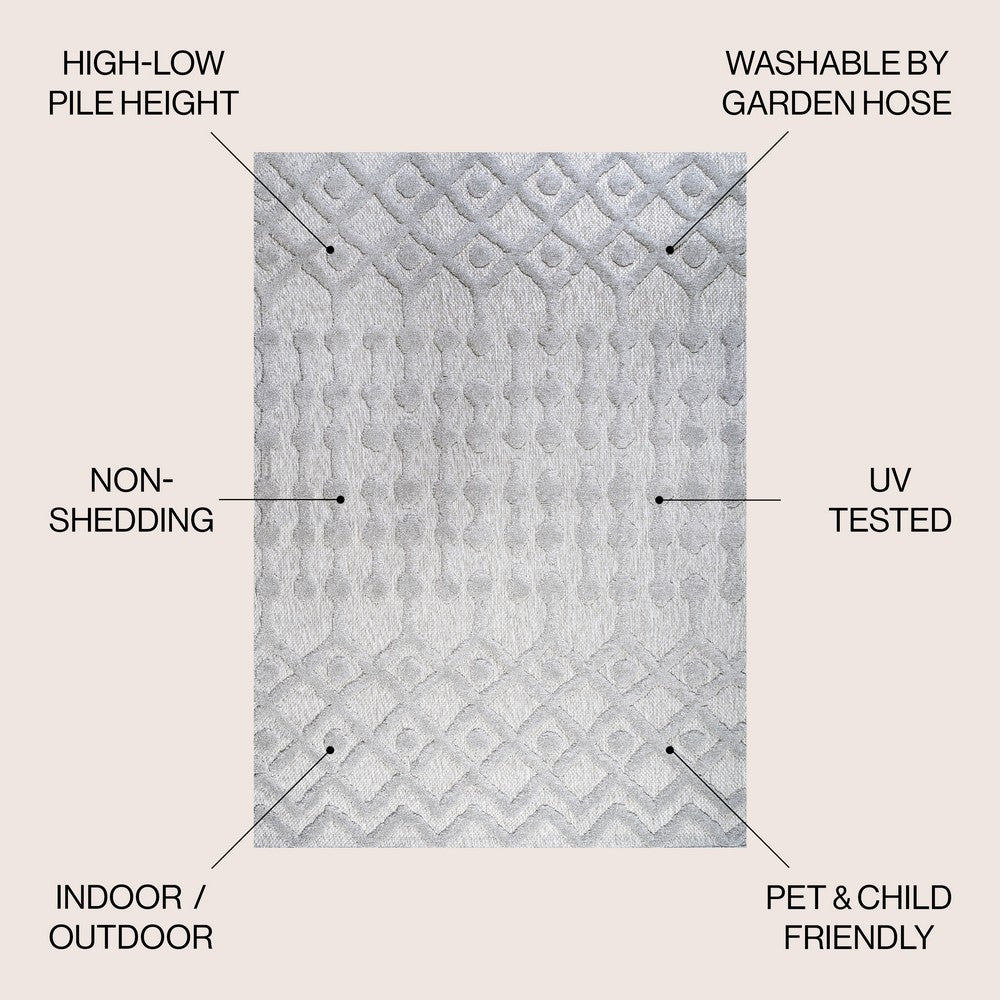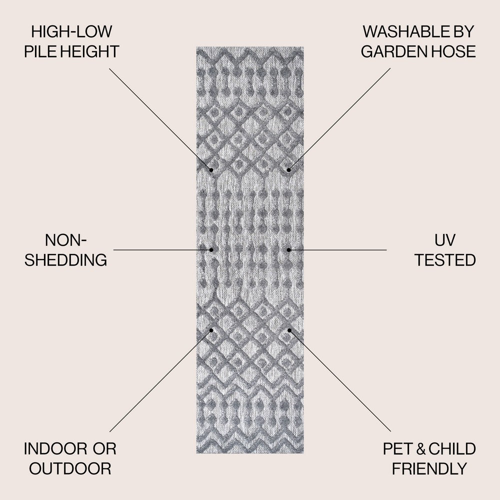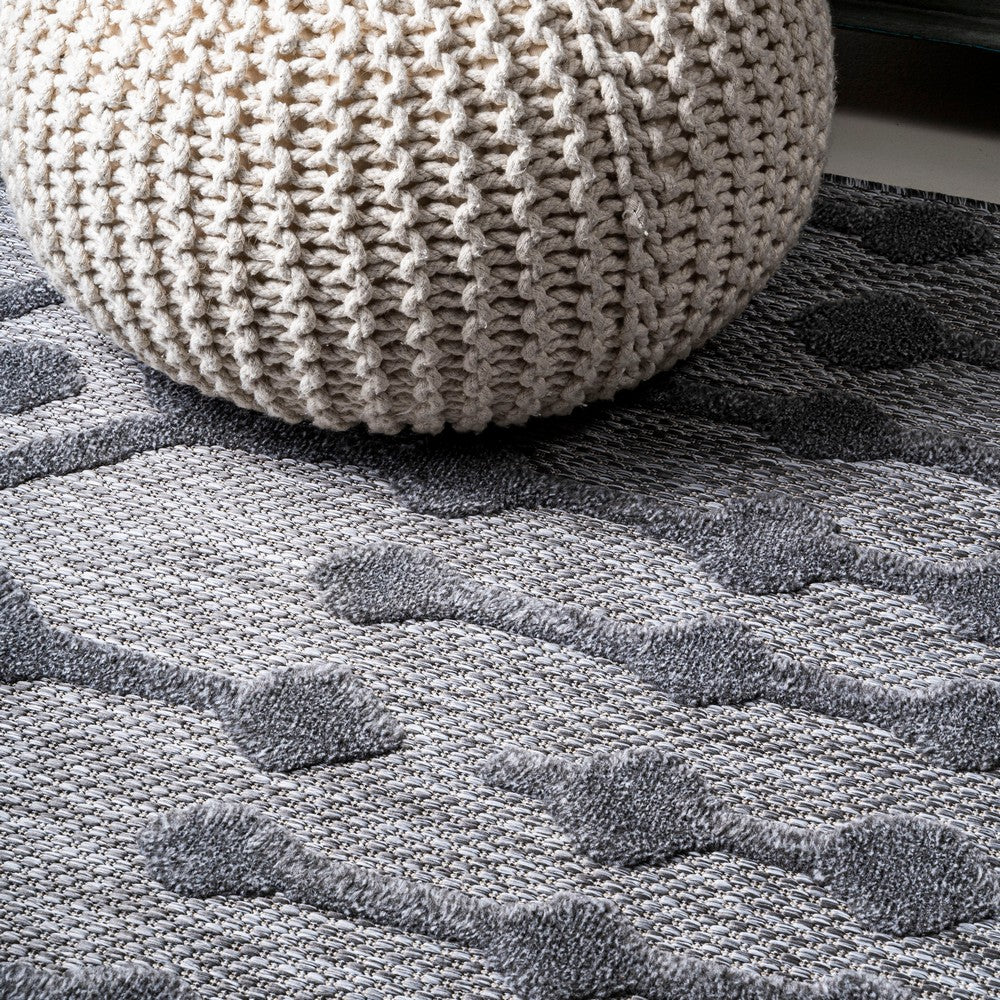 Inspired by vintage Moroccan rugs, our indoor/outdoor rug adds geometric pattern to your porch, patio or sunroom. The classic diamond and dot pattern has a modern twist, woven in shades of gray. Mingled threads give this rug a vintage vibe that's perfect for an entry, kitchen, hallway, living room or bedroom too. The pet-friendly and kid-proof low pile design makes it easy to clean, and perfect for the beach house.