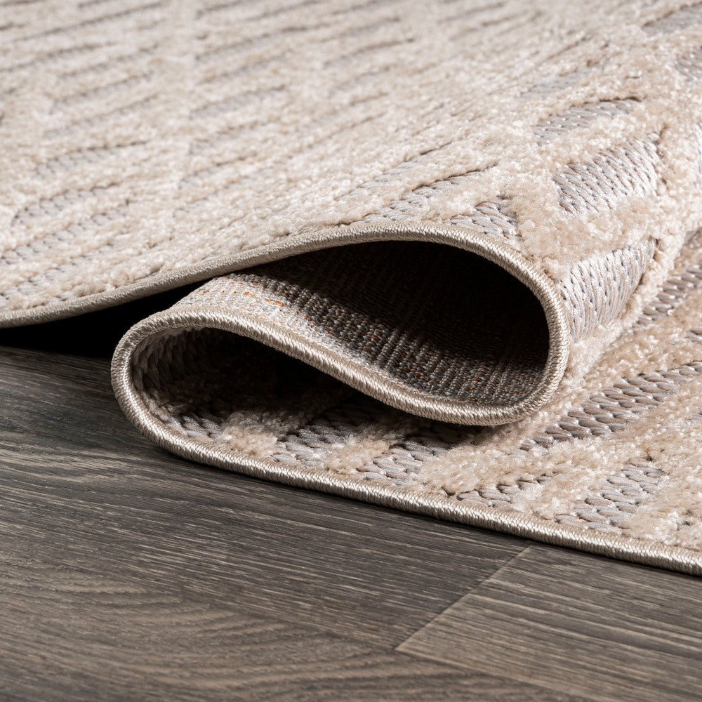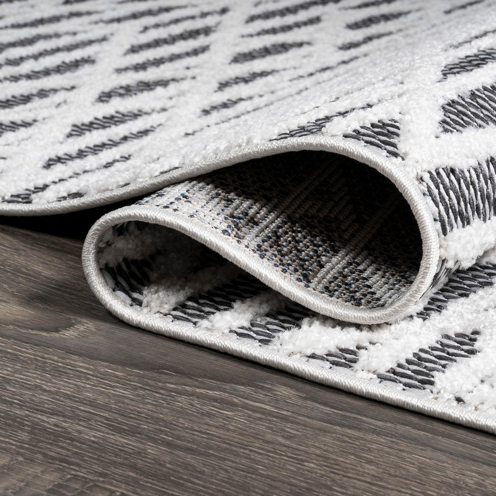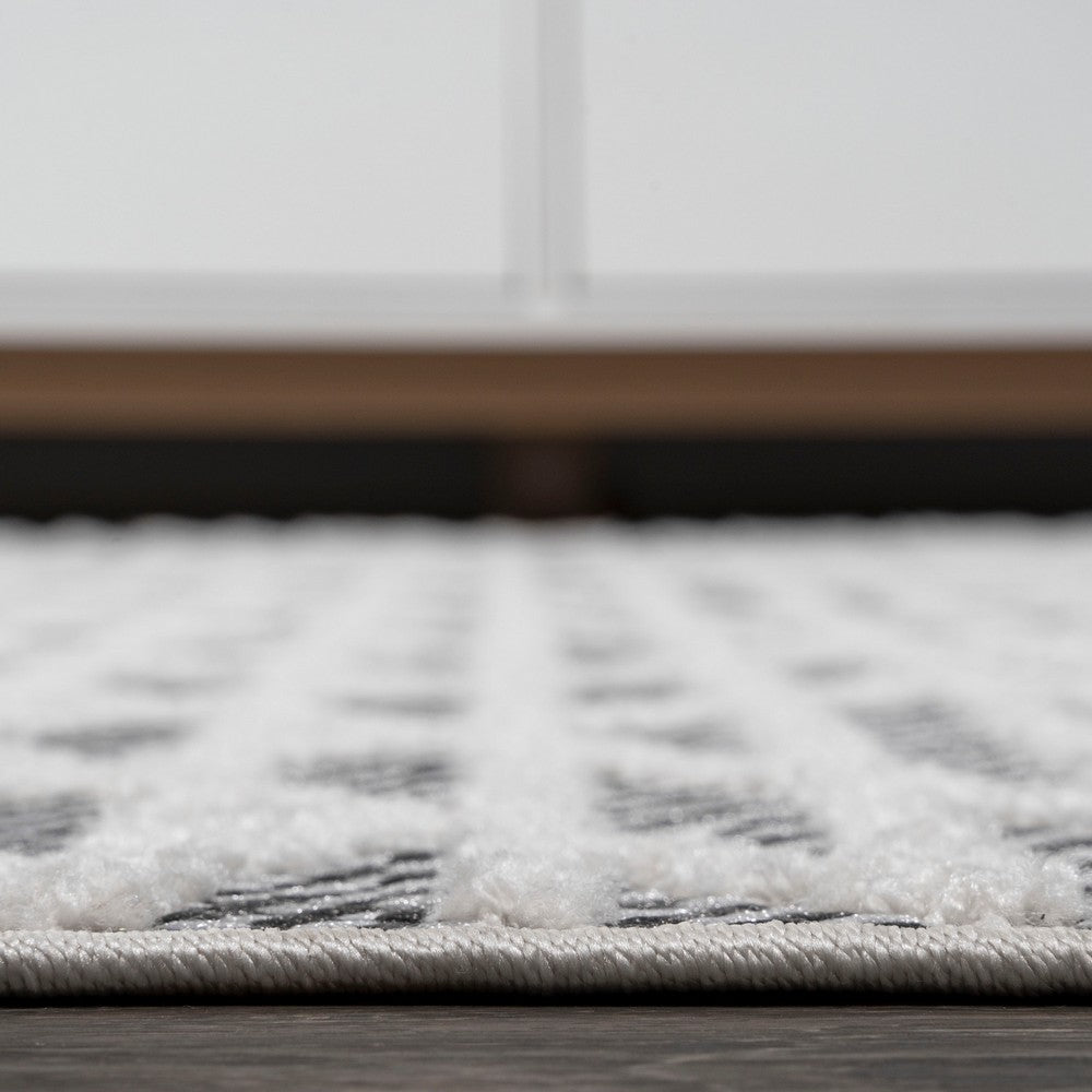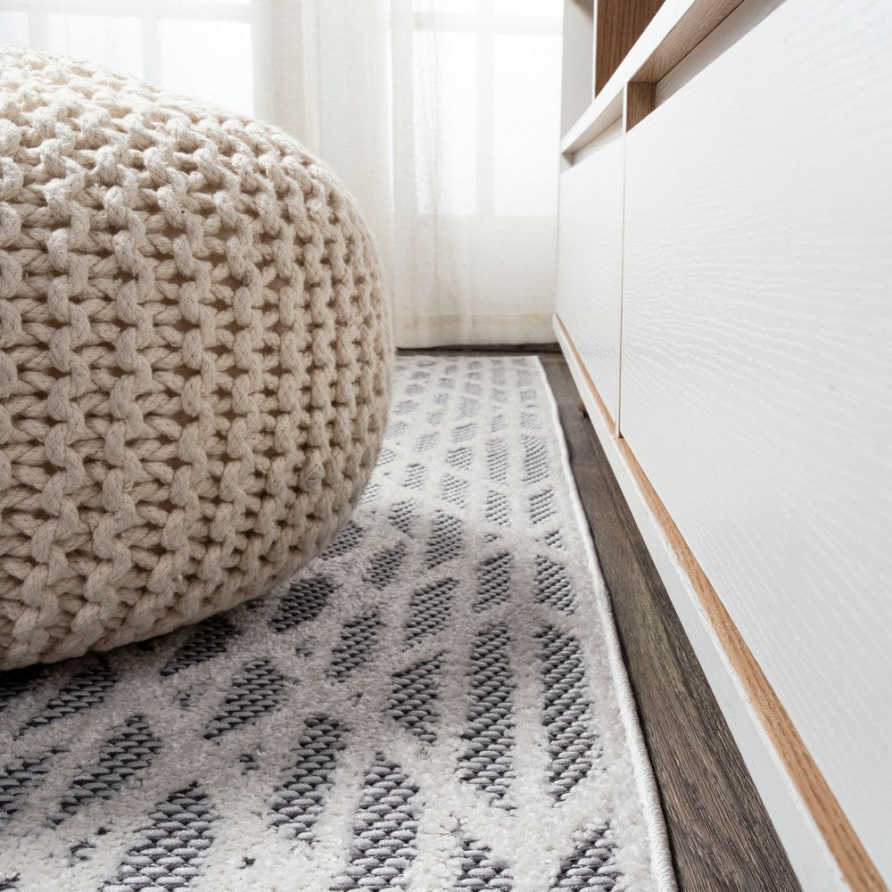 Inspired by vintage Moroccan tribal rugs, our modern version is power-loomed with a short pile. Rows of diamonds are woven in ivory on a neutral background. Add Bohemian style to your living room, dining room, entry or kitchen with this easy-care rug.