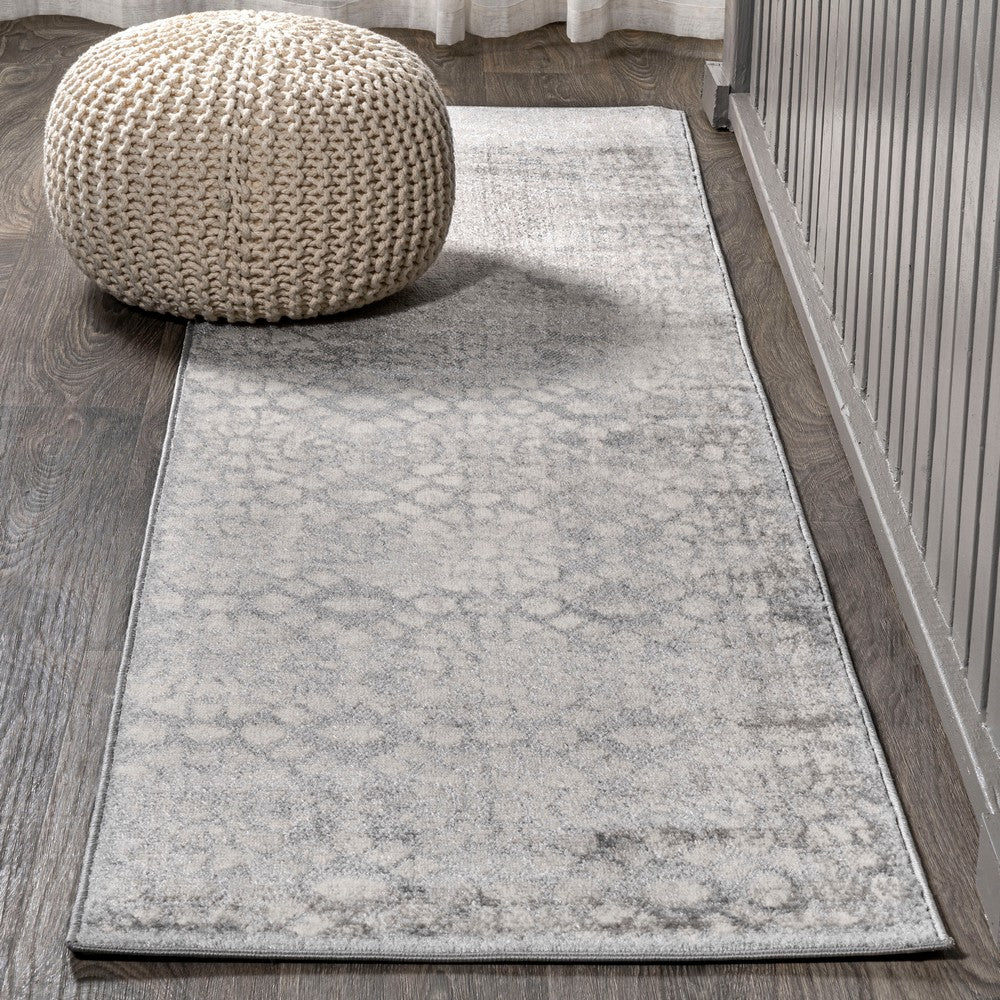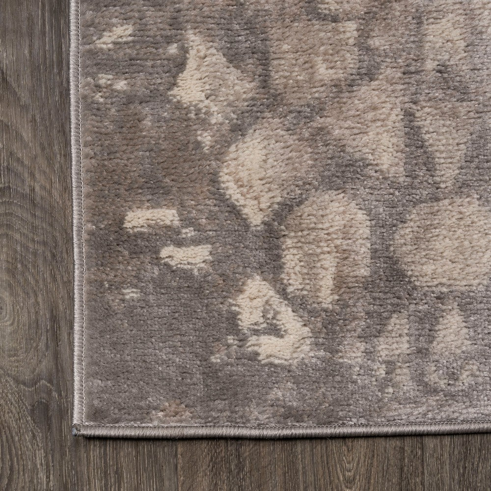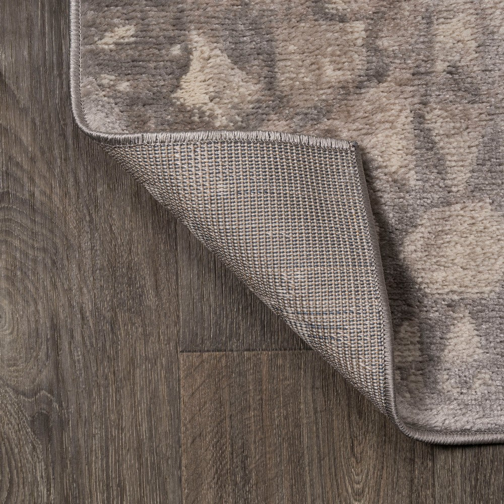 • Mingled shades of gray in the background give this rug a vintage texture; the pattern is woven in ivory