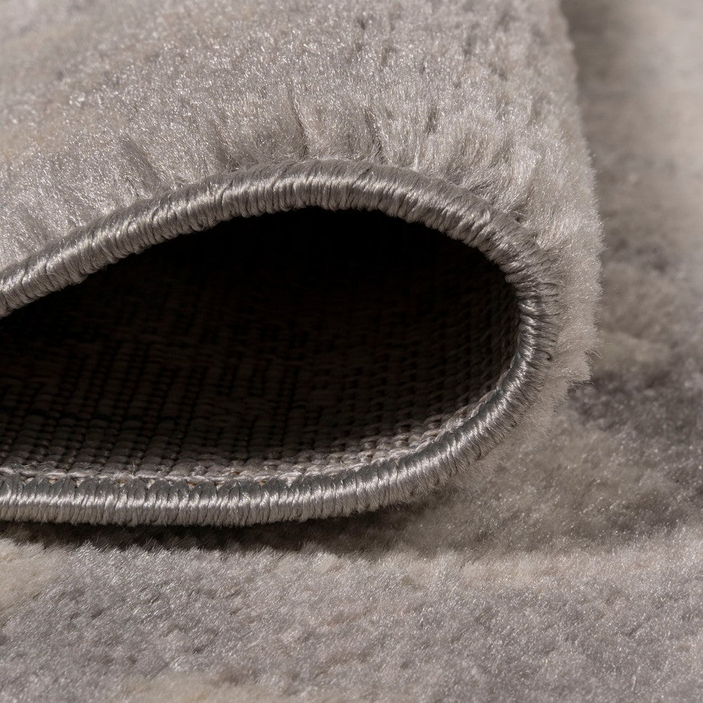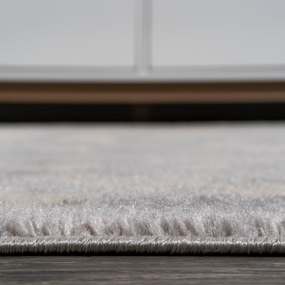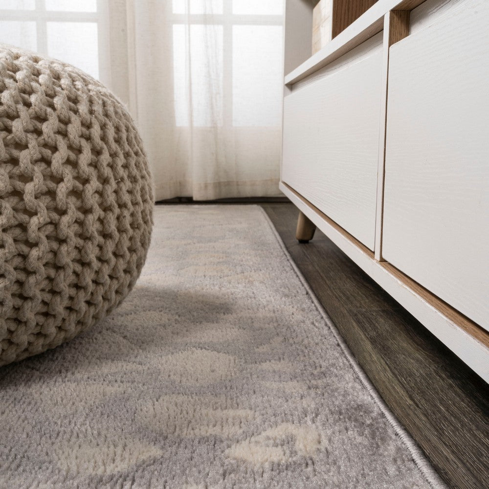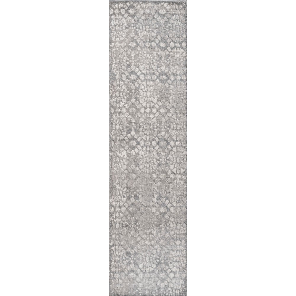 • Mingled shades of gray in the background give this rug a vintage texture; the pattern is woven in ivory