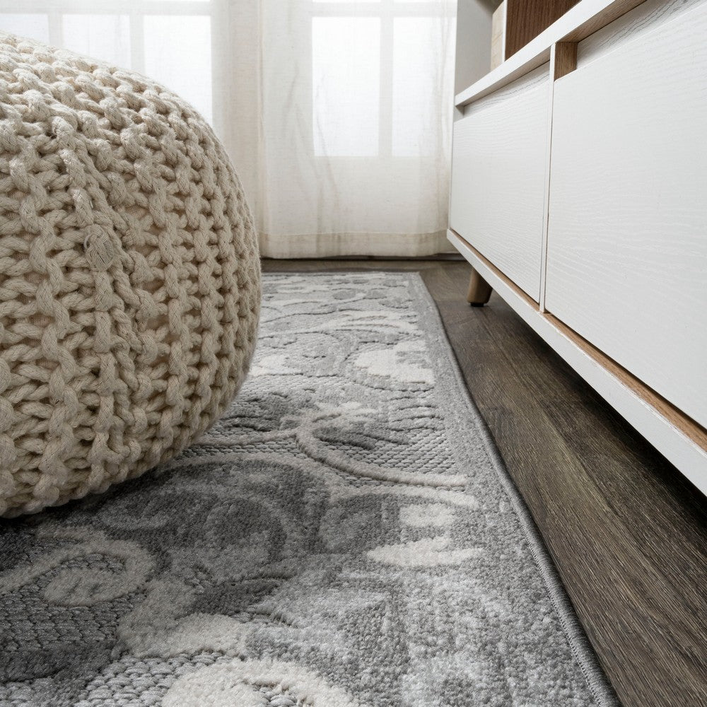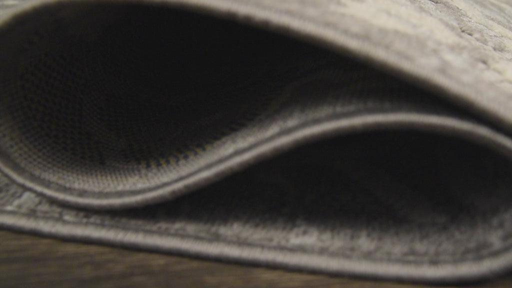 - Woven in shades of gray and ivory on a light gray ground