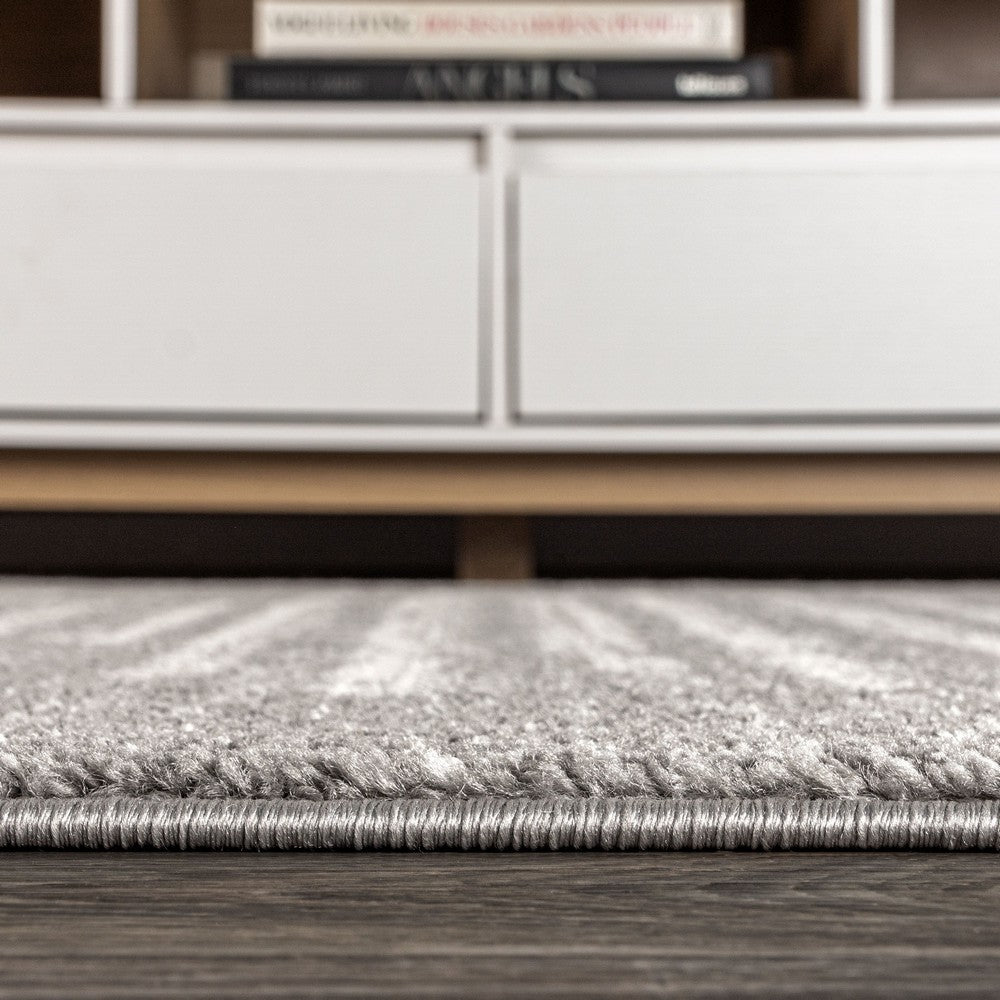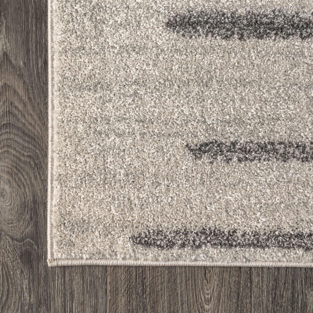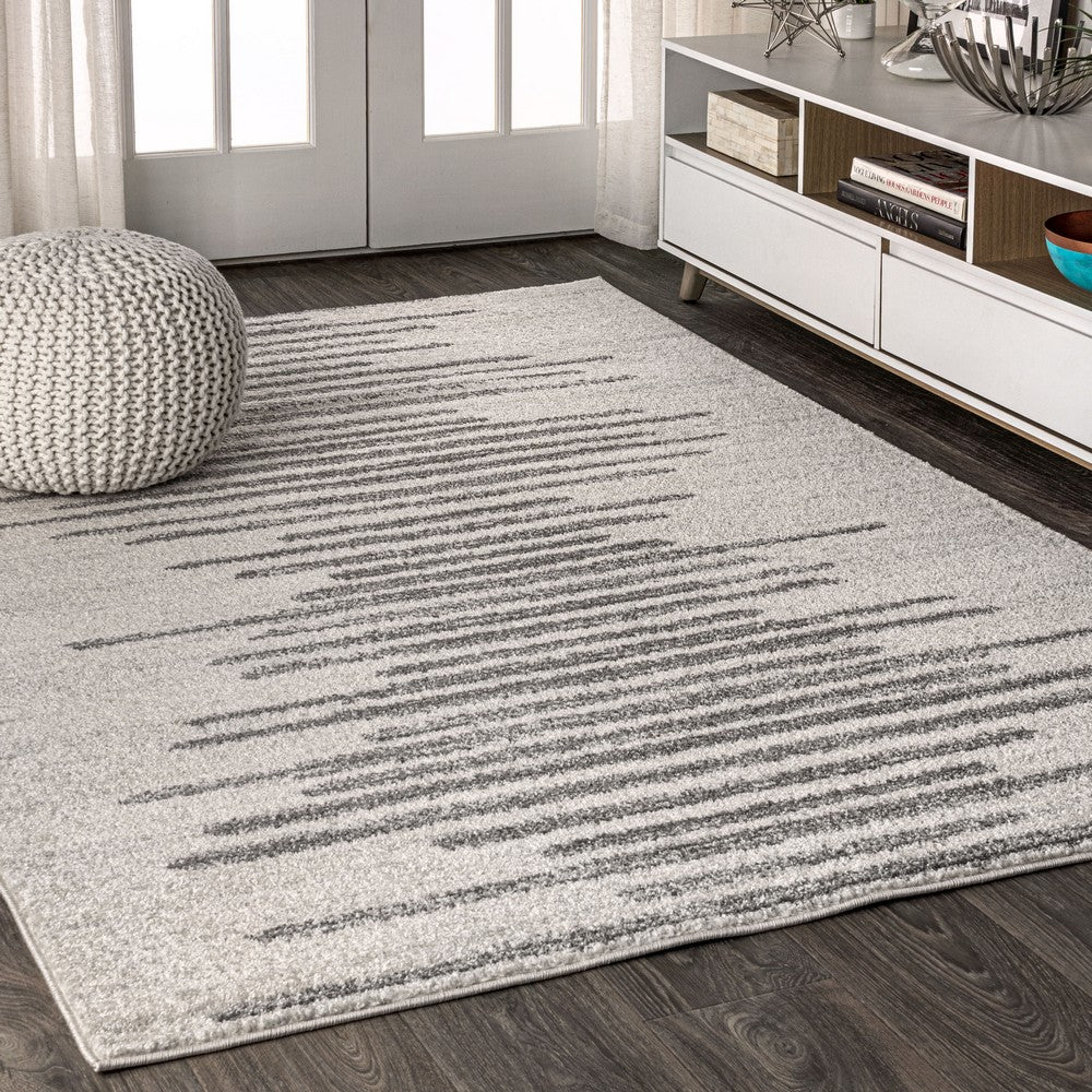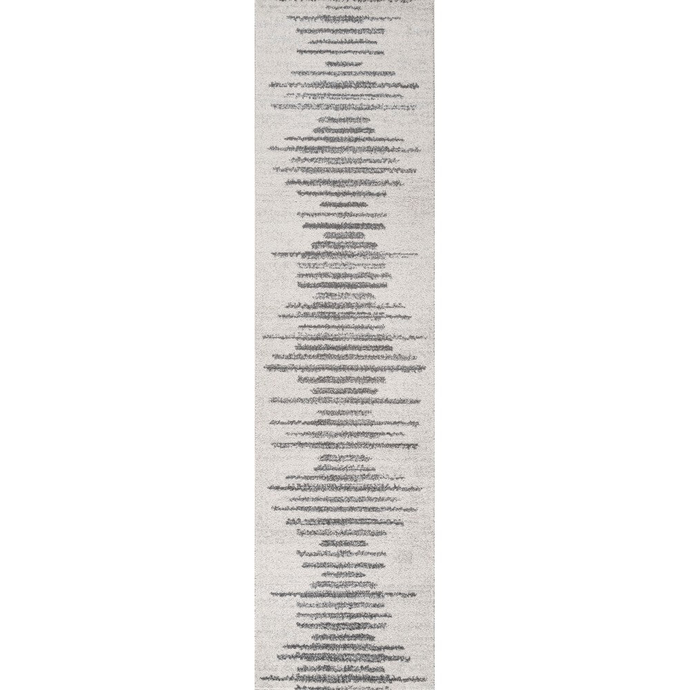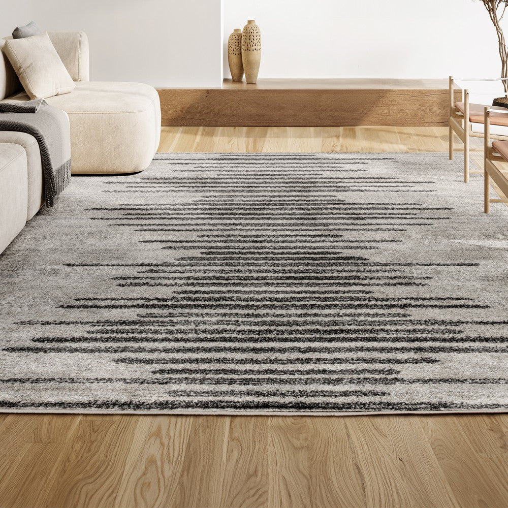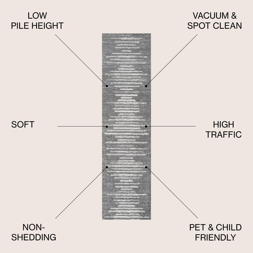 Inspired by vintage Moroccan rugs, our modern striped rug is power-loomed with a short pile. The central stripe pattern is woven in gray on an ivory background; the mingled threads recall traditional handwoven rugs. Add some Bohemian style to your home with this easy-care rug.