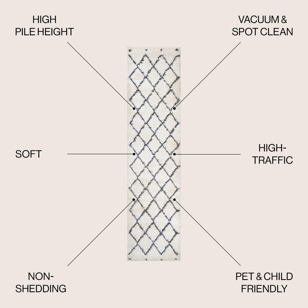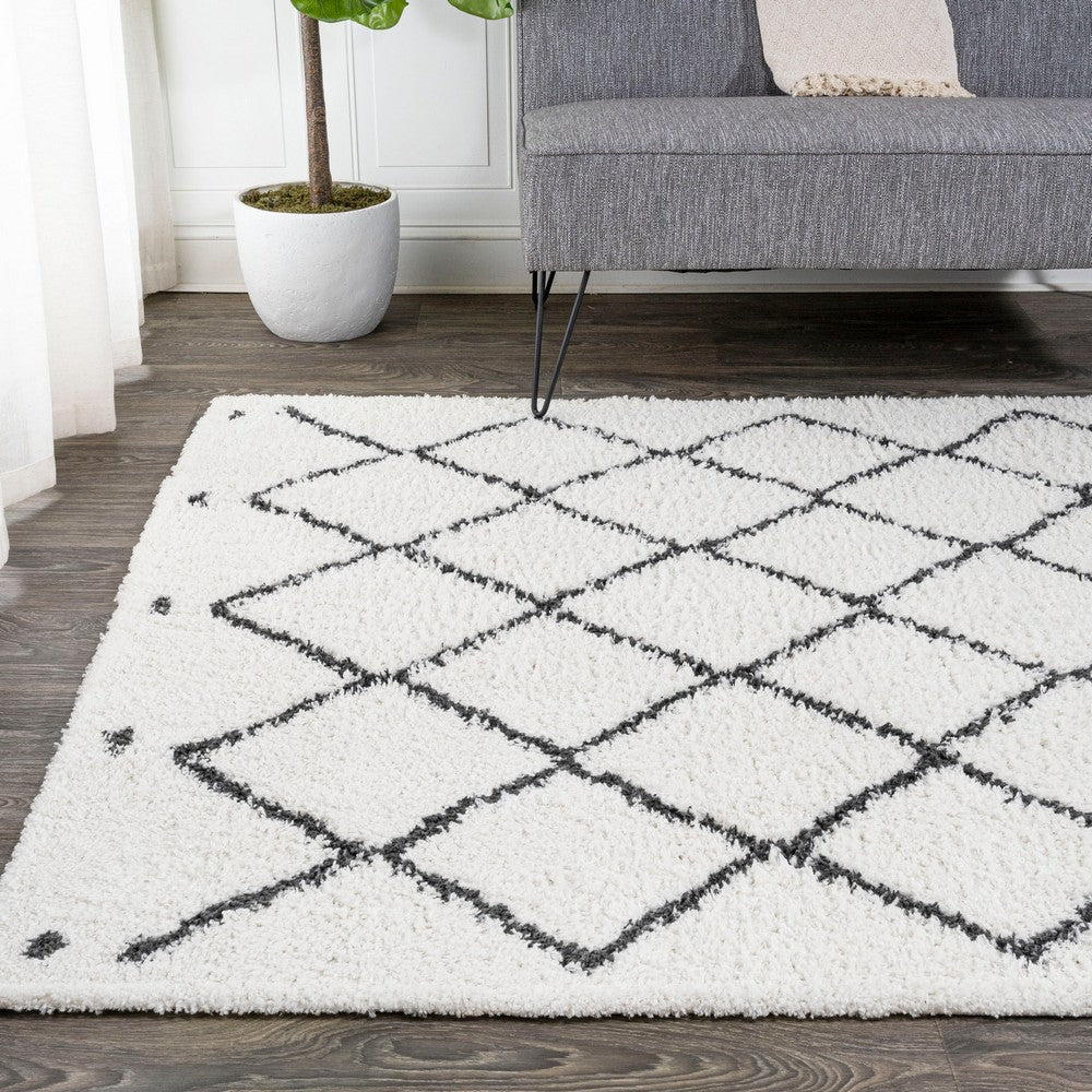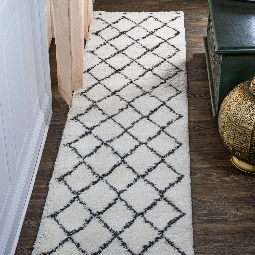 Inspired by vintage Beni Ourain Moroccan rugs, our soft and fluffy shag yarns make it easy to go barefoot. The classic Moroccan pattern has deep black diamonds on a field of ivory. Anchor your Bohemian space; add softness to a bedroom, living room, or cozy reading nook; this is a low-pile shag rug with timeless style.