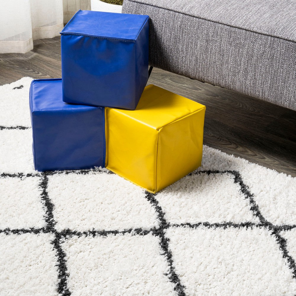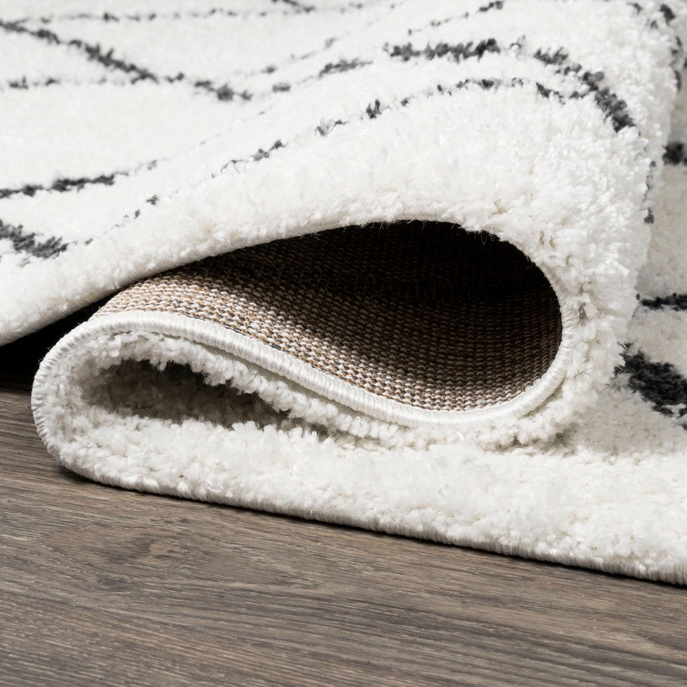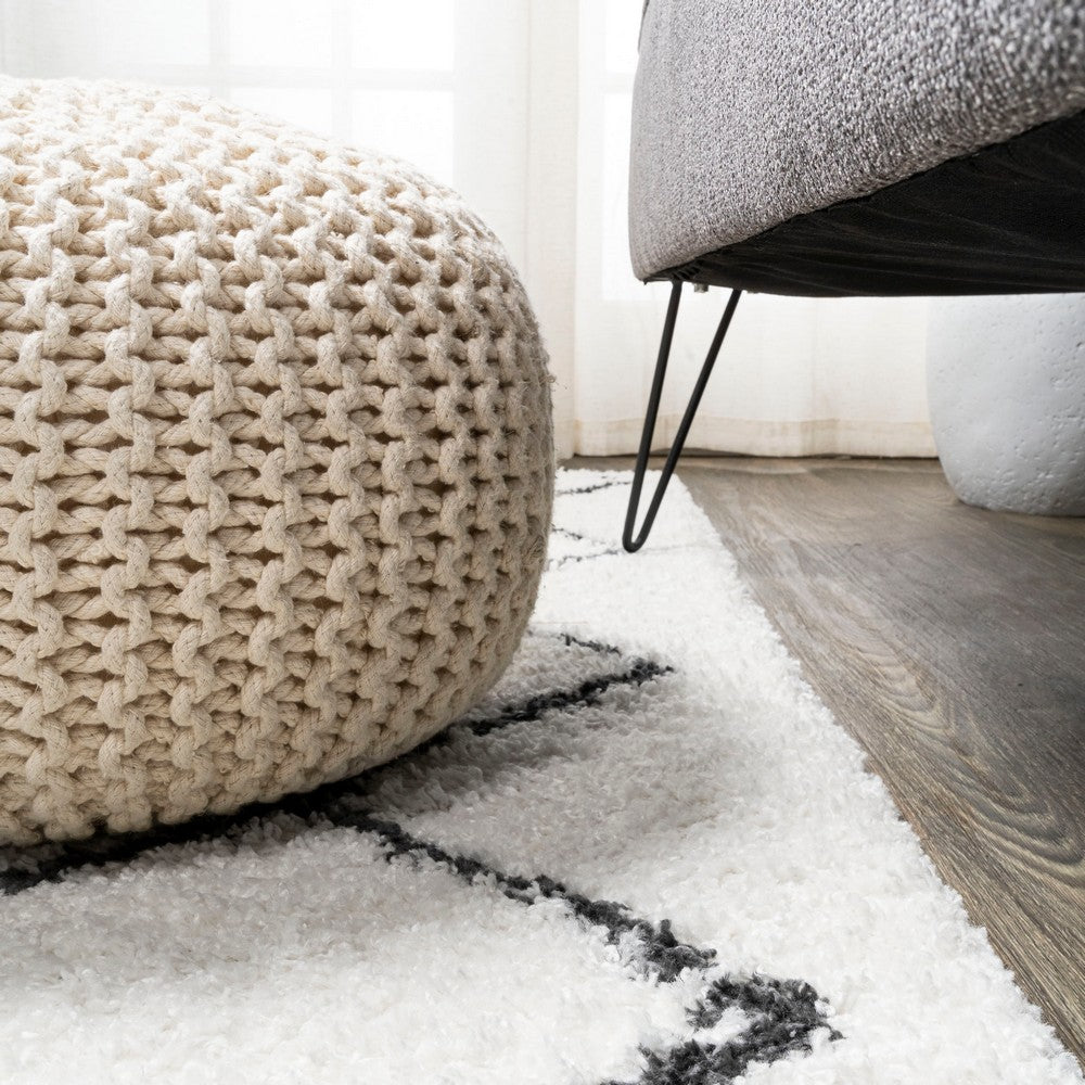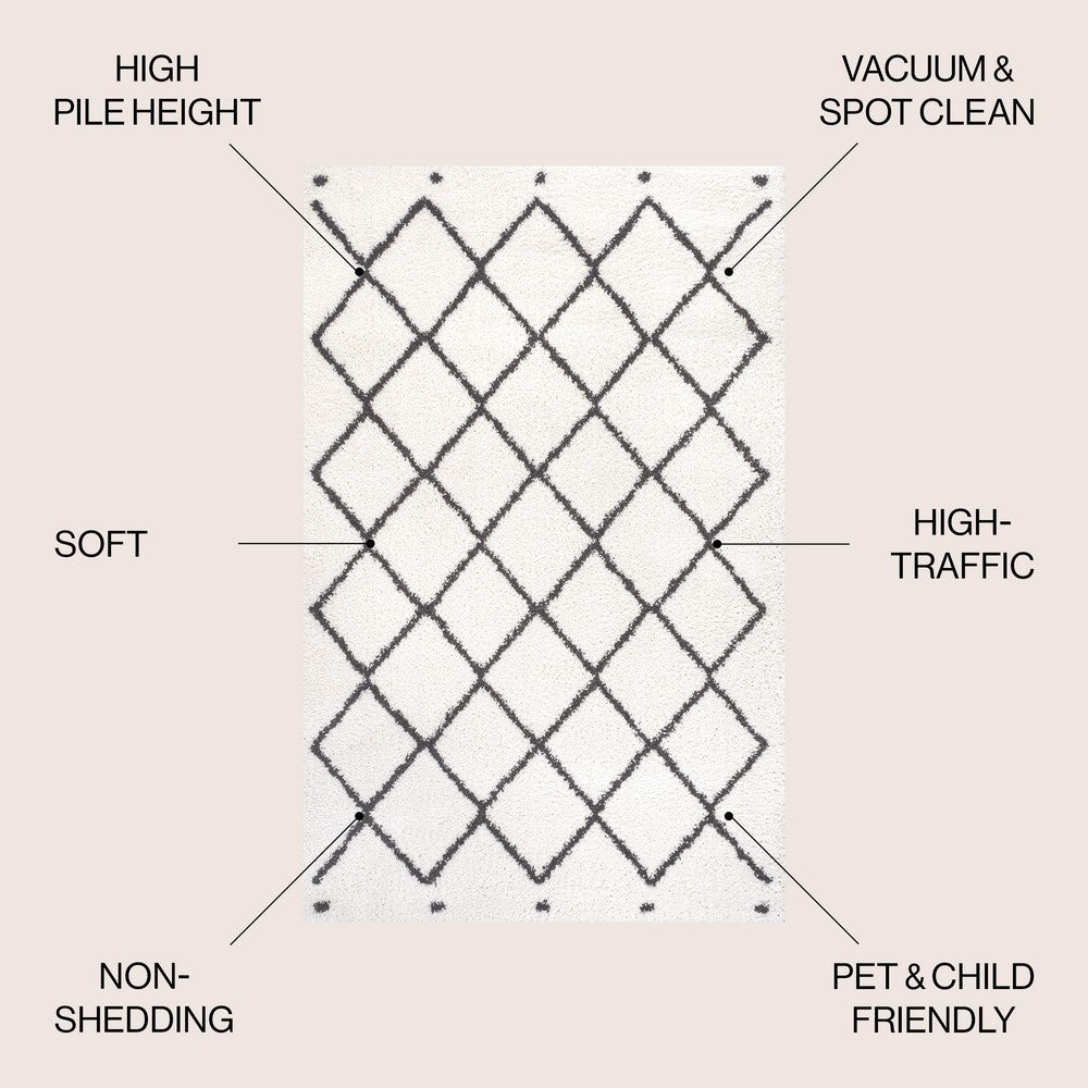Inspired by vintage Beni Ourain Moroccan rugs, our soft and fluffy shag yarns make it easy to go barefoot. The classic Moroccan pattern has deep black diamonds on a field of ivory. Anchor your Bohemian space; add softness to a bedroom, living room, or cozy reading nook; this is a low-pile shag rug with timeless style.