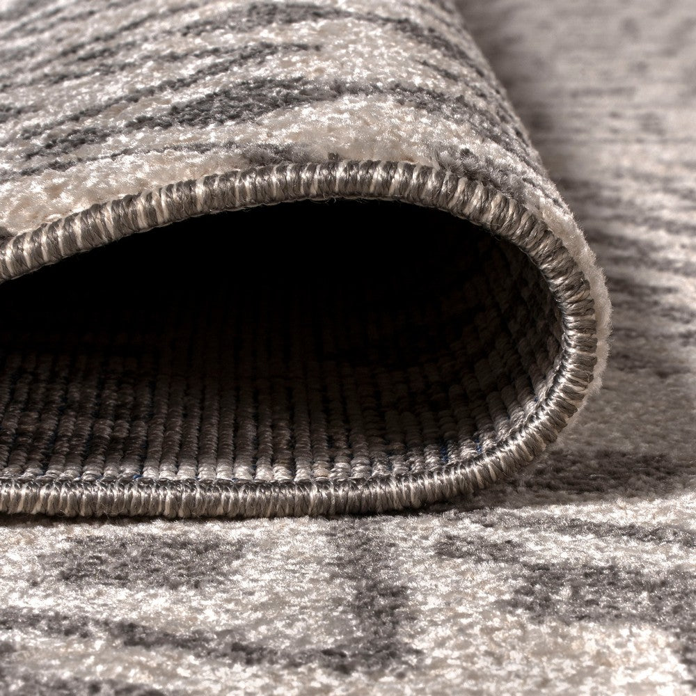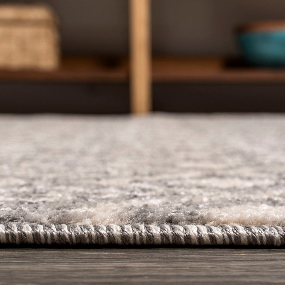 • A mingled weave of medium and light gray fibers in the background give this rug extra dimension; the pattern is woven in ivory